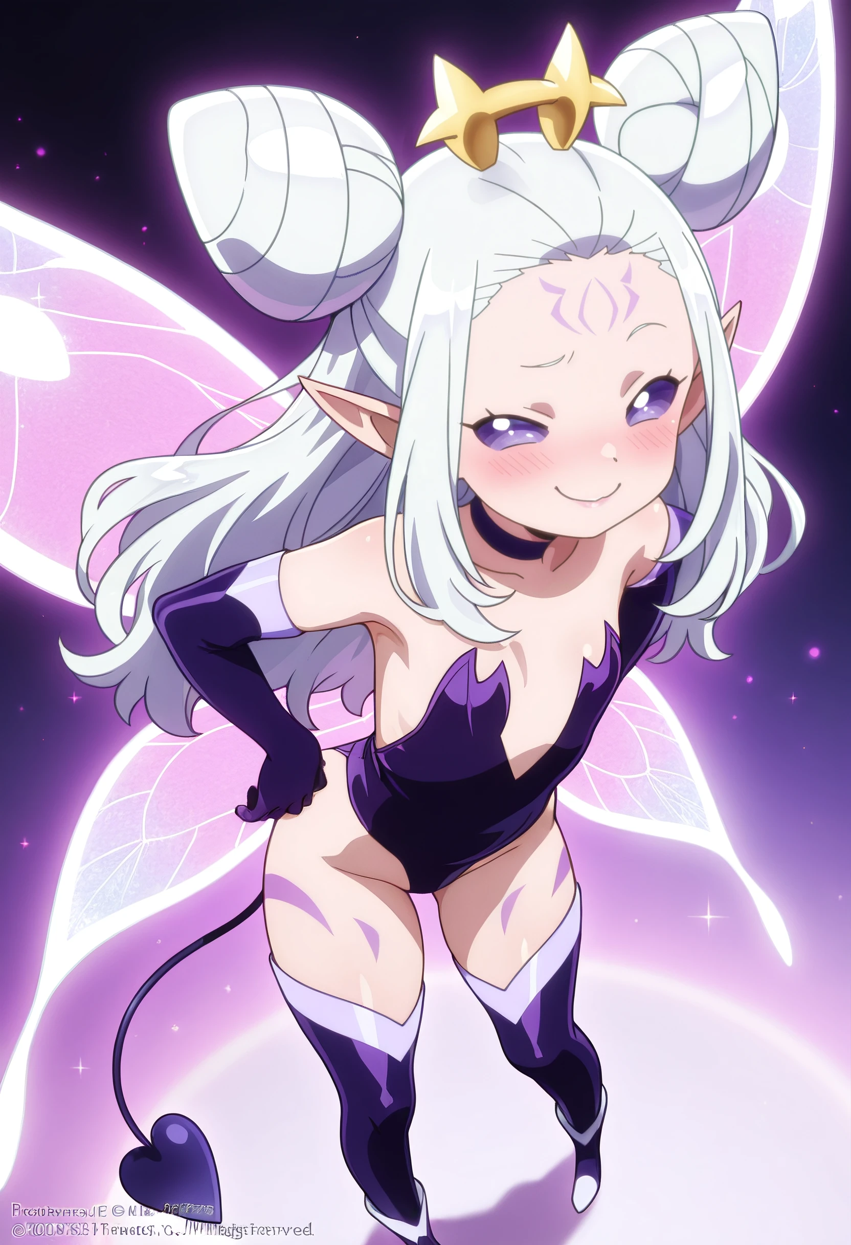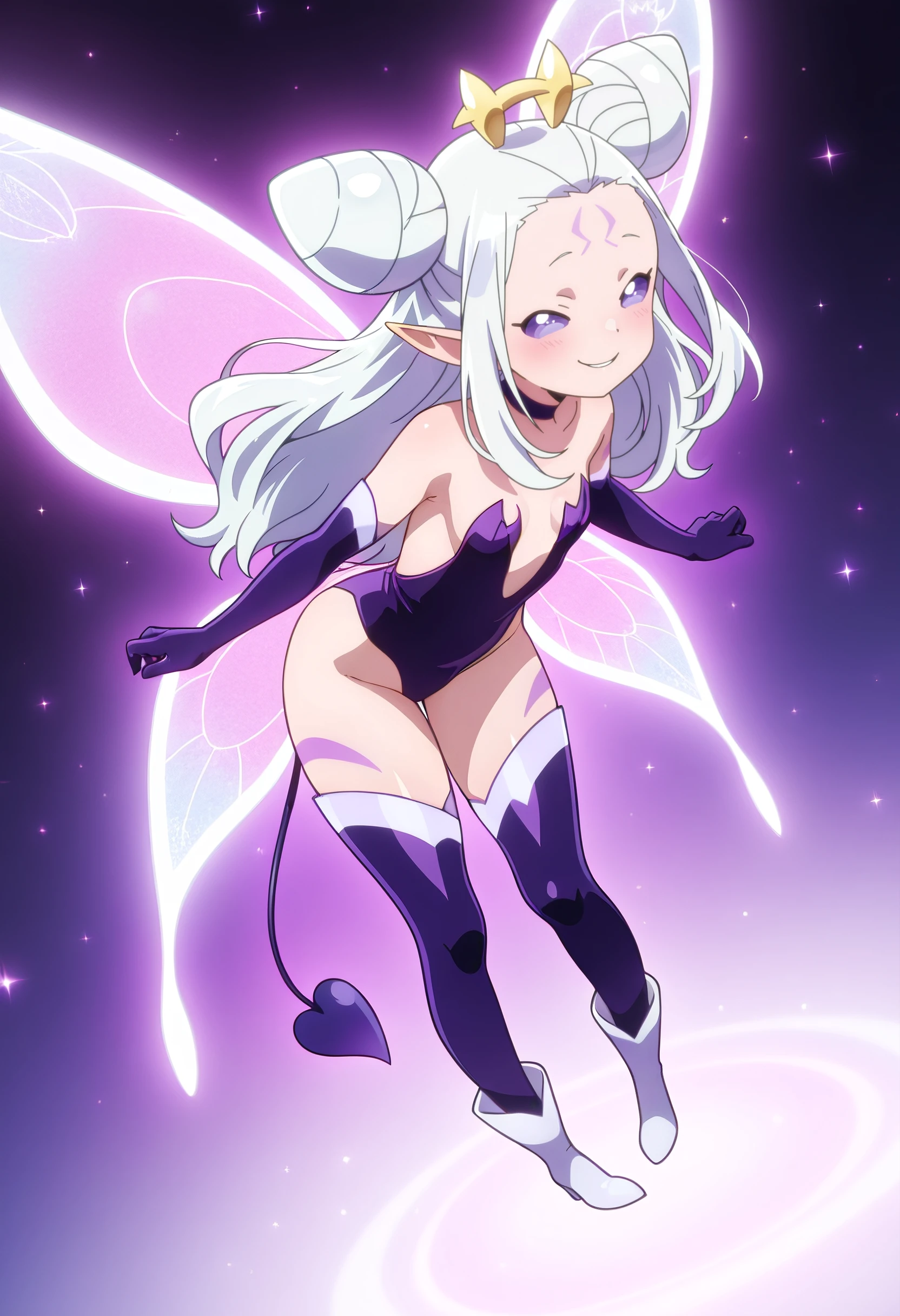 KMaPixie, white hair, double bun, long hair, pointy ears, hair bun, tail, demon tail, facial mark, cone hair bun, colored sclera, solid eyes, purple eyes, forehead mark, crescent facial mark,