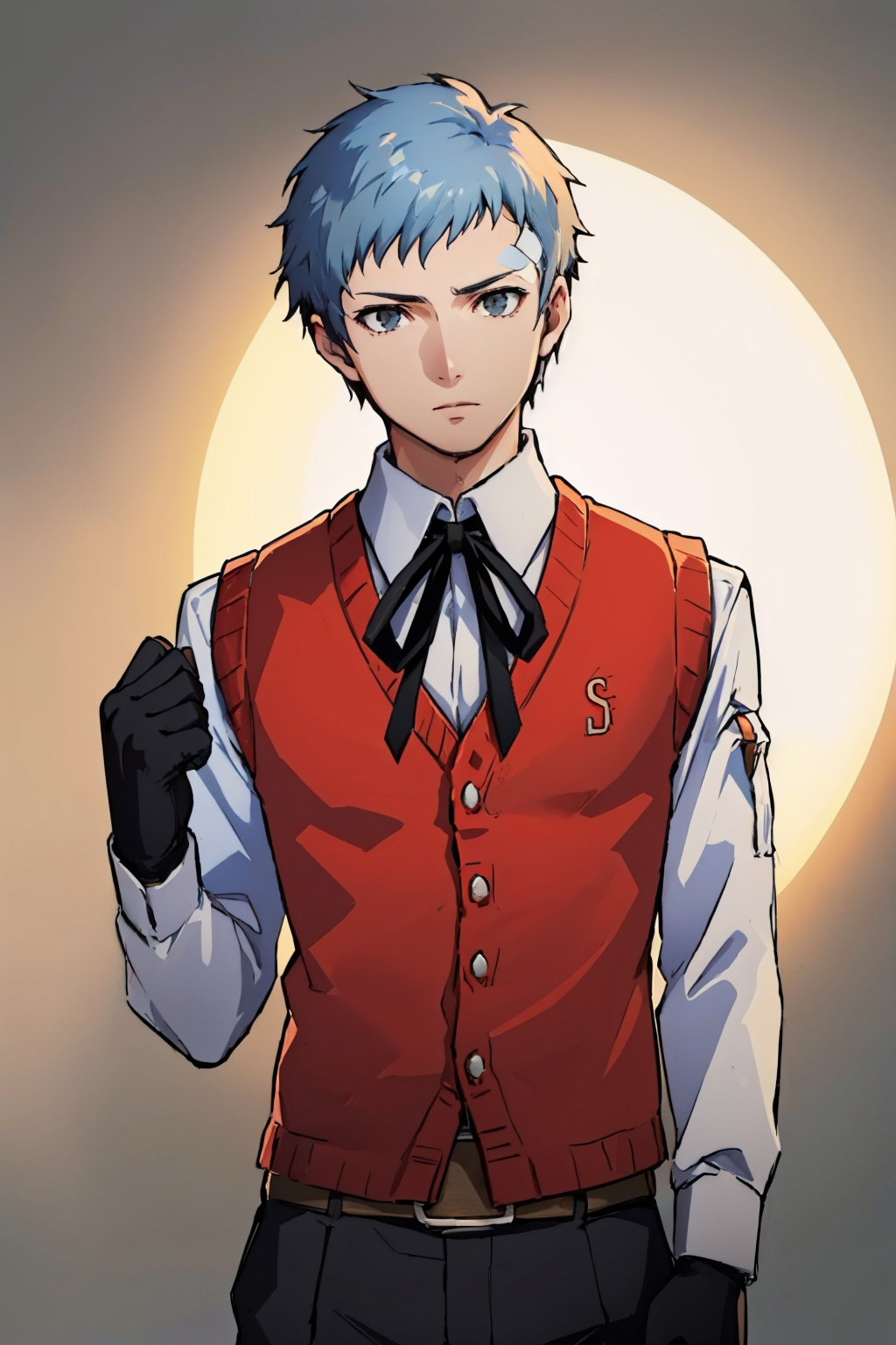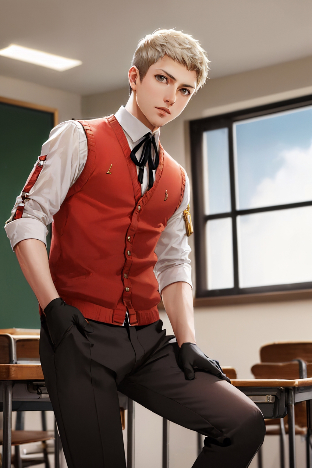 Default Outfit: school uniform, red vest, sweater vest, neck ribbon, black gloves, black pants