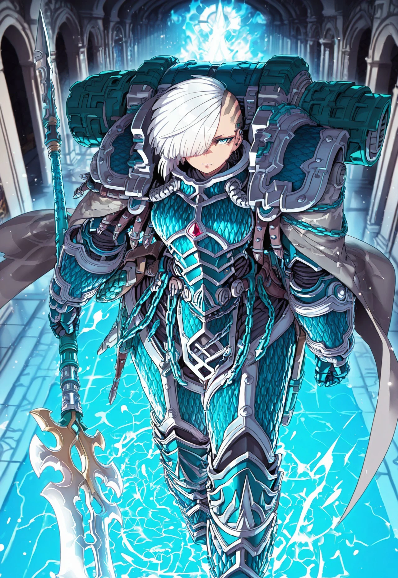 Armor: teal power armour, breastplate, shoulder pads, gauntlets, cape,