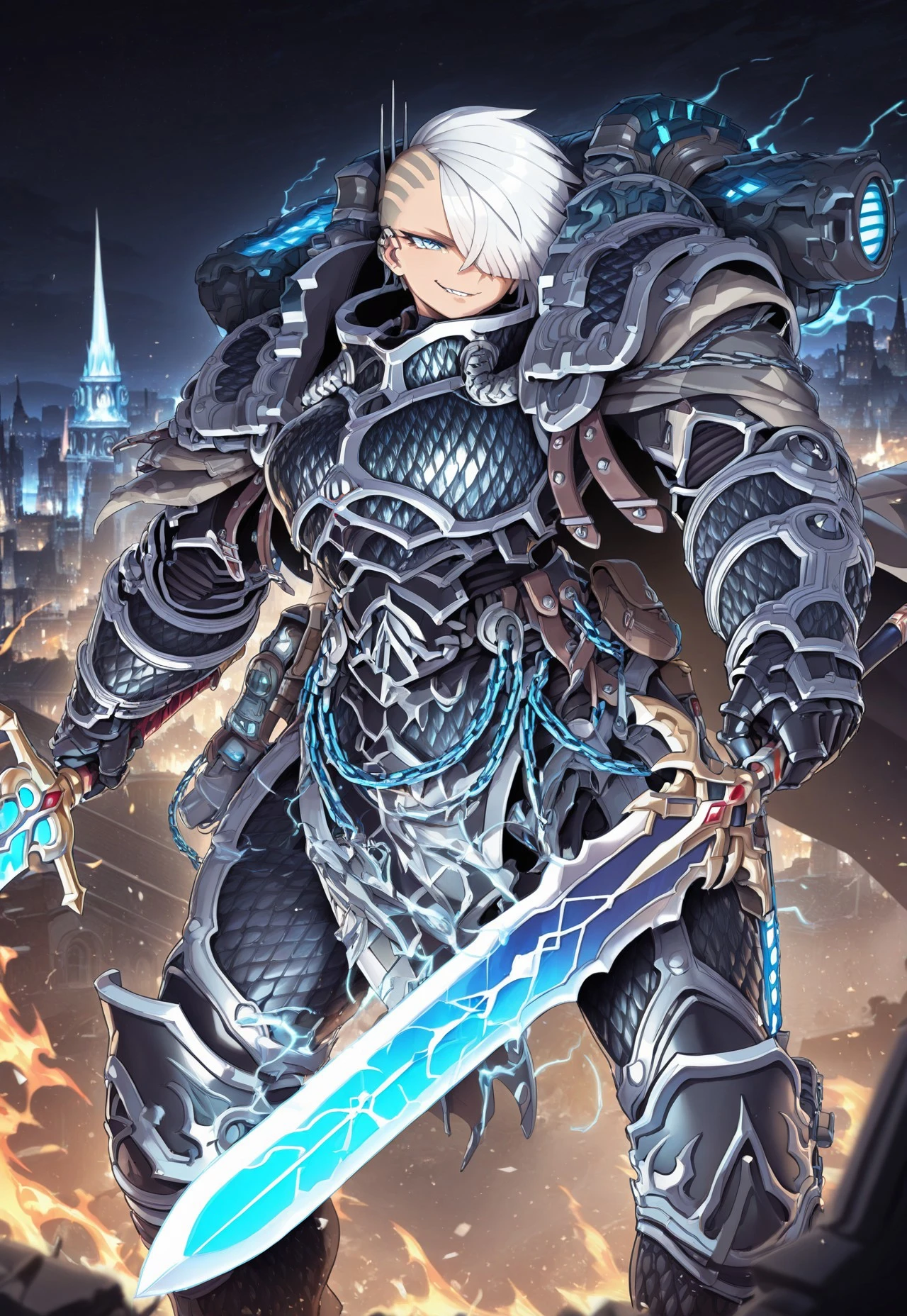 Alpharius, left asymmetrical hair, hair over eye, short hair, white hair, blue eyes,