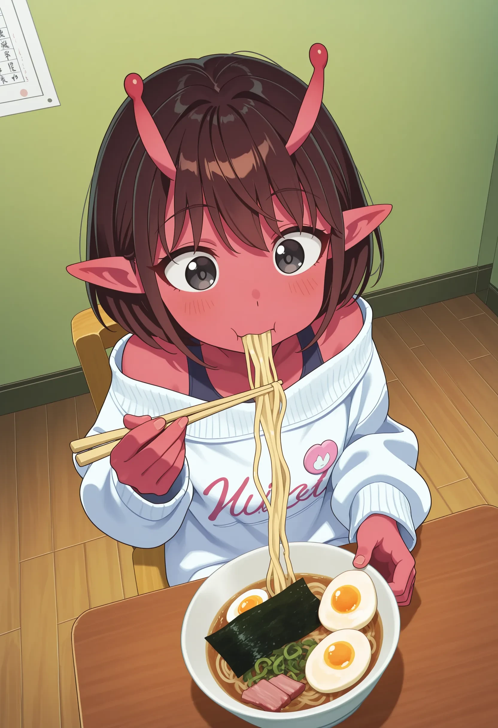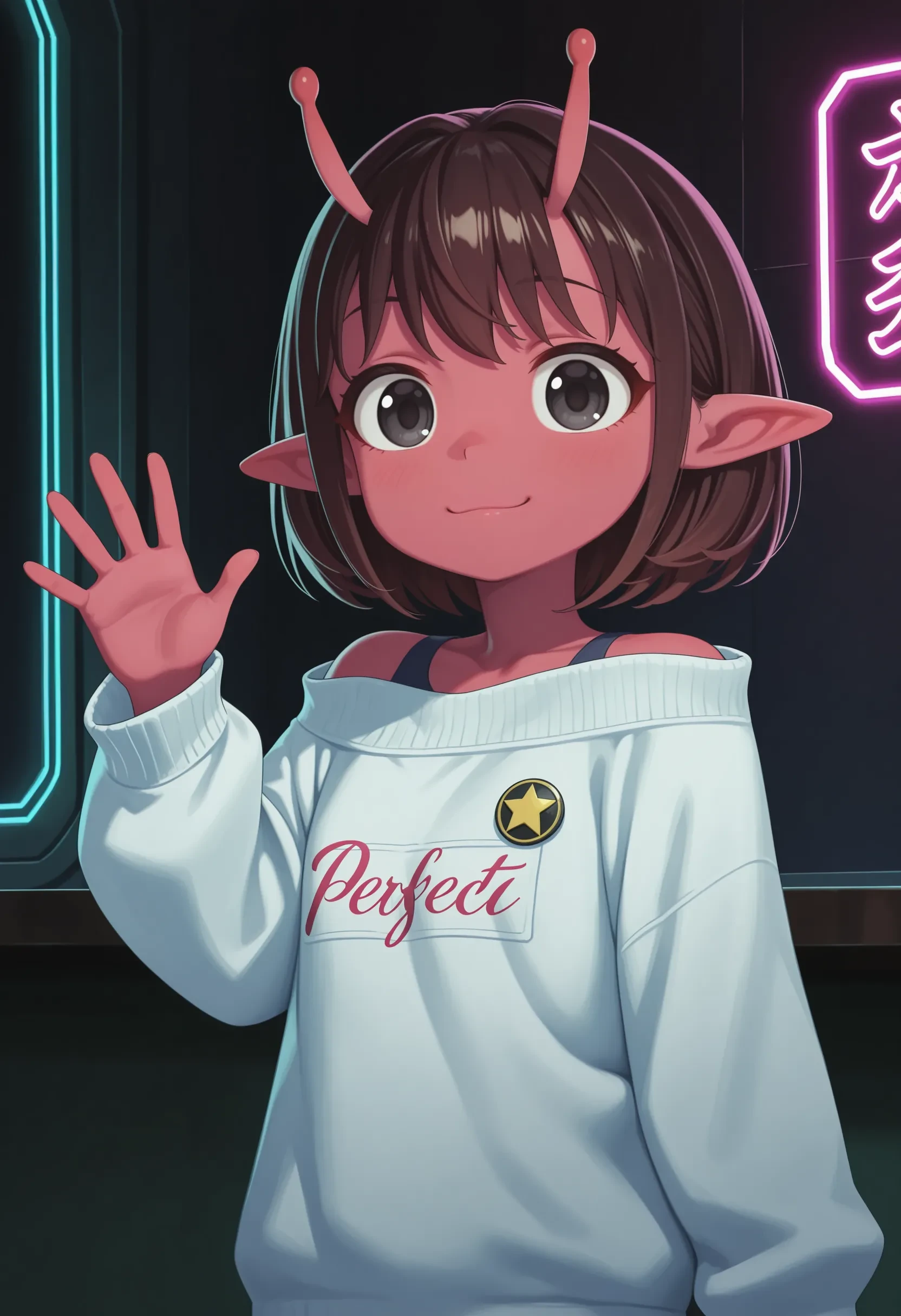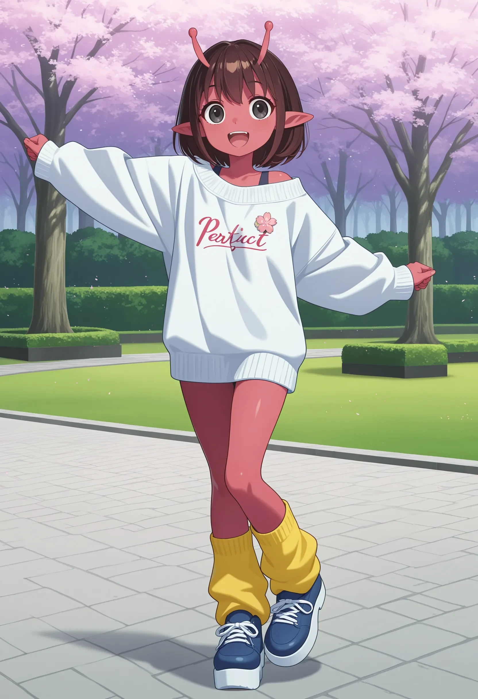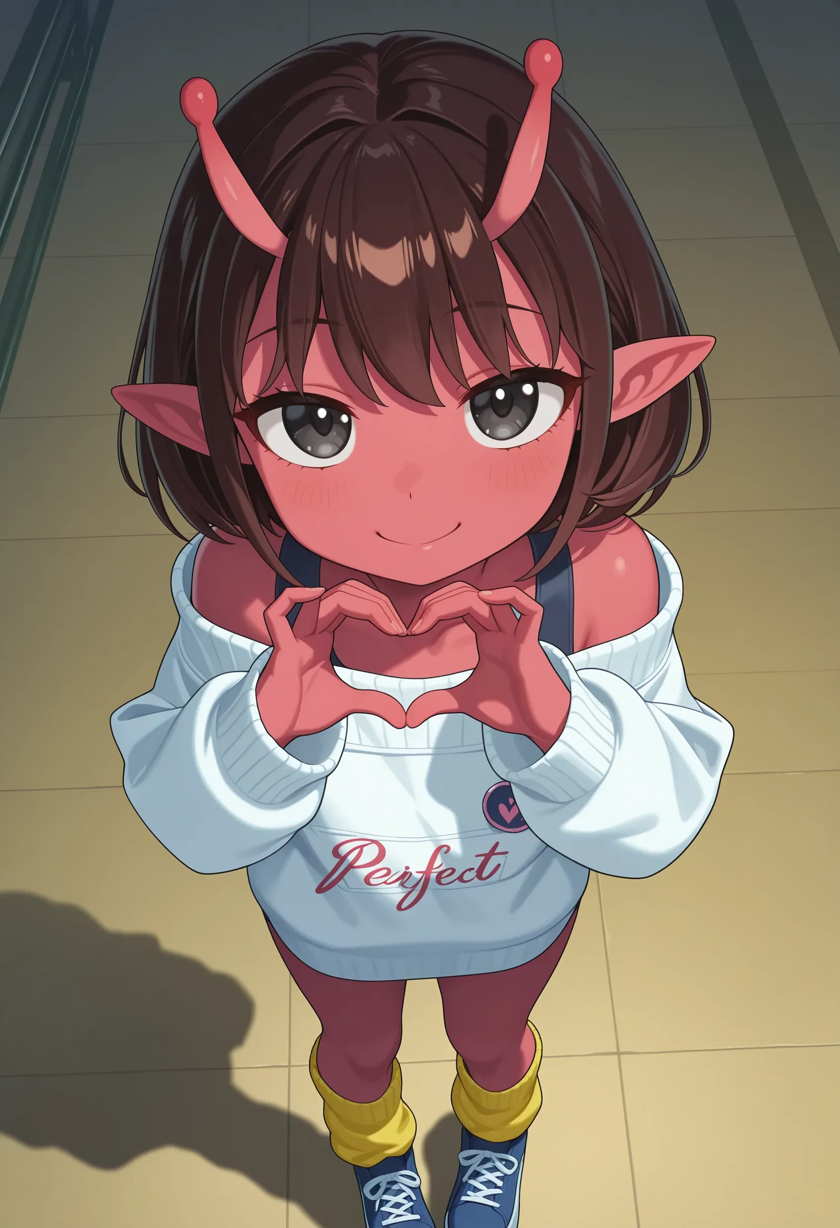 kujo chiharu, red skin, short hair, brown hair, black eyes, antennae, pointy ears, white sweater, off shoulder, strap, badge, yellow socks, loose socks, blue shoes, platform footwear,