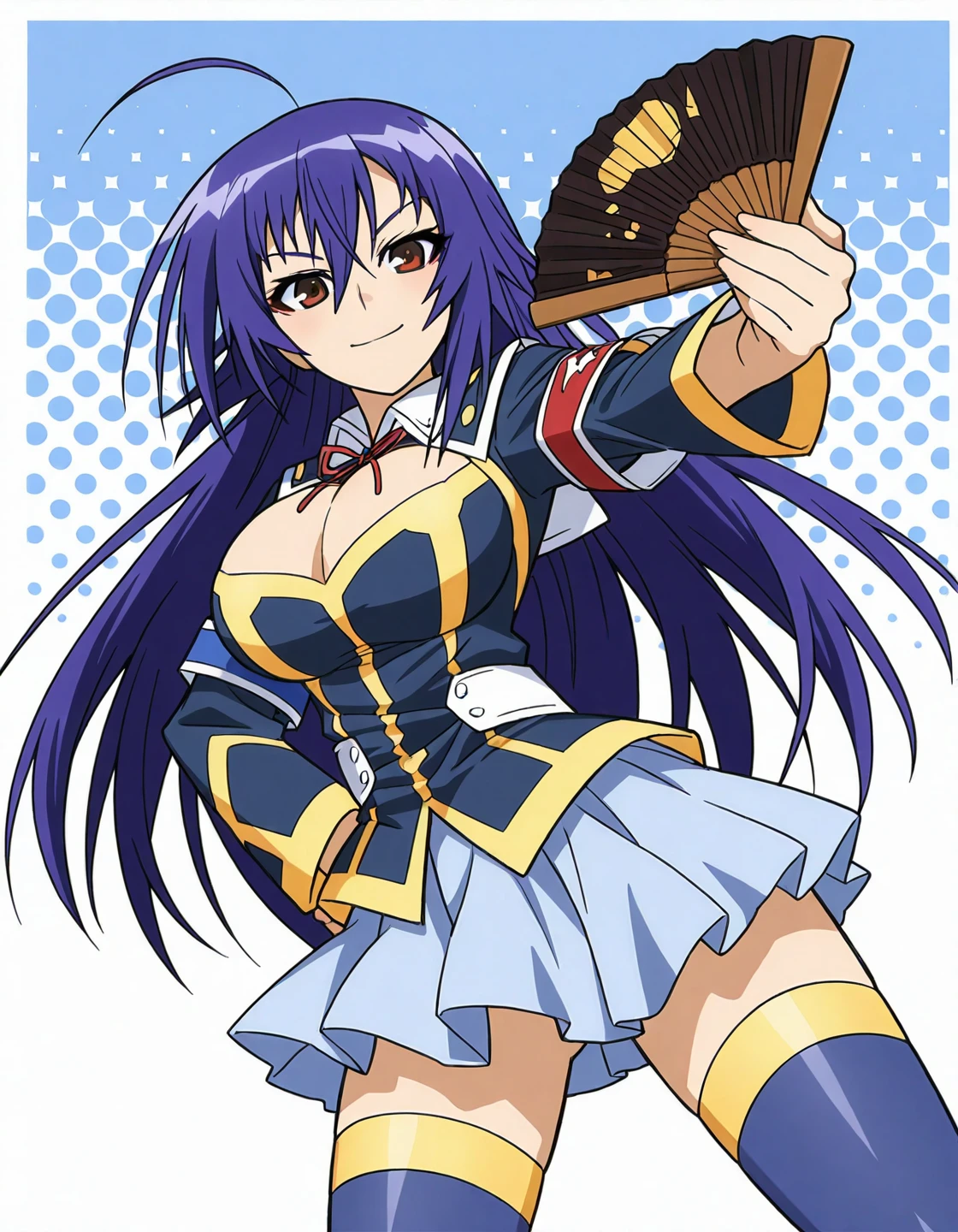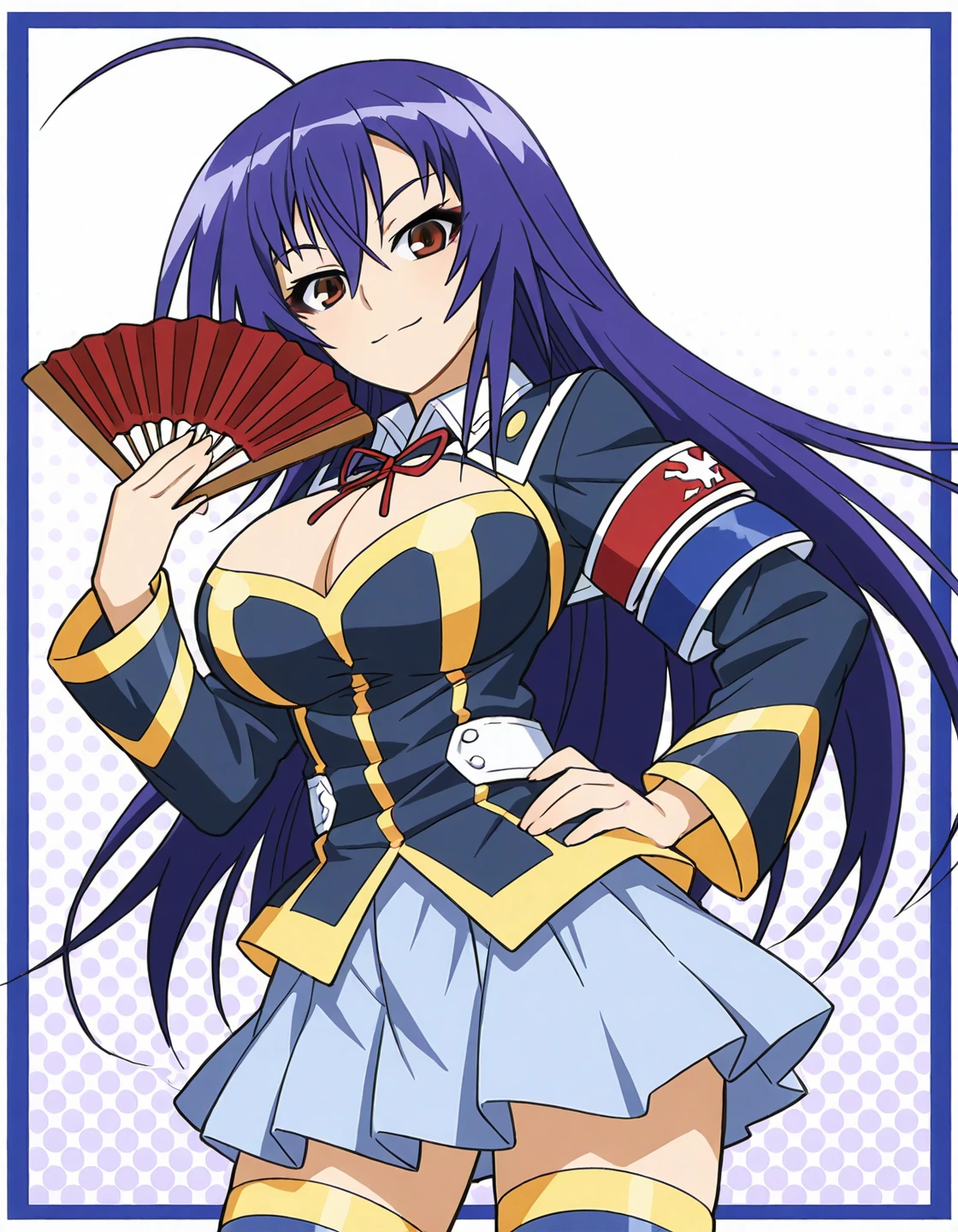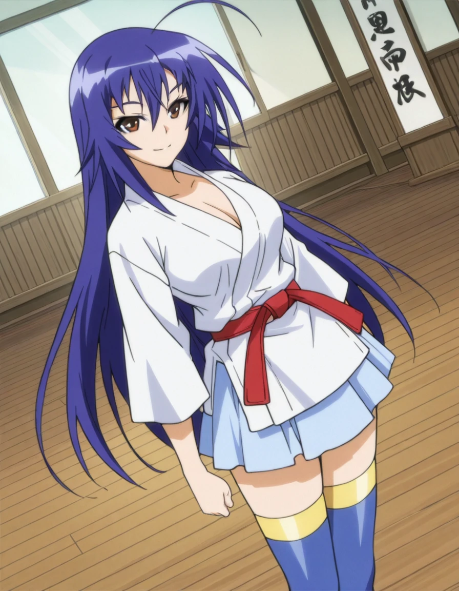 Her signature look features her long, flowing blue hair, sharp crimson eyes, and her distinctive student council uniform with colorful armbands that symbolize her authority and versatility. Medaka’s presence radiates elegance, discipline, and power — a perfect balance of grace and dominance.