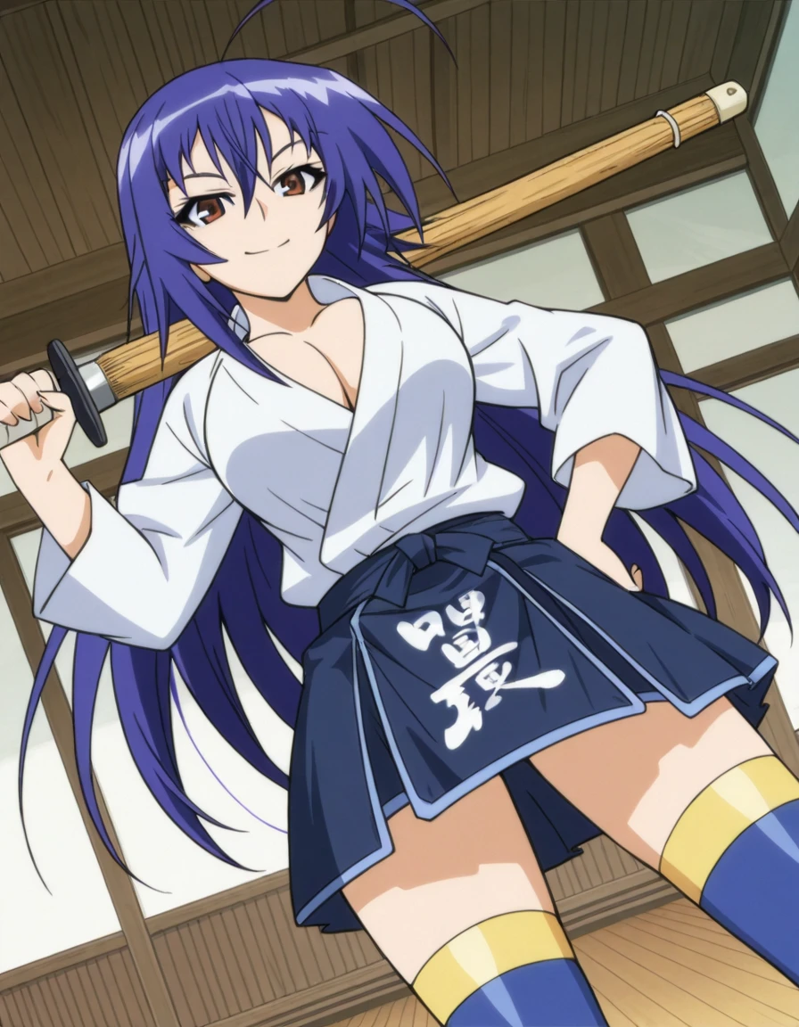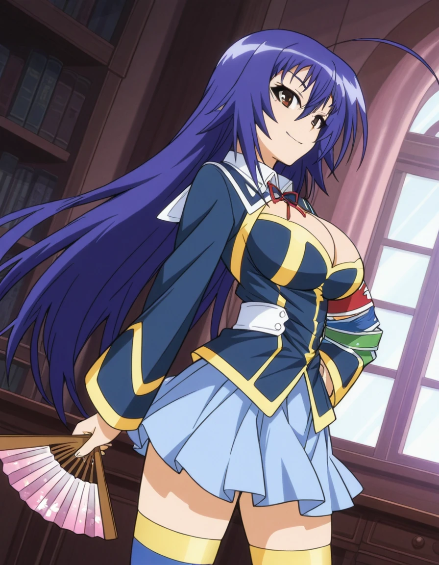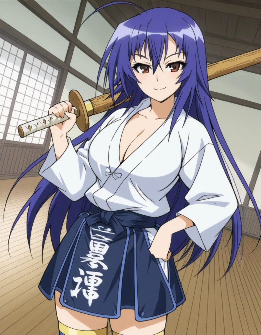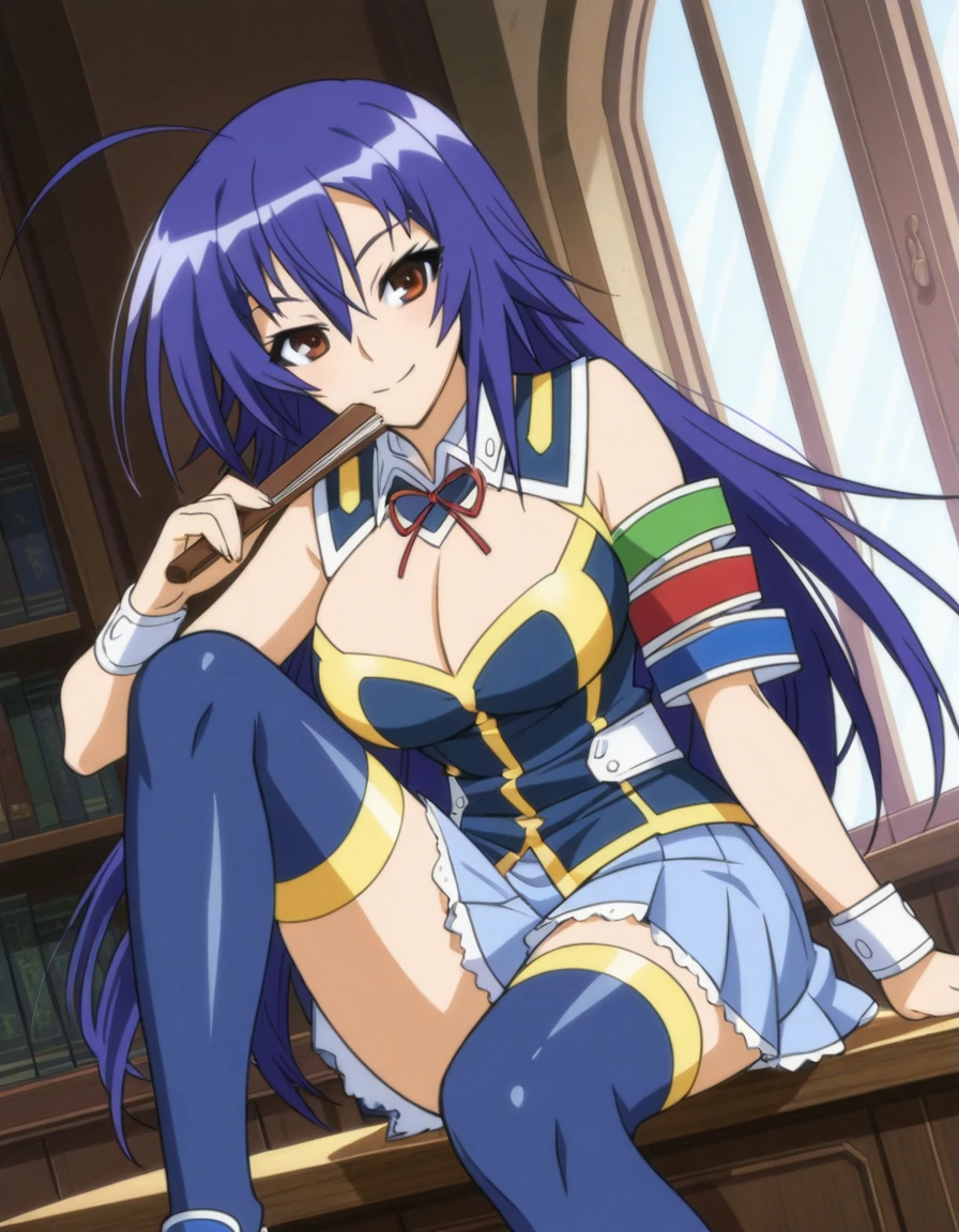 Her signature look features her long, flowing blue hair, sharp crimson eyes, and her distinctive student council uniform with colorful armbands that symbolize her authority and versatility. Medaka’s presence radiates elegance, discipline, and power — a perfect balance of grace and dominance.