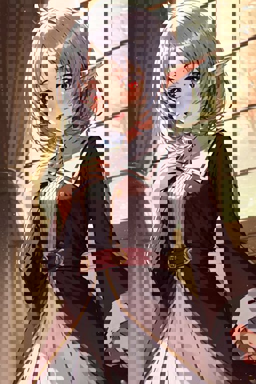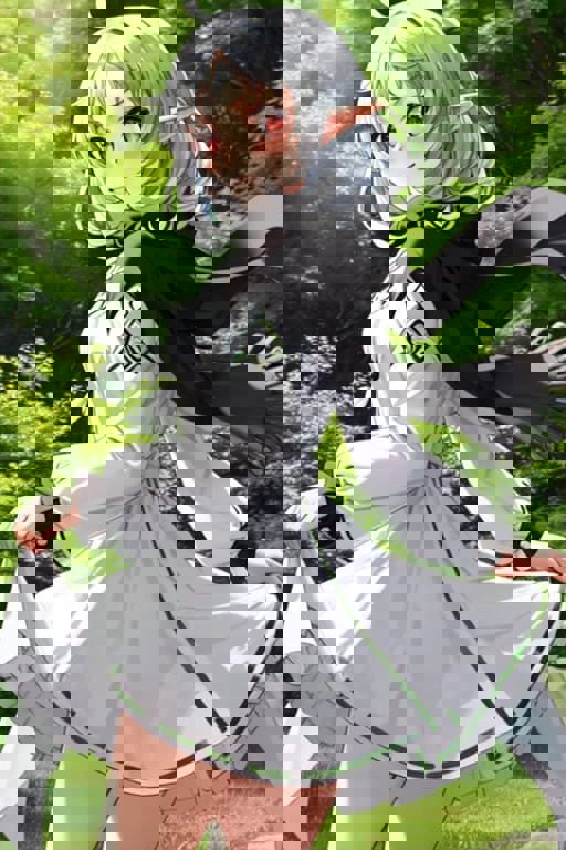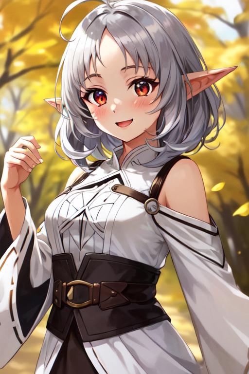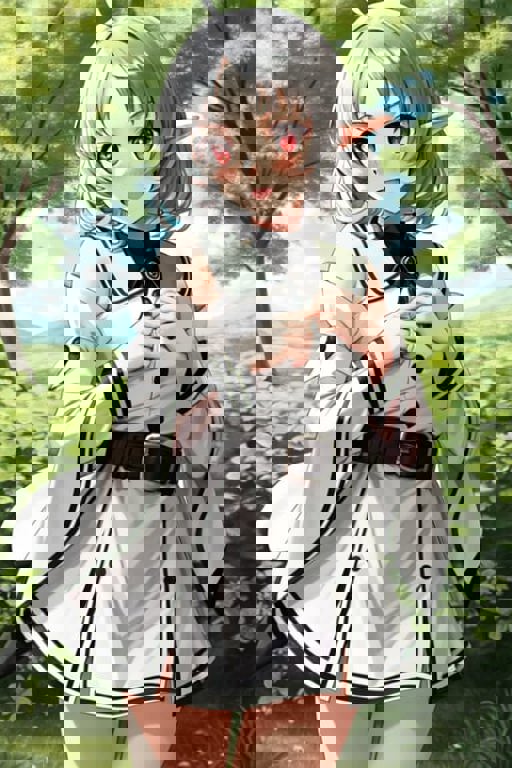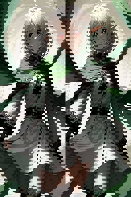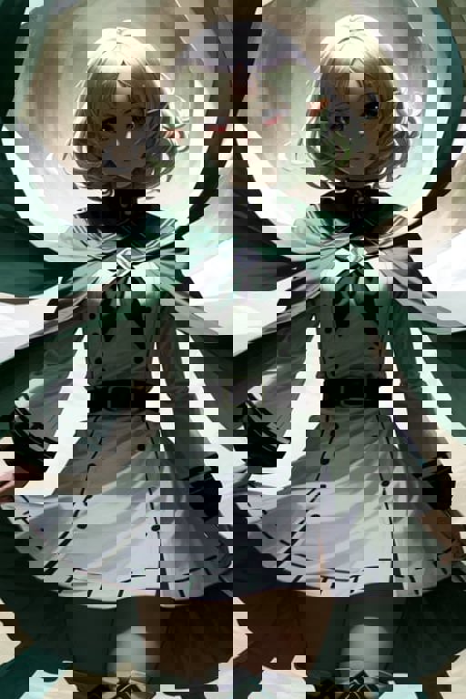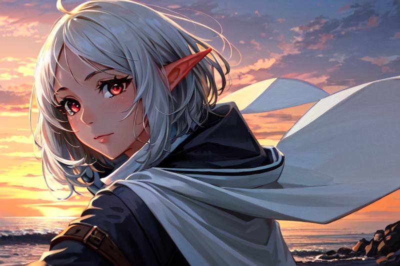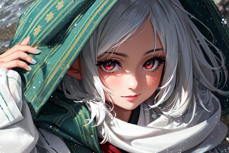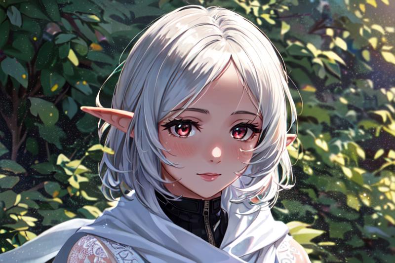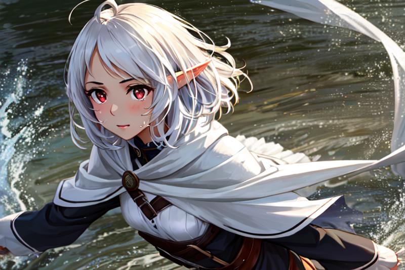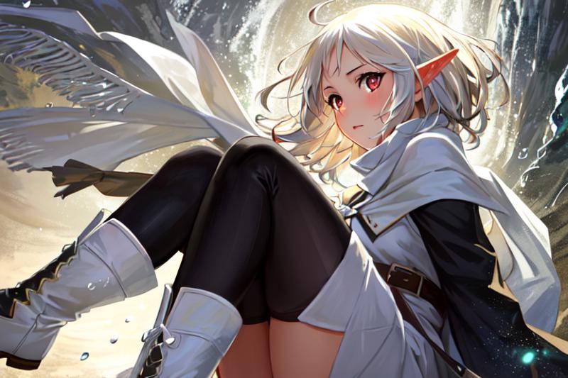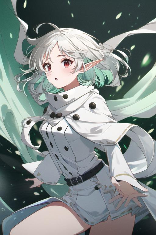 Prompt: masterpiece, best quality , (red eyes:1.2), silver hair, (Sylphiette:0.8), ahoge, small breast , short hair, white dress, long sleeves, elf ears, floating hair, short white European sundress with black trim, white puffy long sleeves, tan wicker belt , sailor collar black , white knee high boots , (green adventuring shawl:1.2), 4k, 8k , hyper-detailed, realistic light, unity, hard lighting, intricate details, stop motion, hyperfocus, tonemapping, sharp focus, hyper detailed, scary, zoom out, villian, colorful, beautiful, vibrant colors, intricate details, elegant,