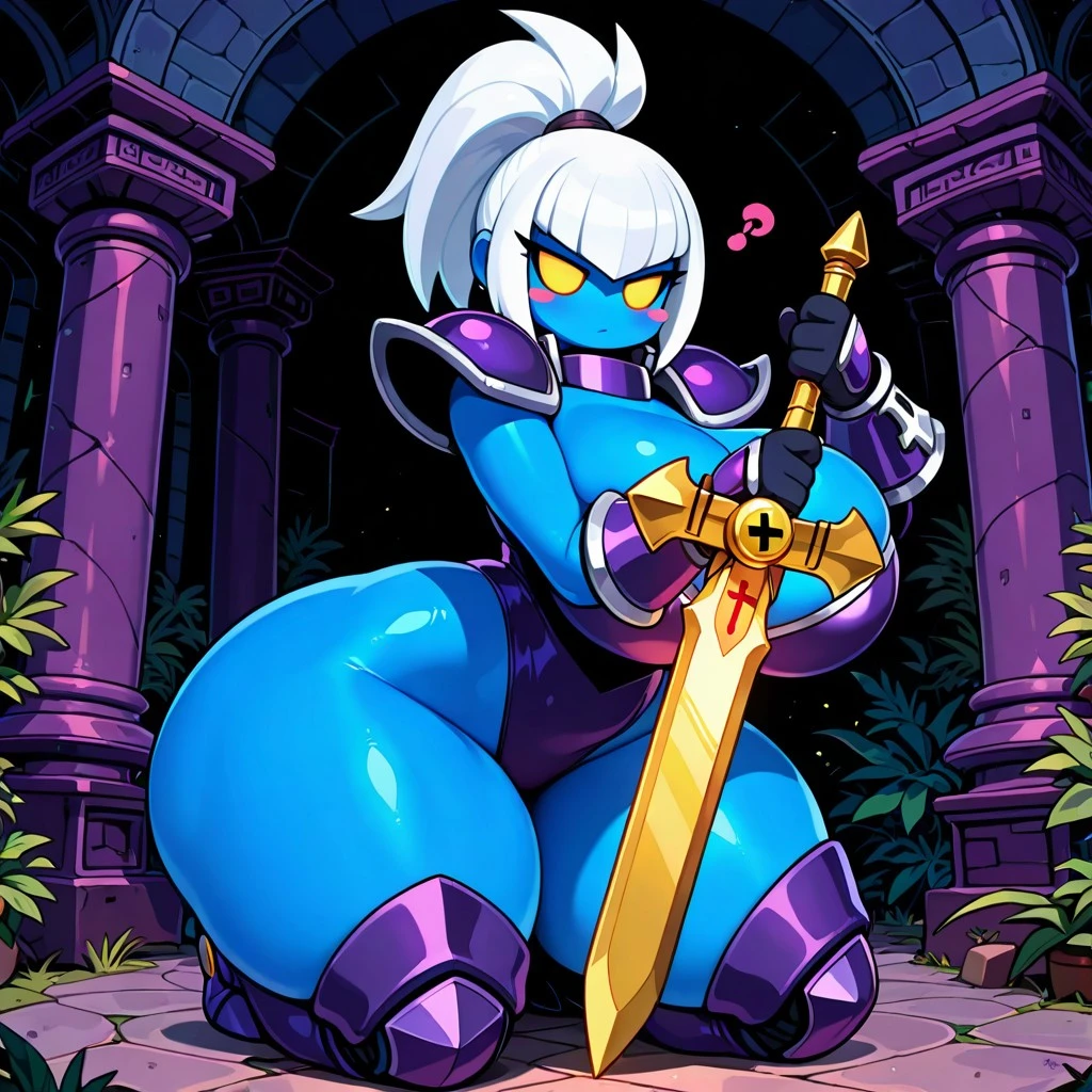 meta knight, white hair, very long hair, yellow eyes, blue skin,
