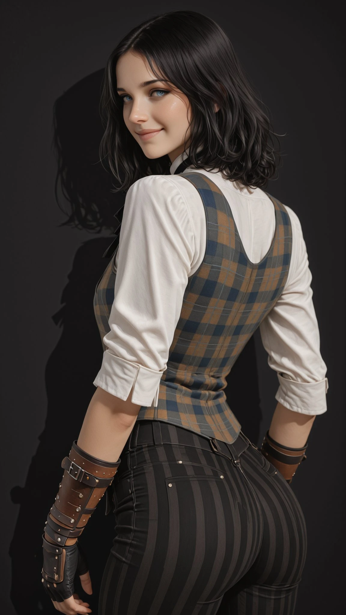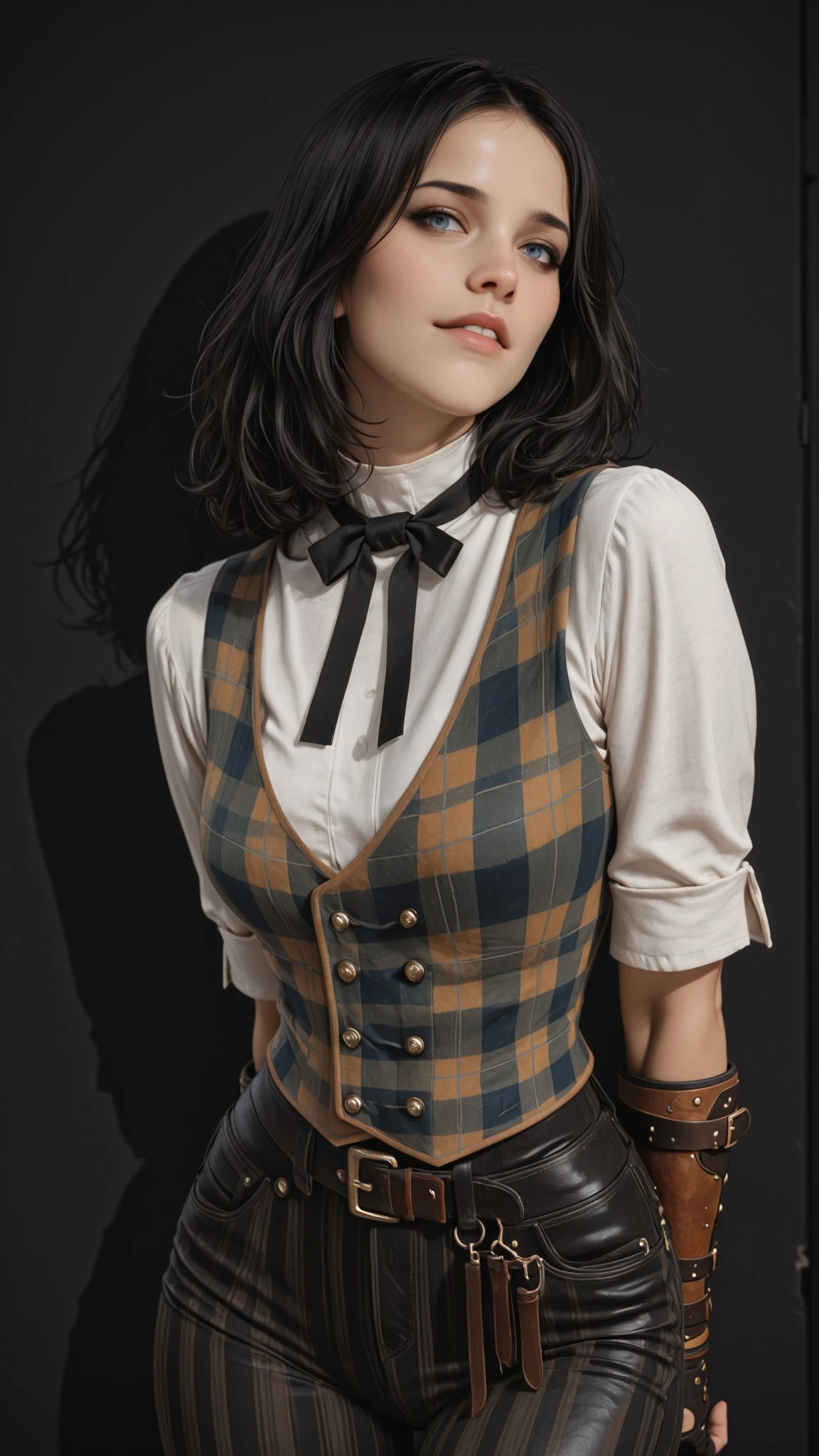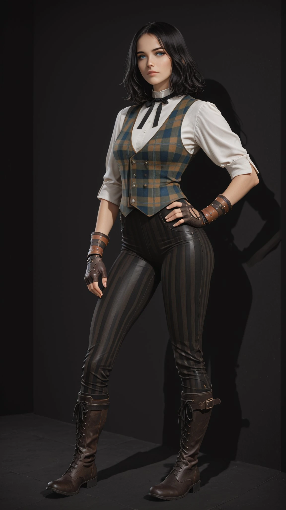 white shirt, black ribbon, short sleeves, green plaid vest, leather vambraces, fingerless gloves, striped pants, tight pants, leather heel boots, long boots
