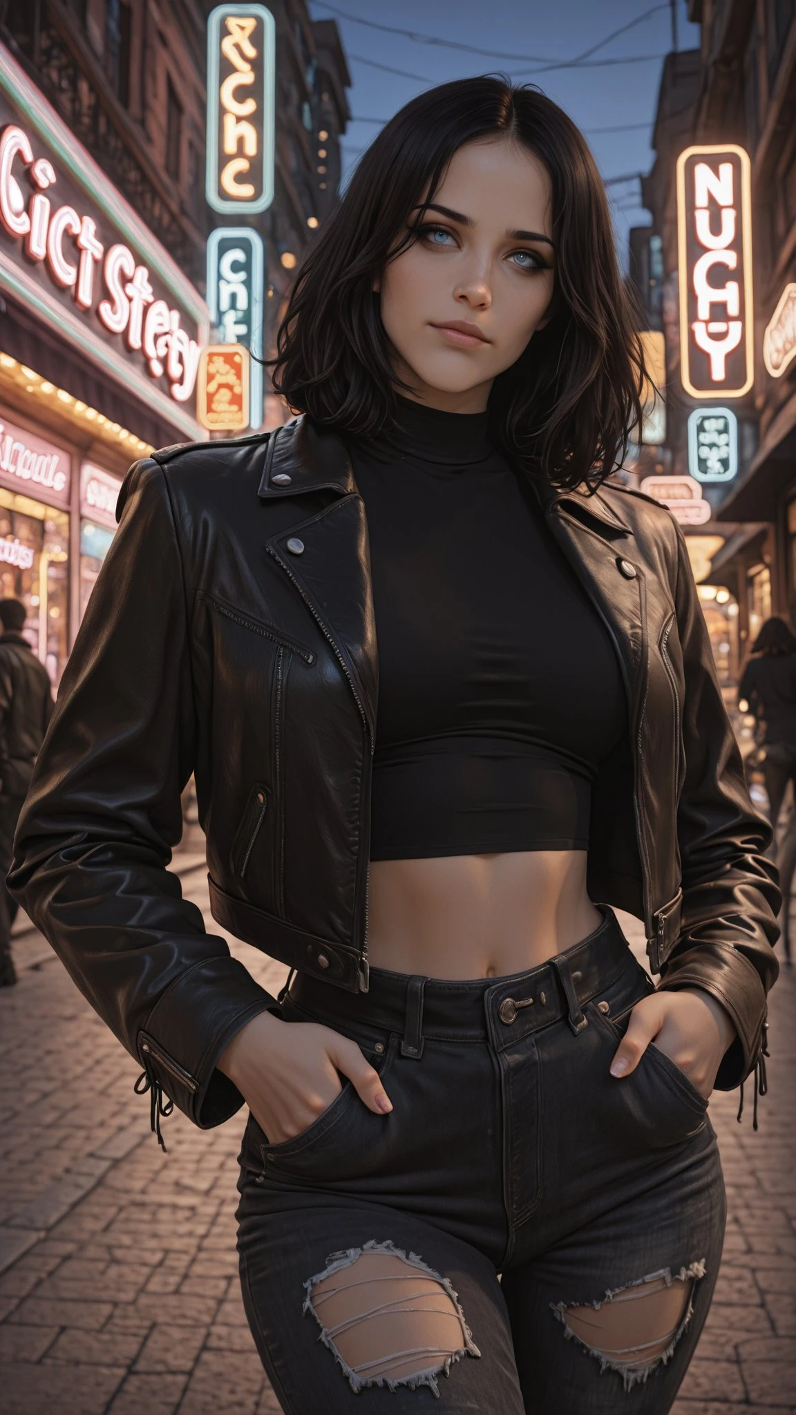 WestrnRDOgrlOC, black hair, 1girl, solo, minimal makeup, medium hair, bob hair, black brows, blue eyes