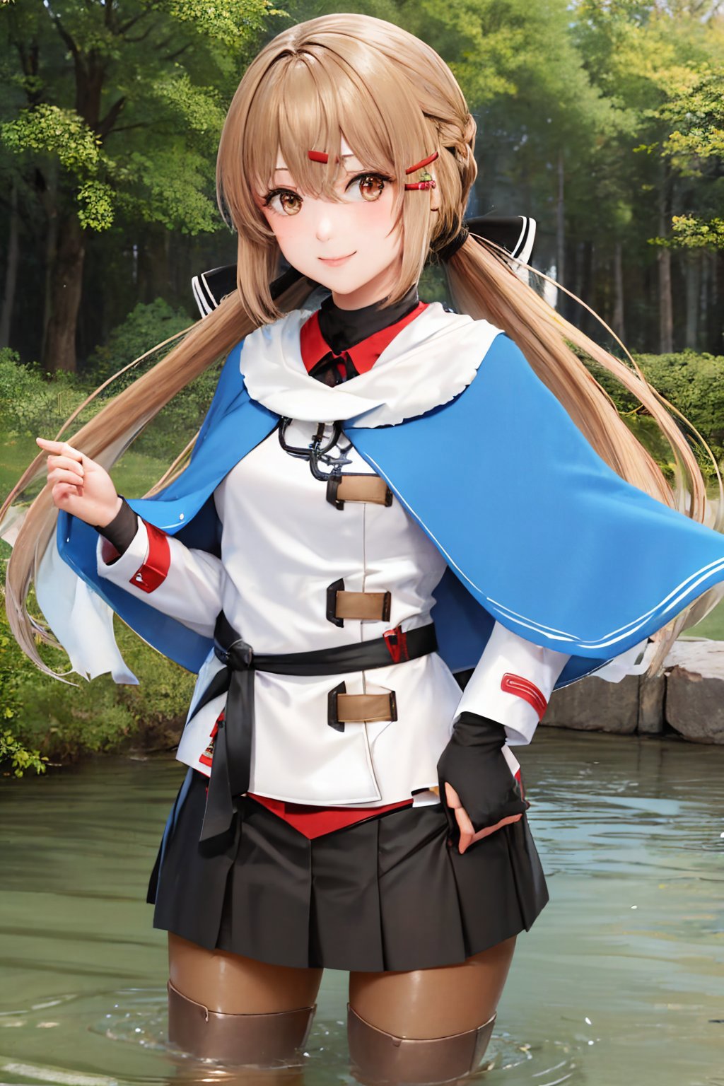 Default Outfit: fur hat, jacket, shirt, black bow, blue shawl, skirt, pantyhose, thigh boots, fingerless gloves, belt, anchor necklace, torn scarf