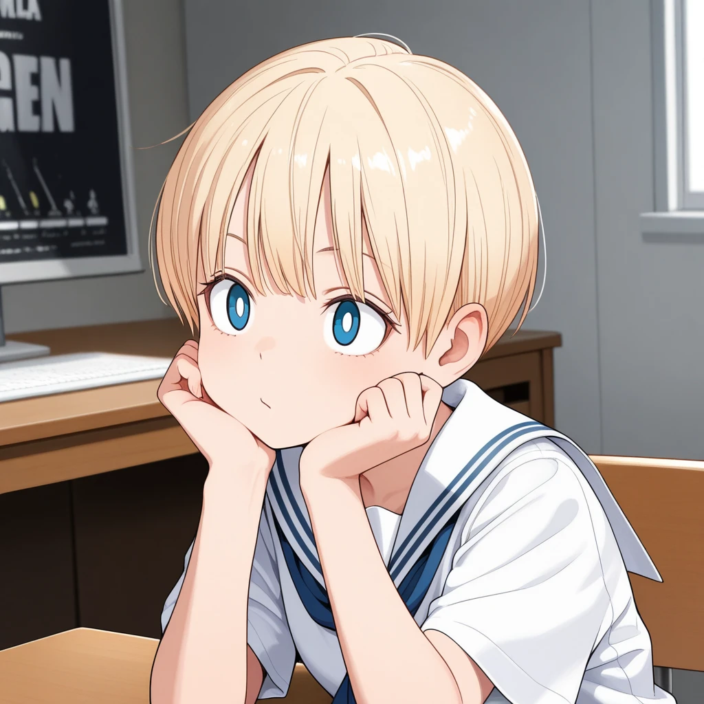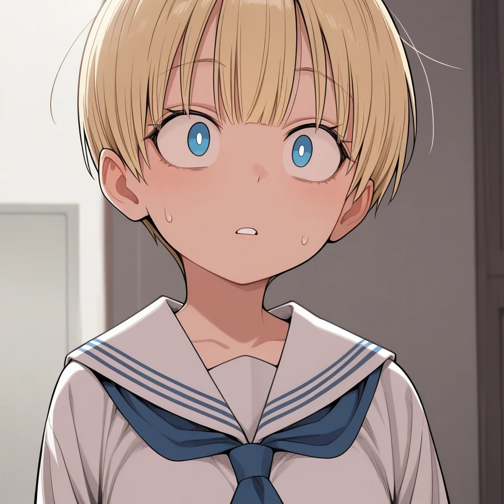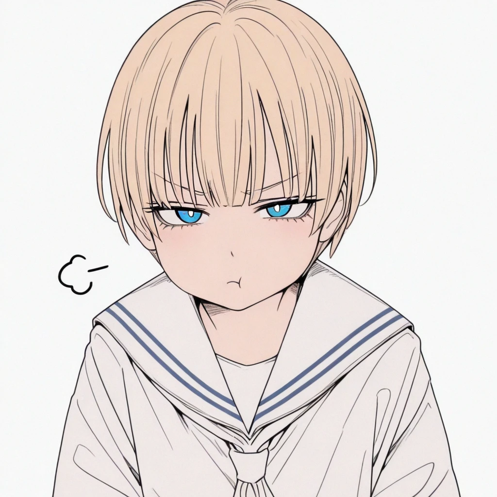 1girl, short hair, blonde hair, blue eyes,white pupils, serafuku, white_sailor_collar