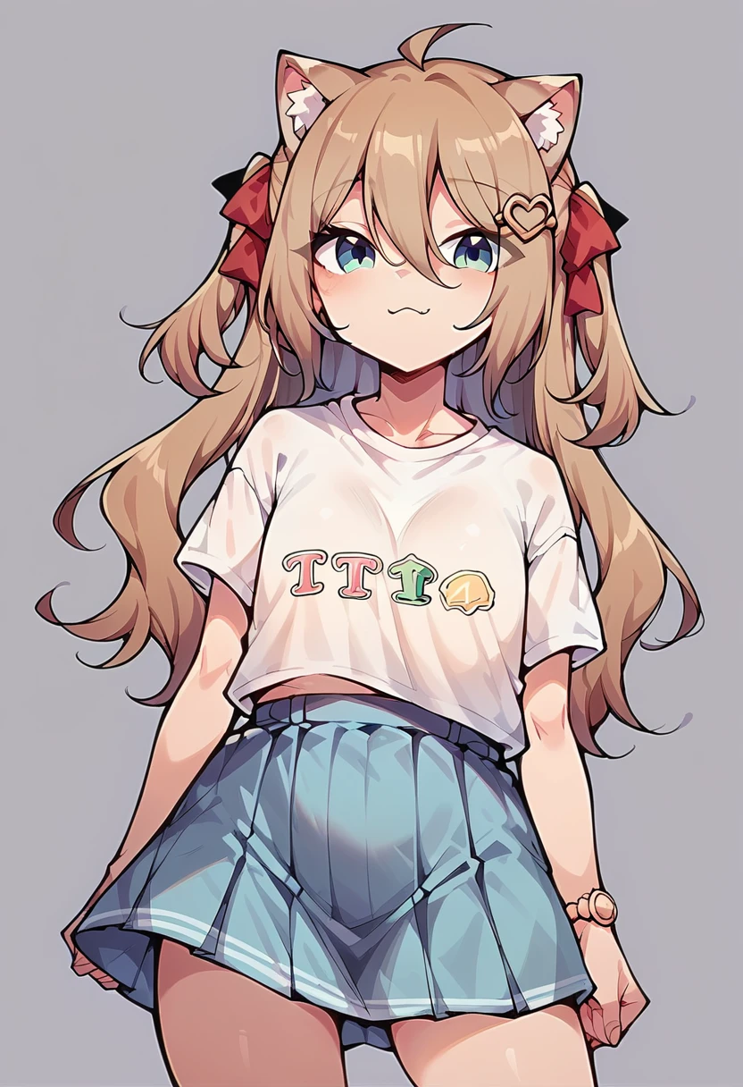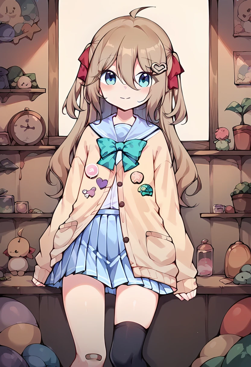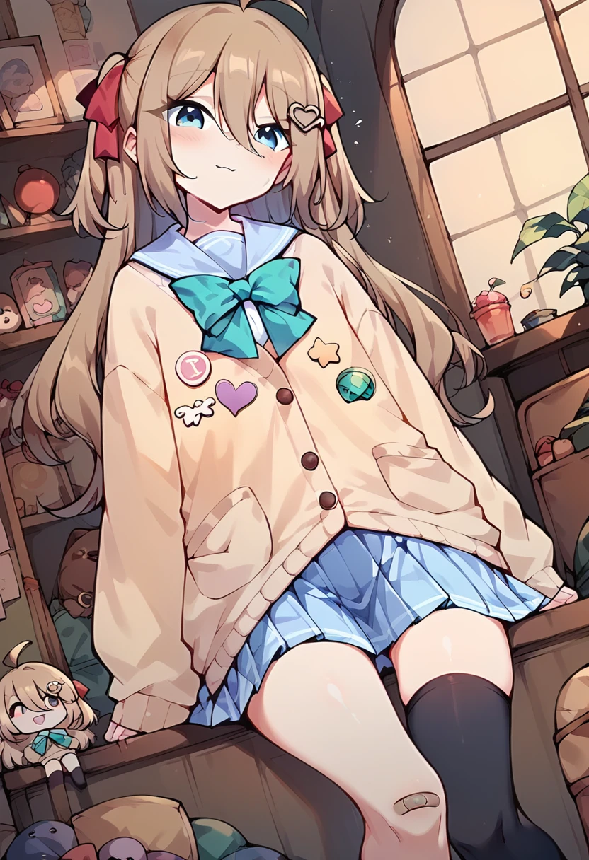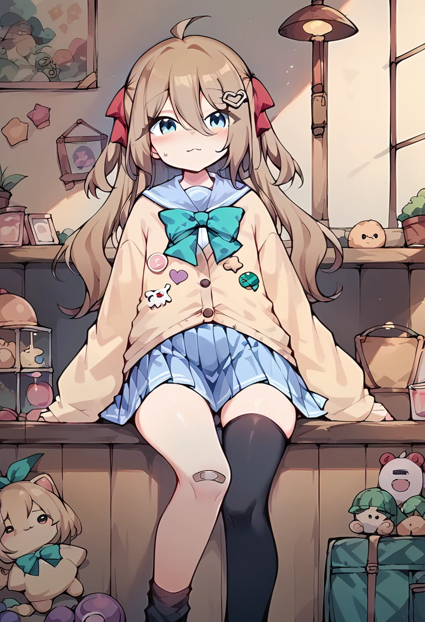 neur0sama, 1girl, yellow cardigan, sailor collar, green bowtie, blue skirt, single thighhigh, black sock, bandaid on knee