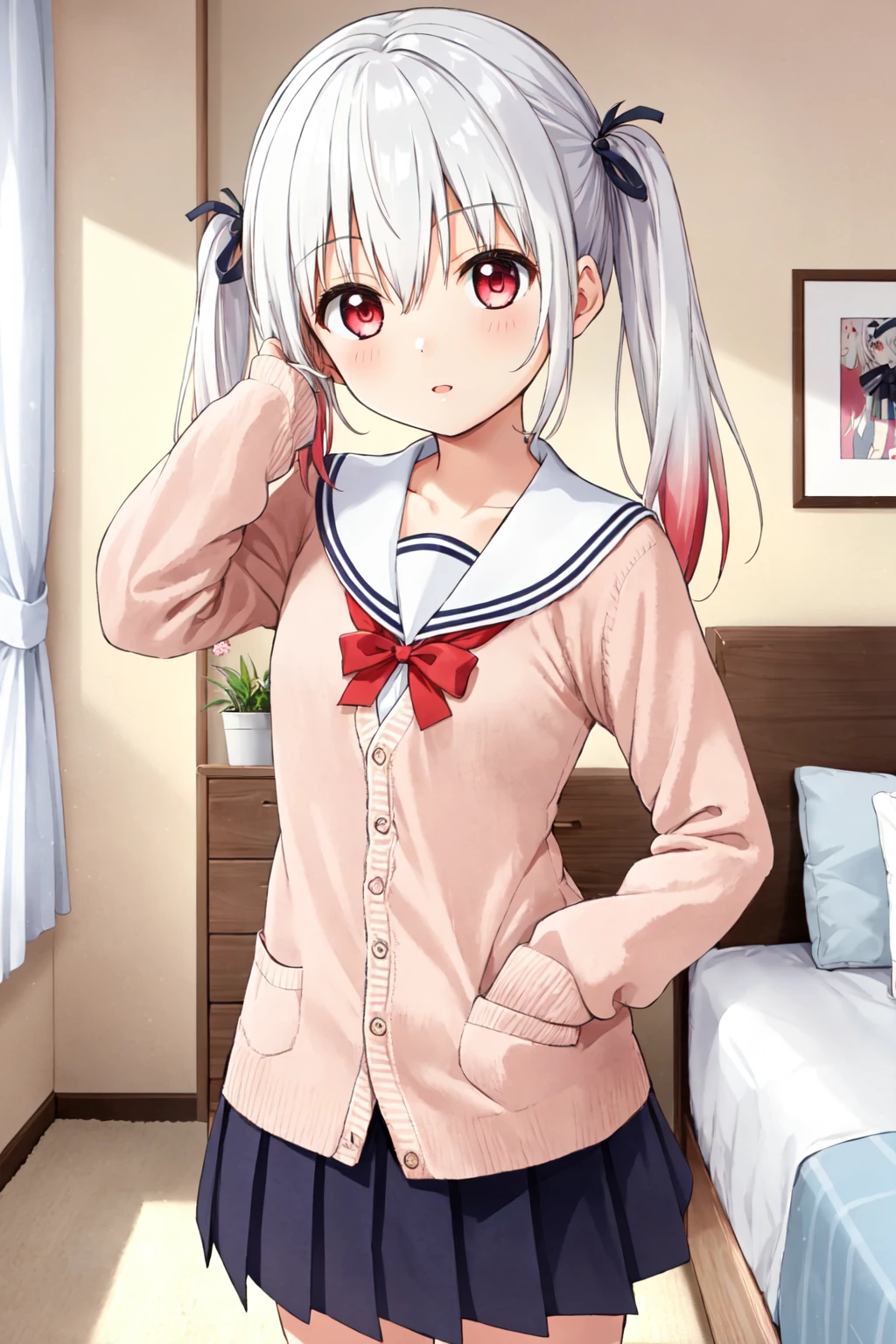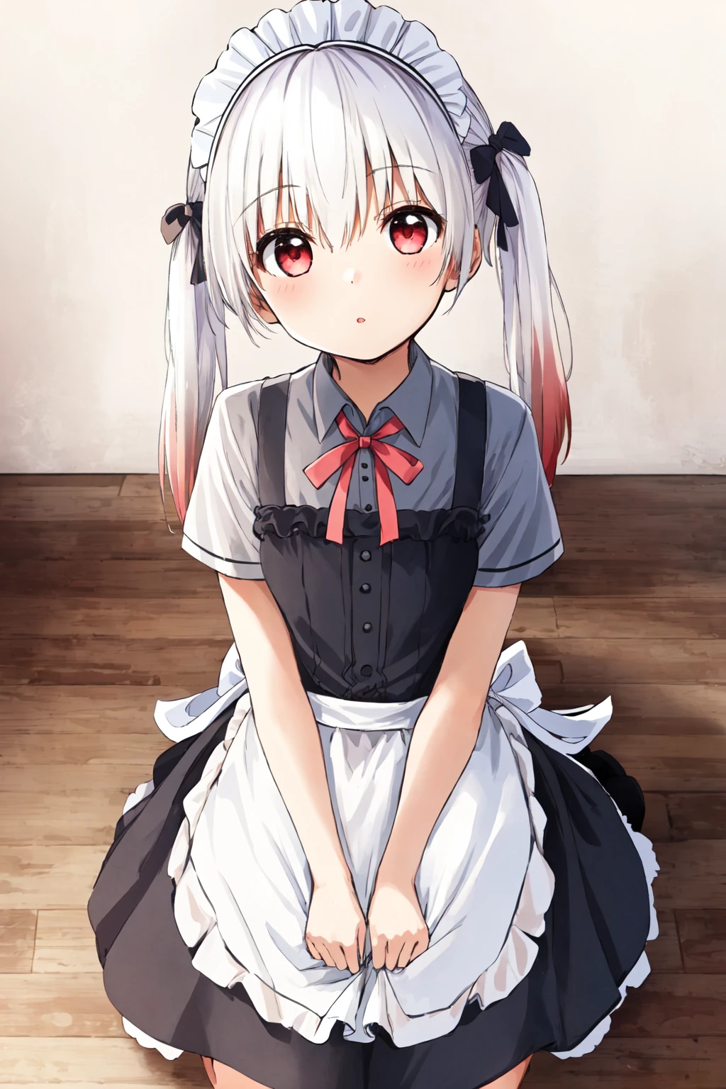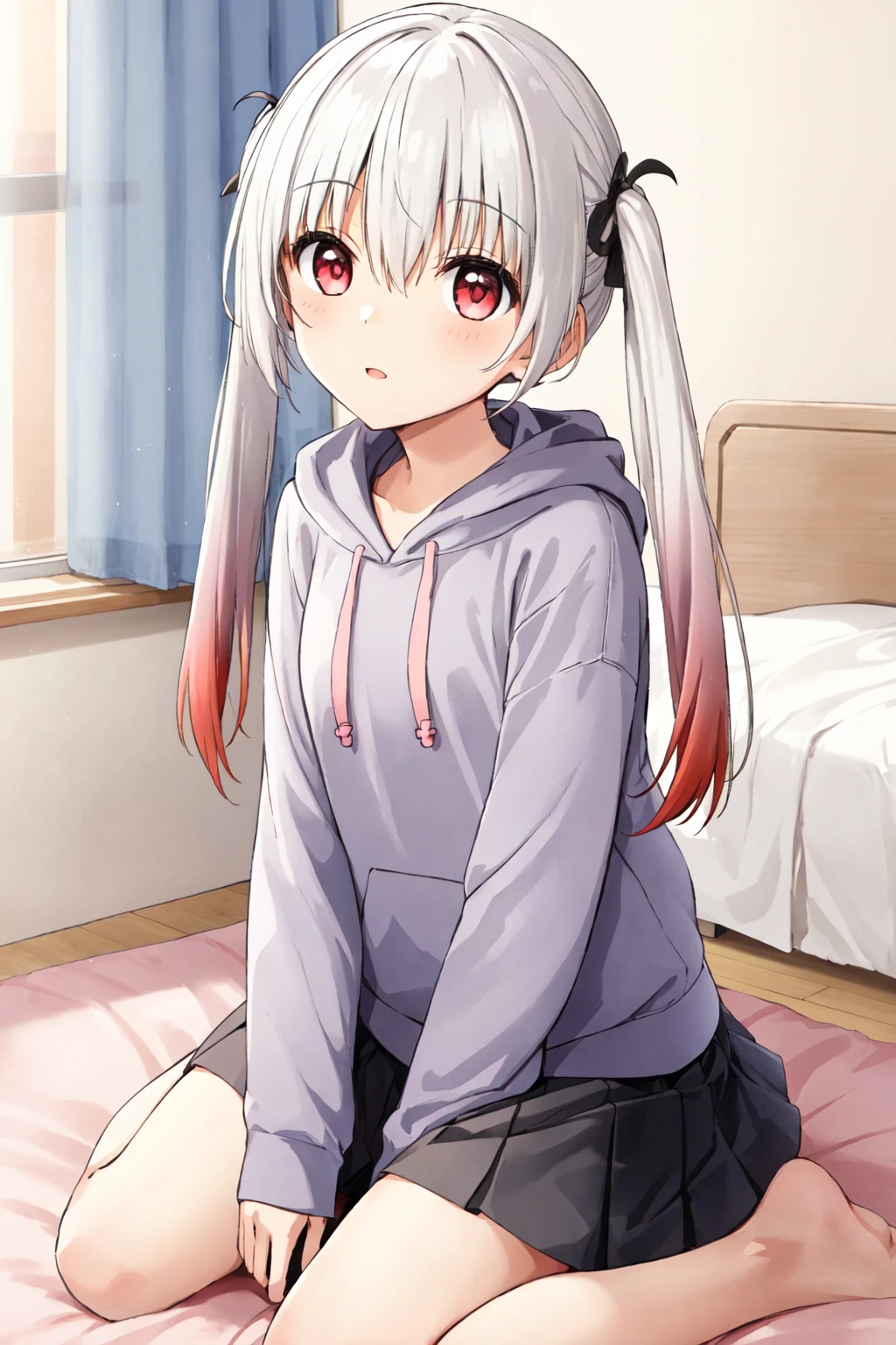 mogumo, 1girl, long hair, red eyes, white hair, twintails, hair between eyes, multicolored hair, gradient hair, looking at viewer, bangs,