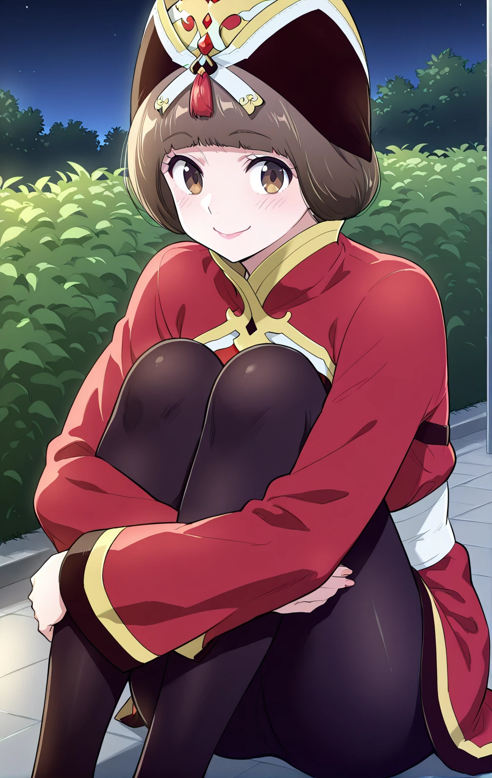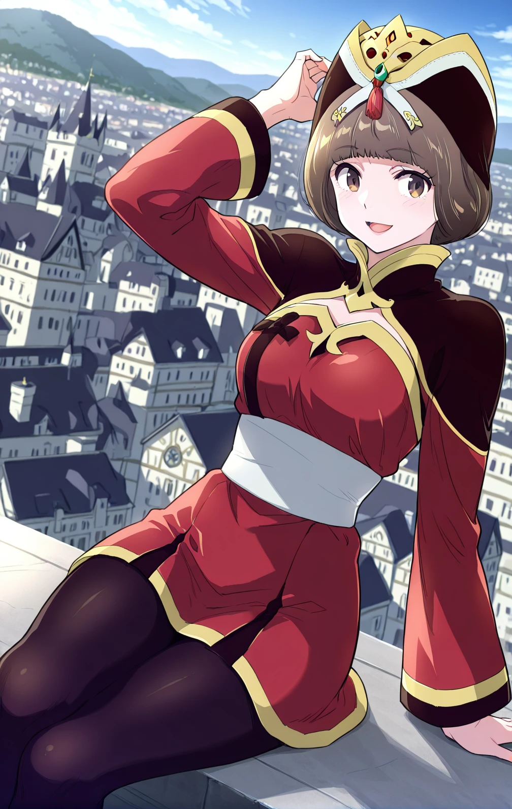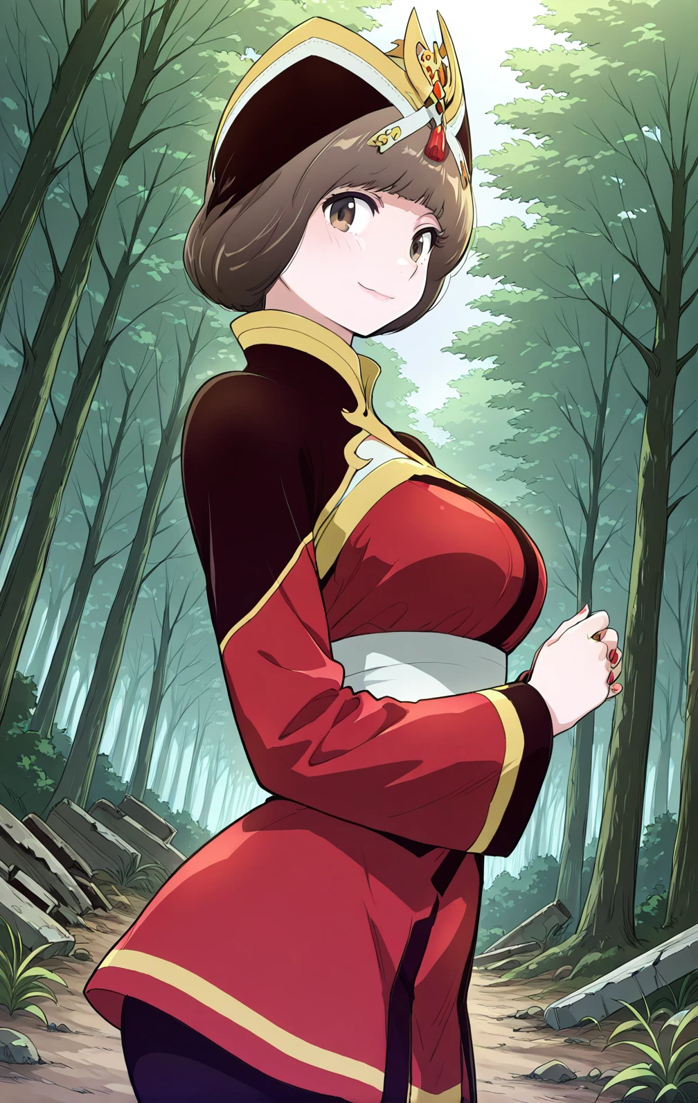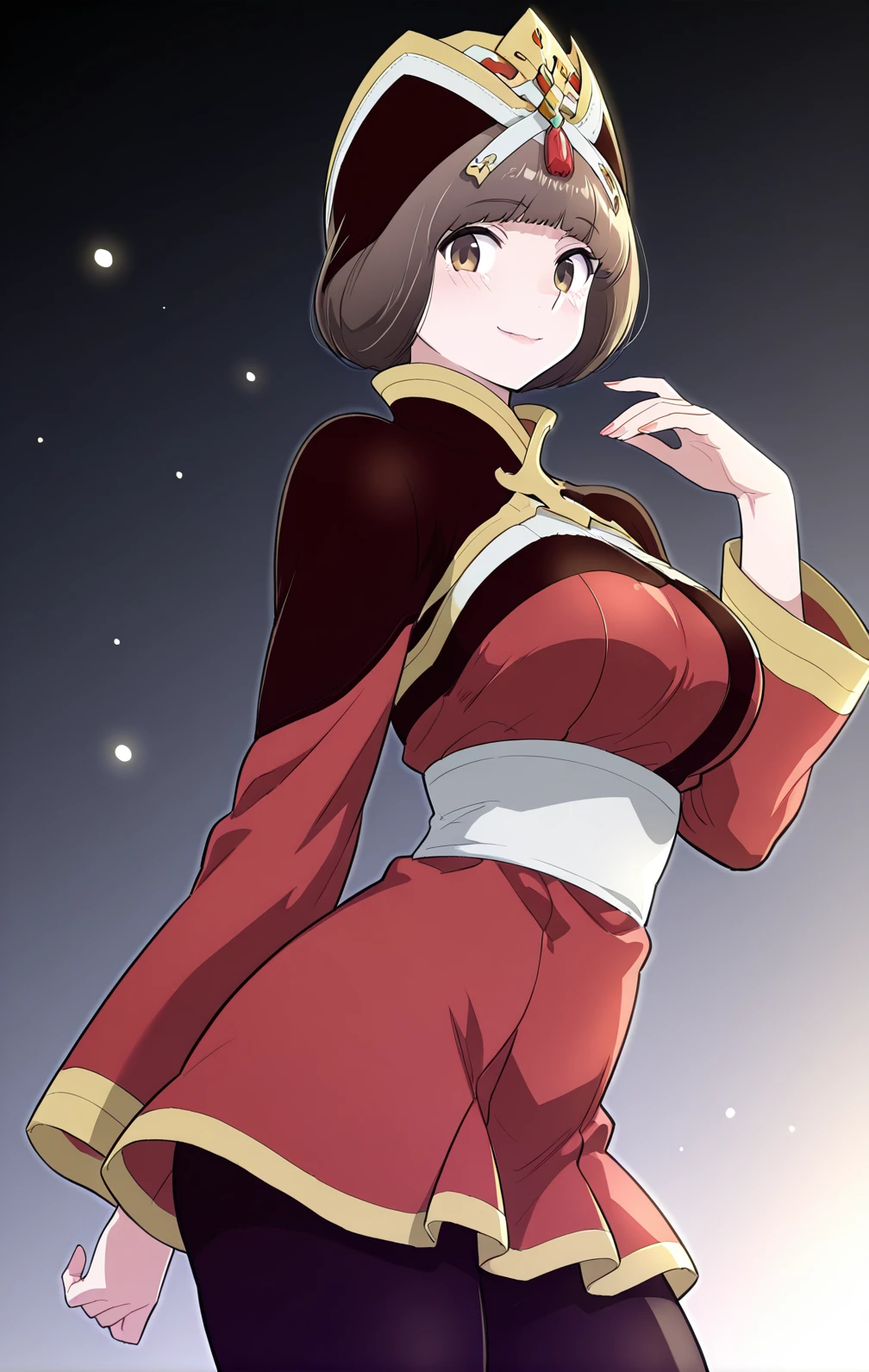 Hana, 1girl, solo, short brown bob, straight hair, blunt bangs, brown eyes, gold and black ornate crown,