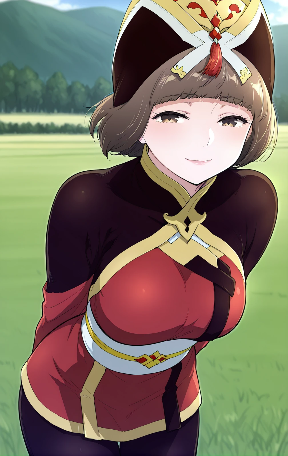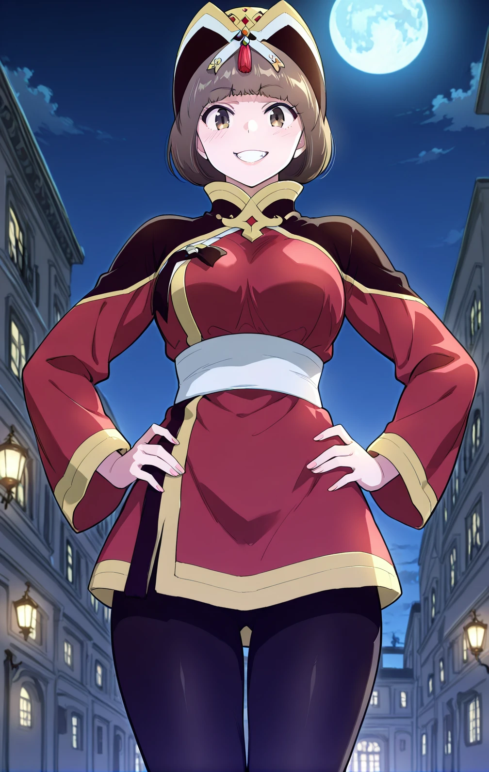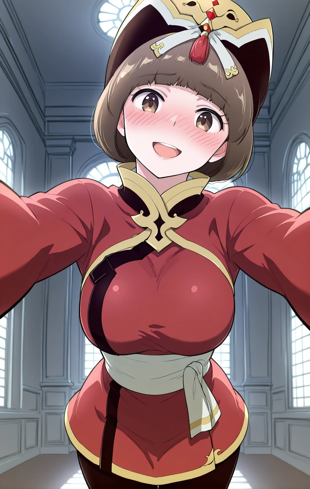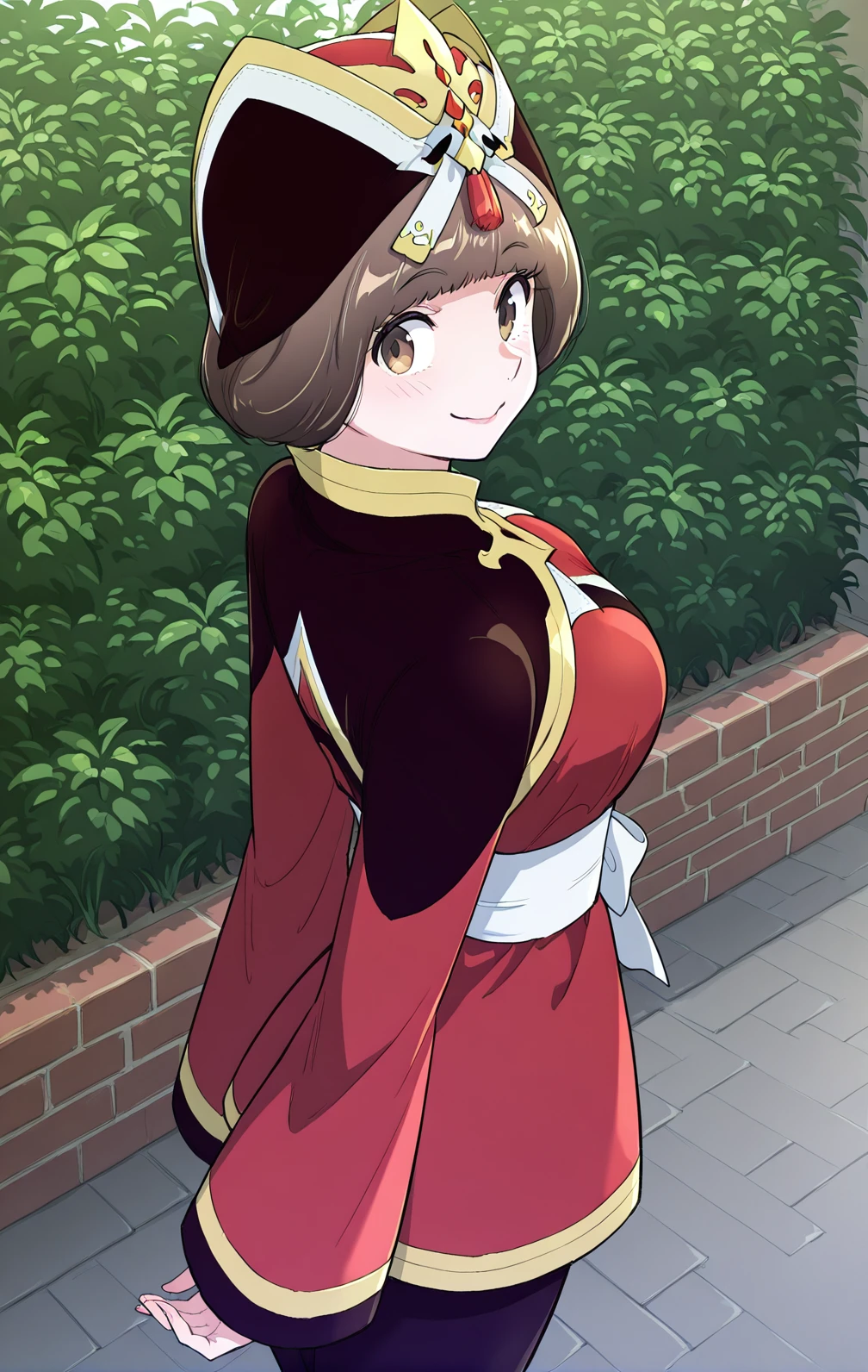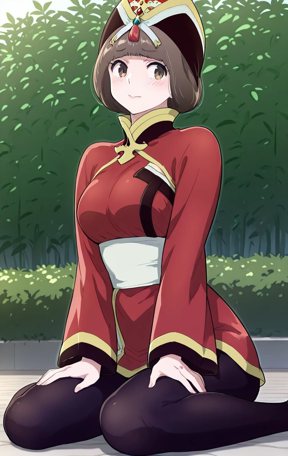 Hana, 1girl, solo, short brown bob, straight hair, blunt bangs, brown eyes, gold and black ornate crown,