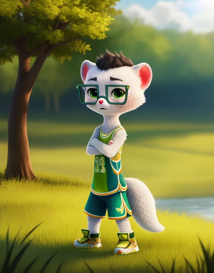 silver fur, green eyes, Weasel, square dark green glasses, ermine, light blue T-shirt and lime green tank top, emerald green shorts, green sneakers with white soles and orange laces, dark green bracelet