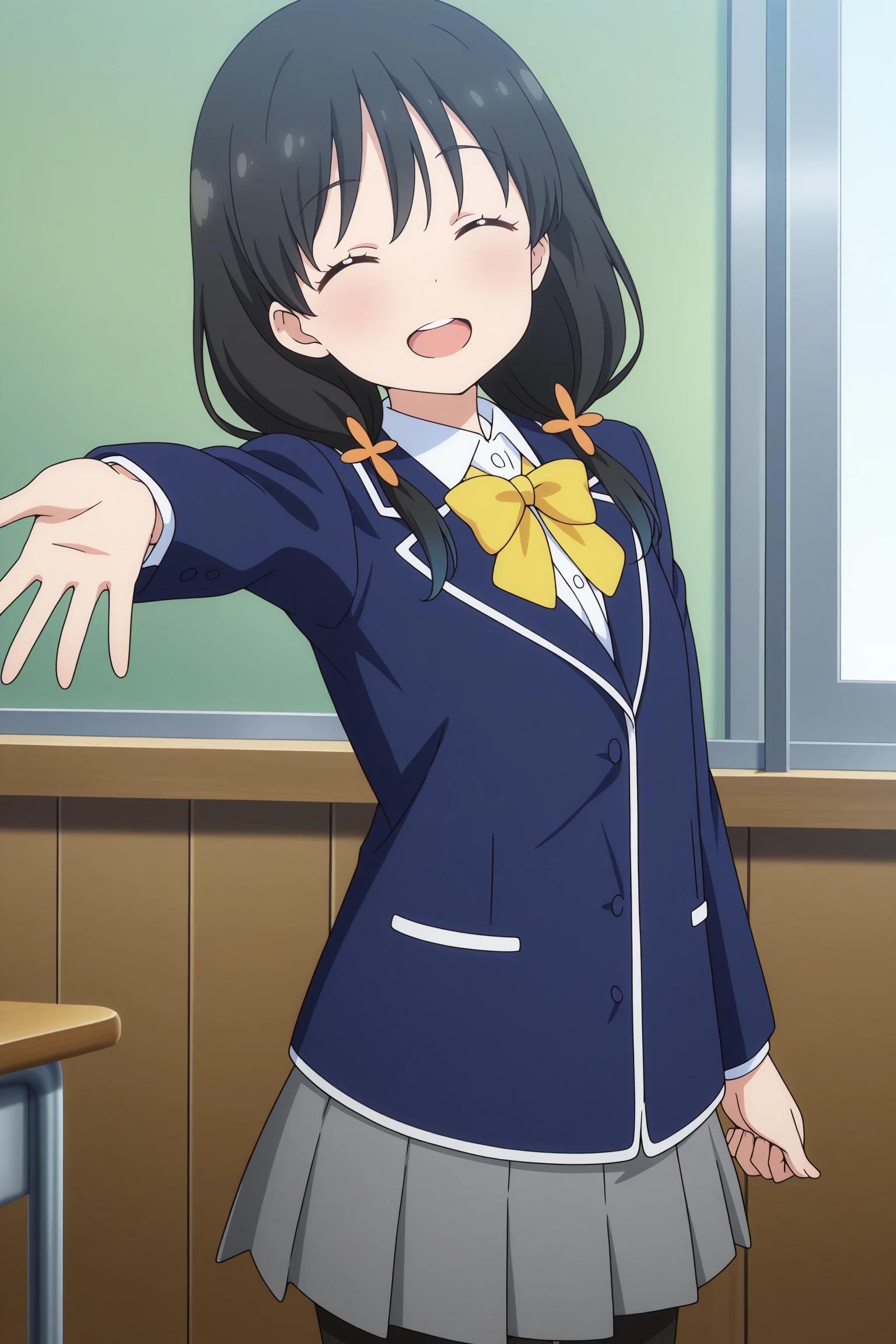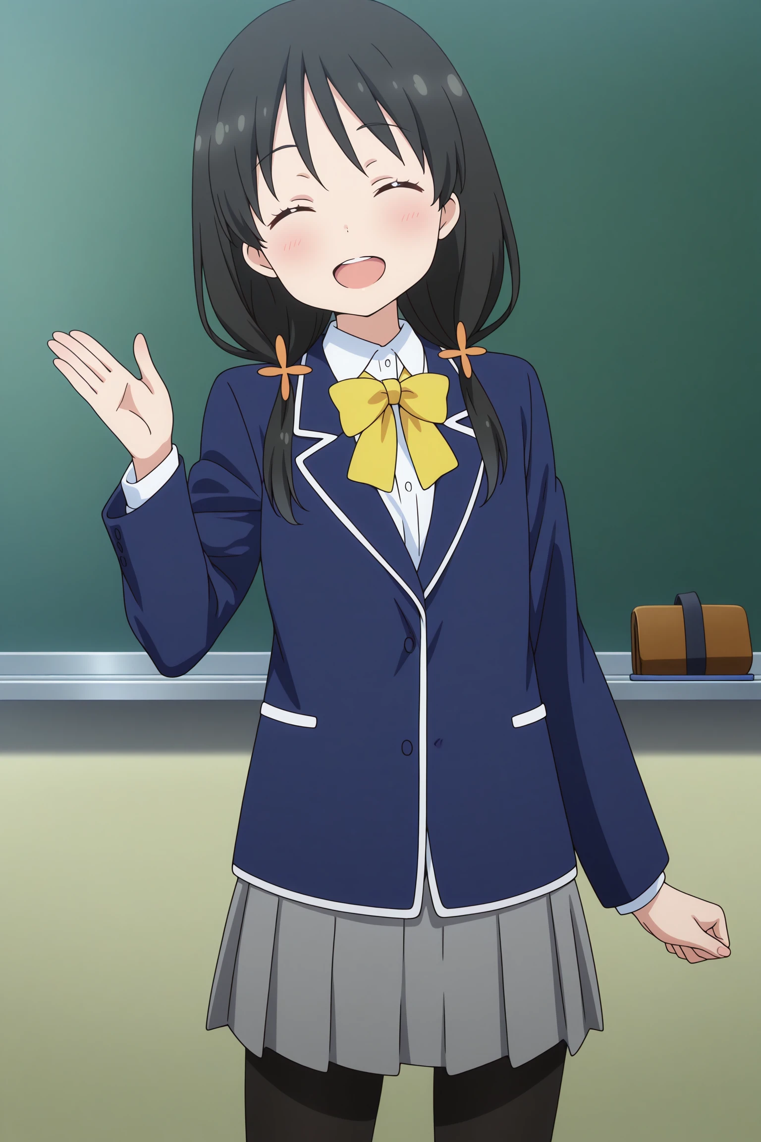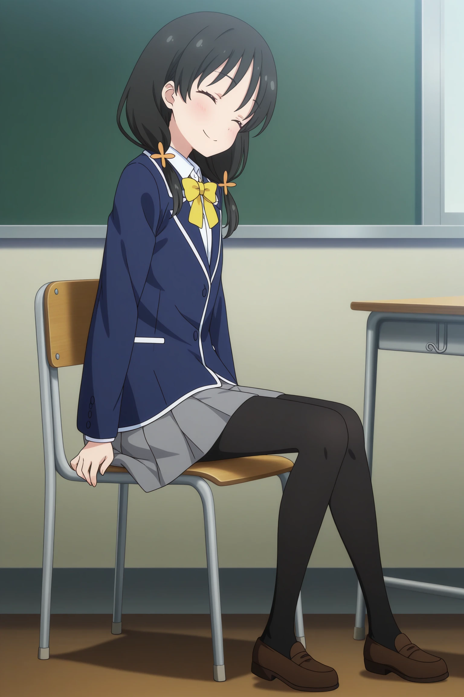 nonoka, long hair, black hair, low twintails, hair ornament, wispy bangs, closed eyes, long sleeves, blue jacket, white shirt, collared shirt, yellow bowtie, grey skirt, pleated skirt, black pantyhose, brown footwear, loafers