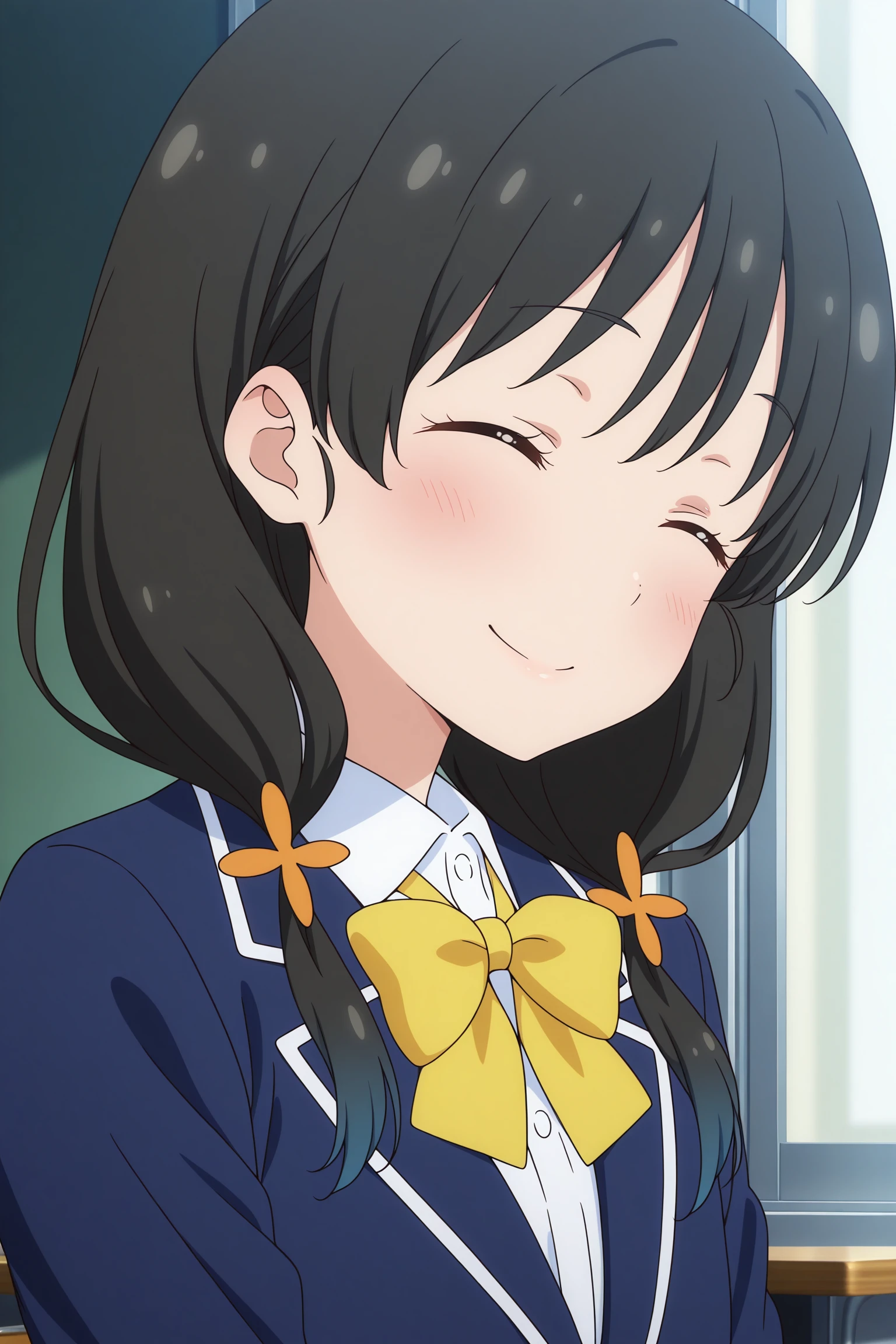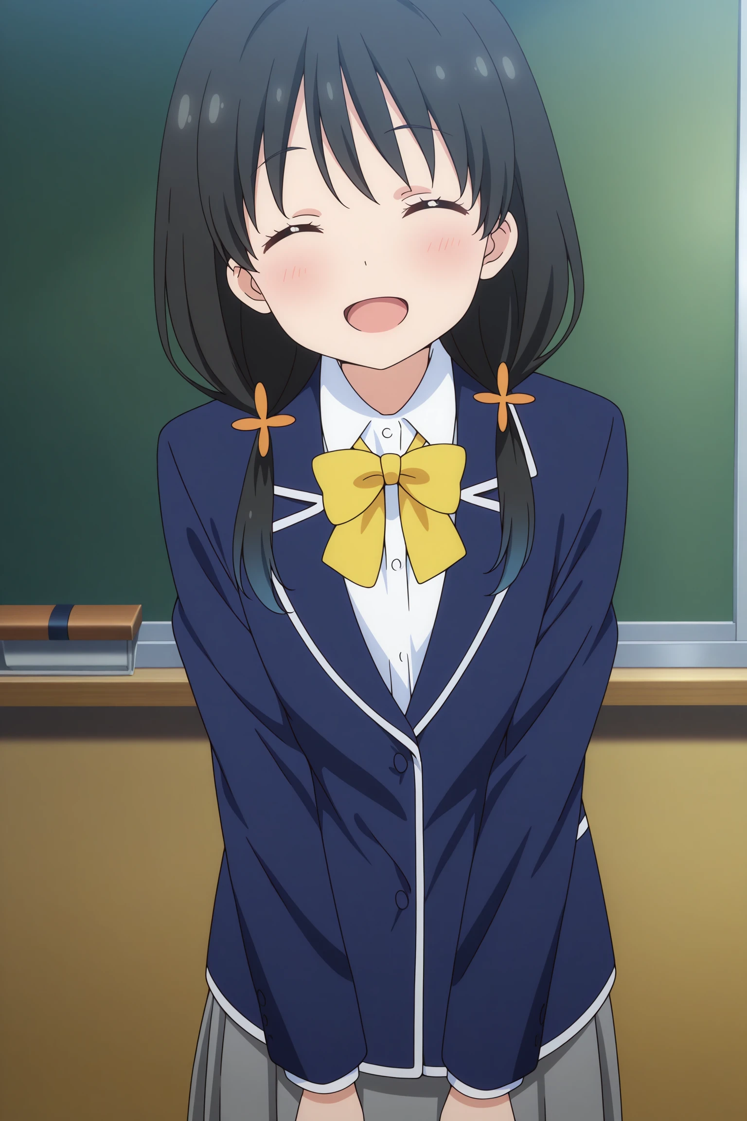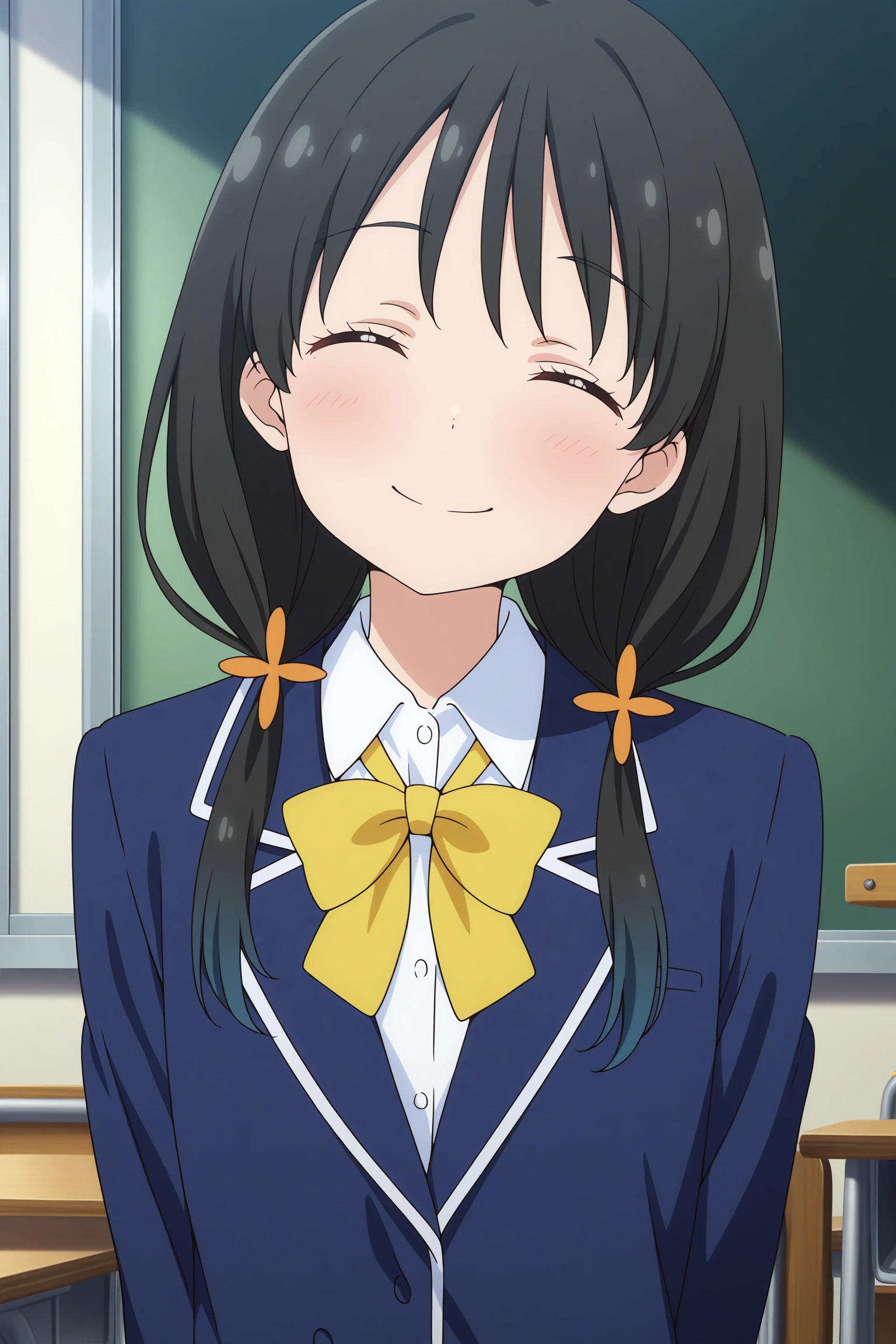 nonoka, long hair, black hair, low twintails, hair ornament, wispy bangs, closed eyes, long sleeves, blue jacket, white shirt, collared shirt, yellow bowtie, grey skirt, pleated skirt, black pantyhose, brown footwear, loafers
