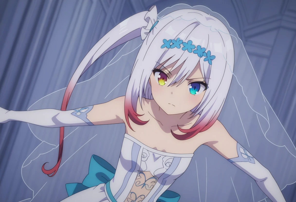 Rosetti Pricket, 1girl, solo, long hair, white hair, gradient hair, red hair, hair between eyes, hair ornament, hair scrunchie, white scrunchie, one side up, side ponytail, flipped hair, right yellow eye, heterochromia, left blue eye, small breasts
