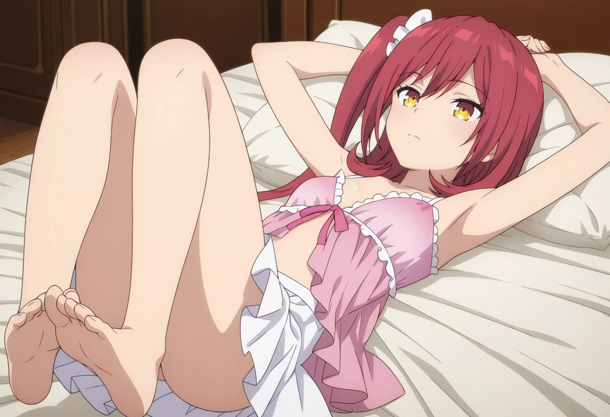 pink string negligee, pink ribbon, white skirt, barefoot