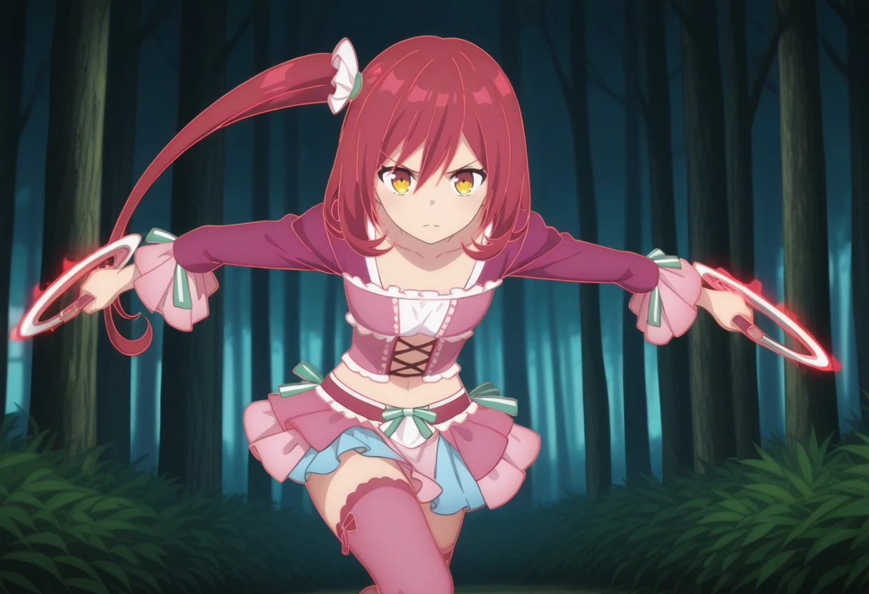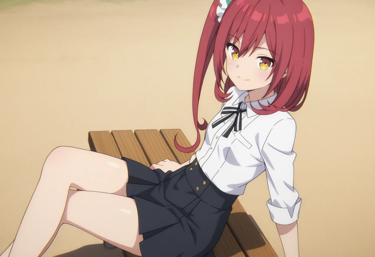 Rosetti Pricket, 1girl, solo, long hair, red hair, hair between eyes, hair ornament, hair scrunchie, white scrunchie, one side up, side ponytail, flipped hair, yellow eyes, small breasts