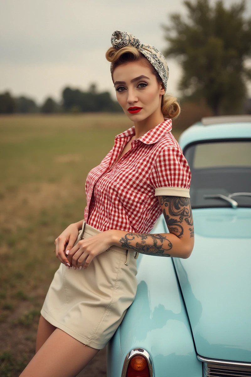 A woman in a rockabilly style. She is wearing (x) and has tattoos on her (y). [whatever scene information you would like to add].