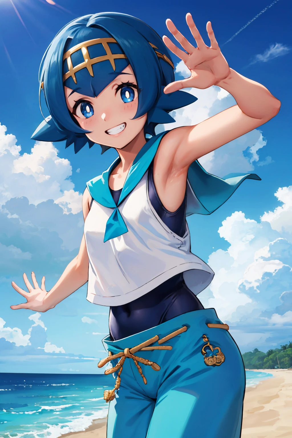 Add "hairband, blue sailor collar, sleeveless white shirt, swimsuit under clothes, blue pants" for her regular appearance.