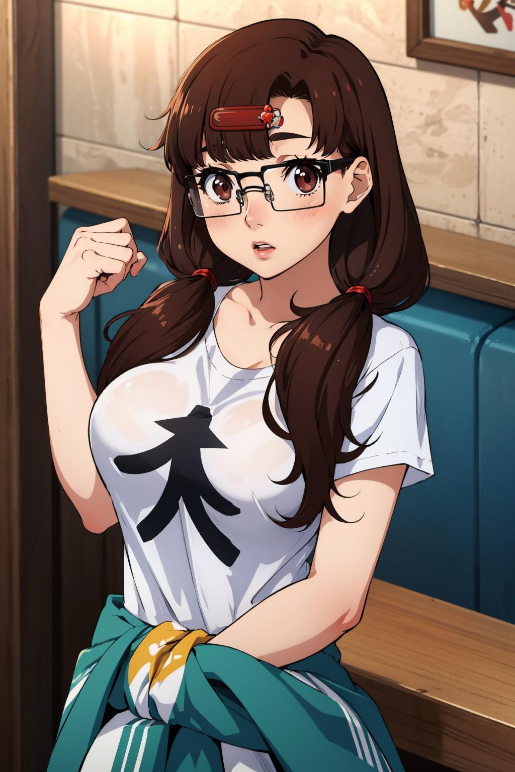 Casual attire: kanamip4, kanamicasual, long hair, hair ornament, twintails, glasses, t-shirt, clothes around waist
