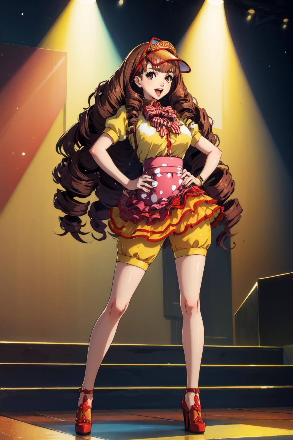 Dancing costume: kanamip4, kanamidance, long hair, drill hair, ribbon, waitress, visor cap, skirt, shorts under skirt, high heels