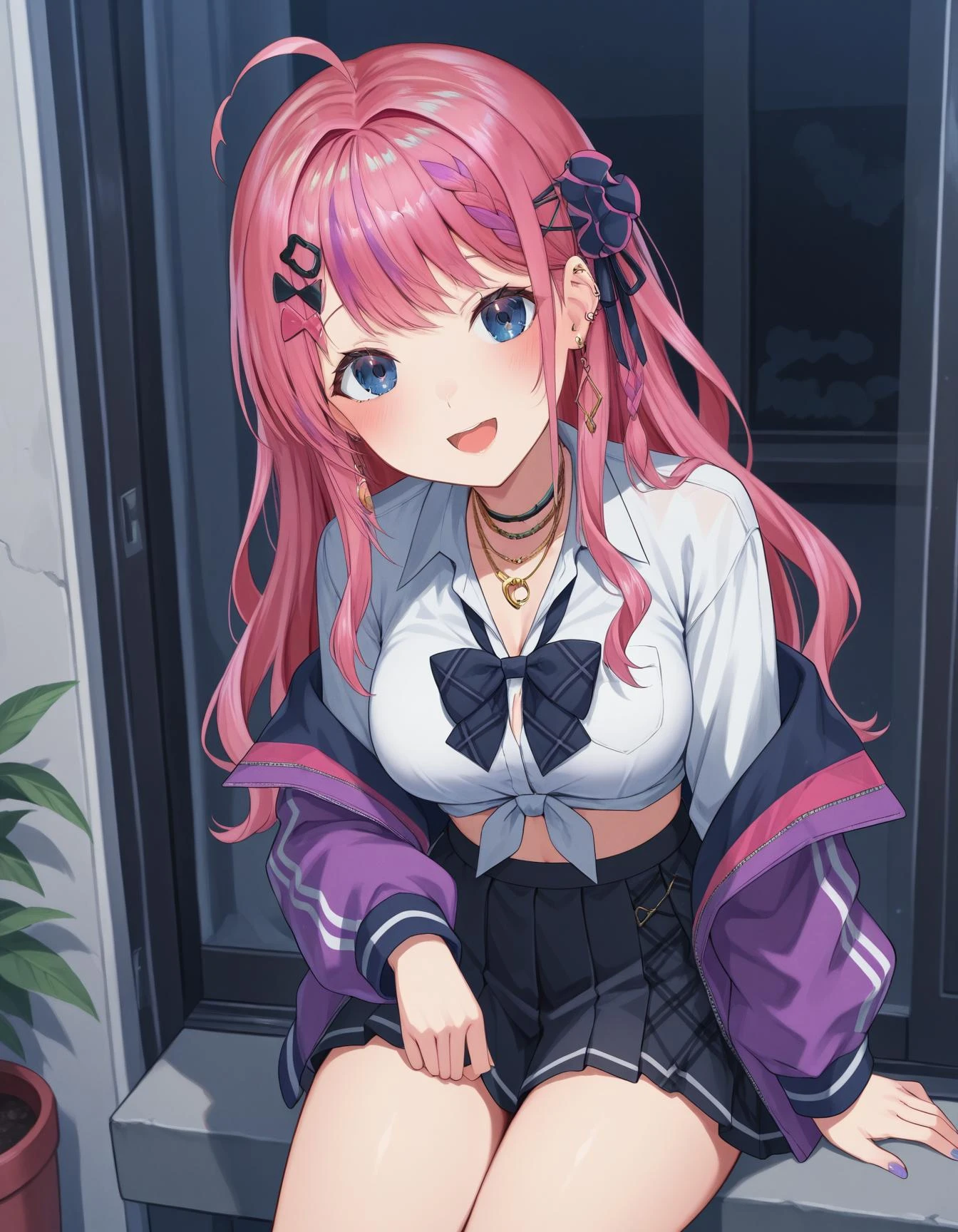 nijimeruto,large breasts,blue eyes,pink hair,gradient hair,long hair,wavy hair,ahoge,streaked hair,braid,bow hairclip,hair scrunchie,black scrunchie,ear piercing,earrings,
