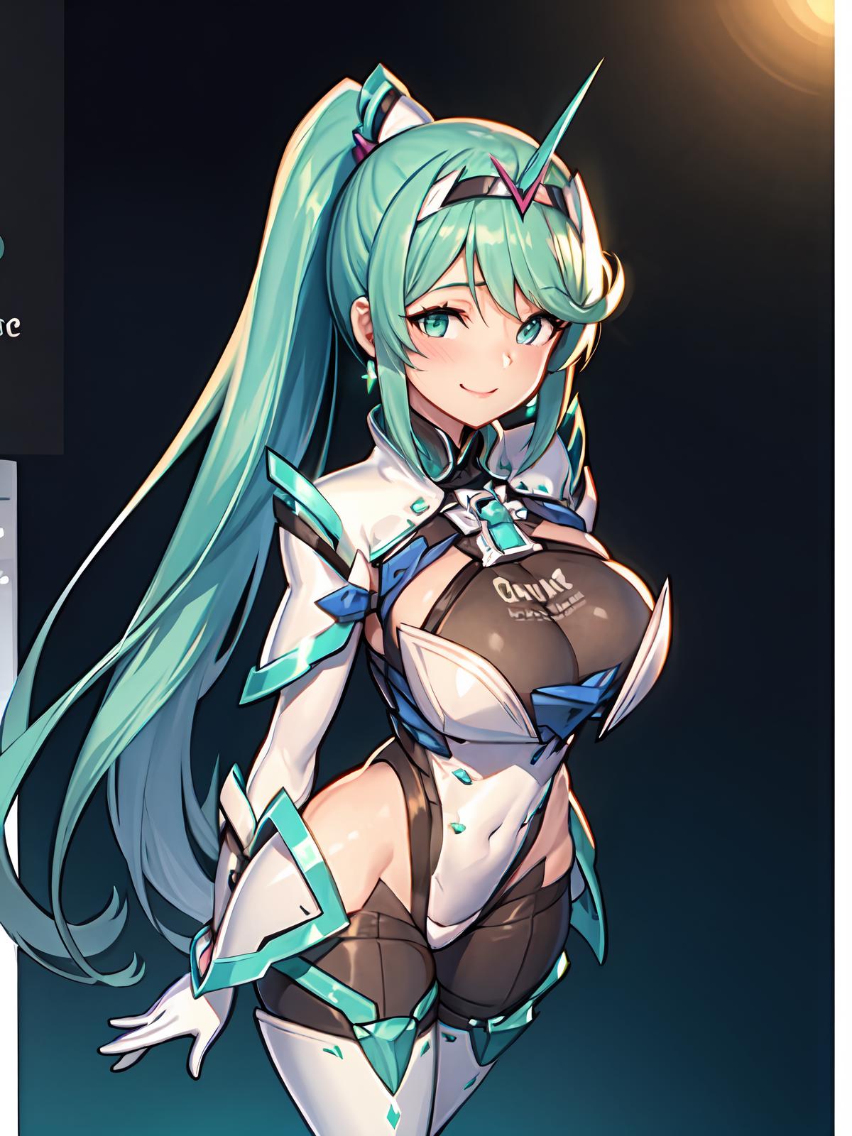 Prompts: hair ornament,gem,headpiece,high heels,armor, full body,gloves, chest jewel, green eyes, very long hair, earrings, large breast,ponytail, jewelry, tiara,swept bangs, bangs, green hair, long hair,