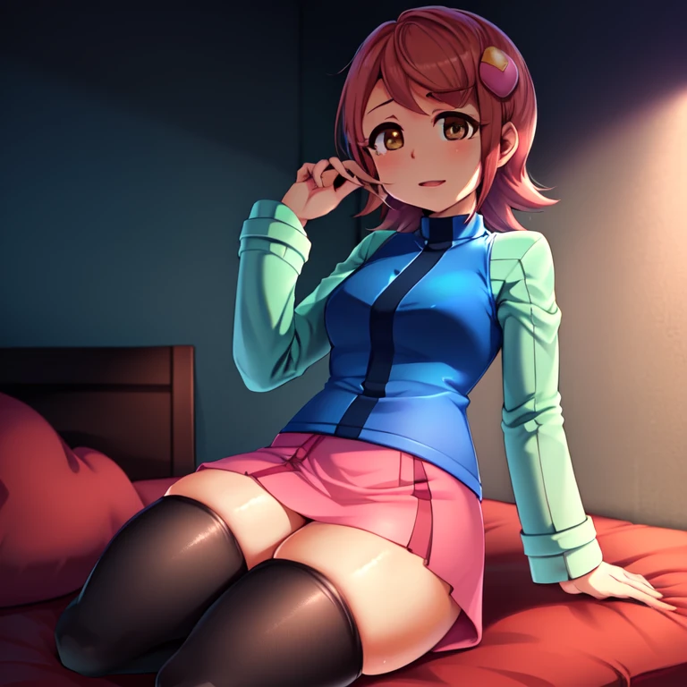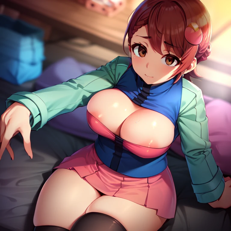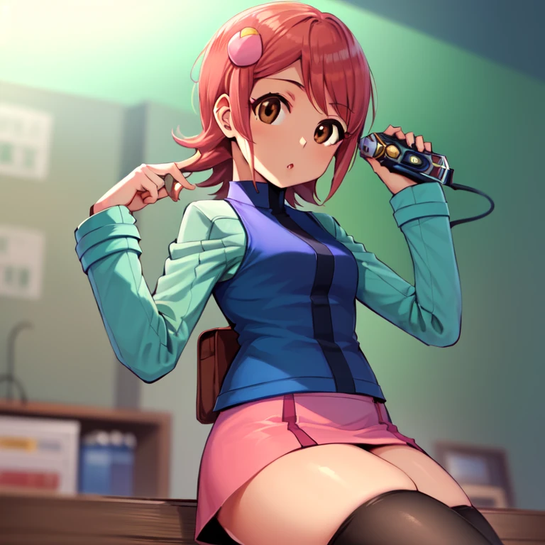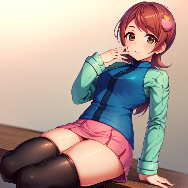 mayl_sakurai, blue jacket, green sleeves, pink skirt, hair ornament, thighhighs, brown eyes, red hair, black thighhighs, zettai ryouiki,