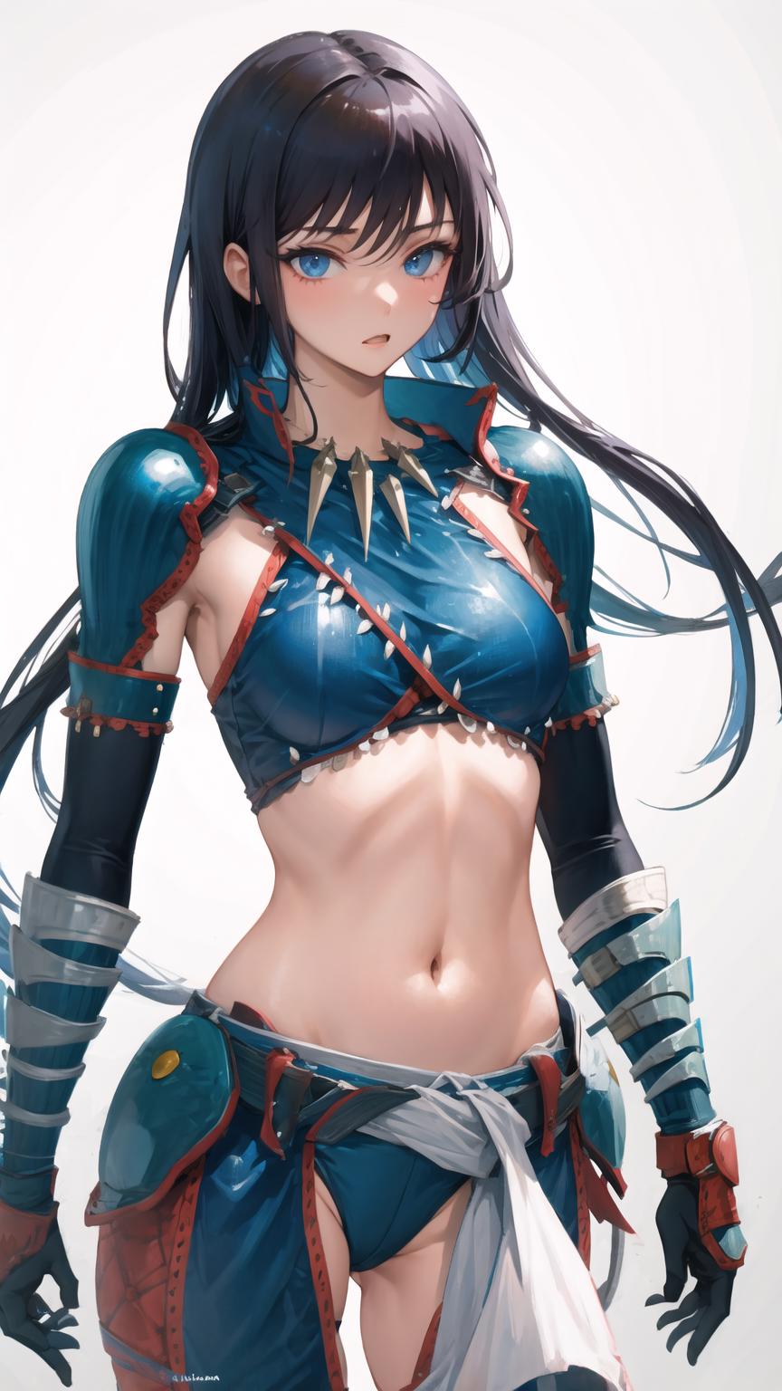 Retrained on the same dataset, is a lot more consistent on armor details now. The fishnet part over the midsection is still a swing and a miss, but sometimes comes out nice.