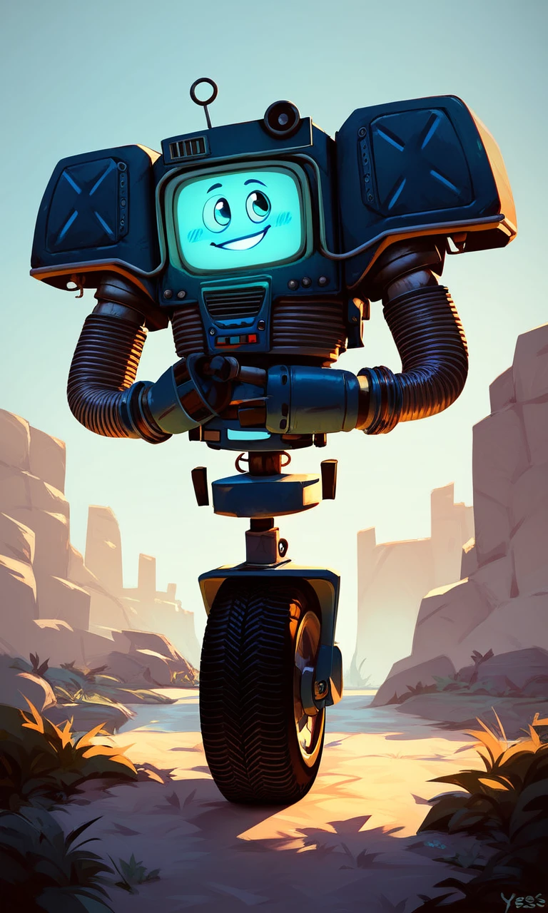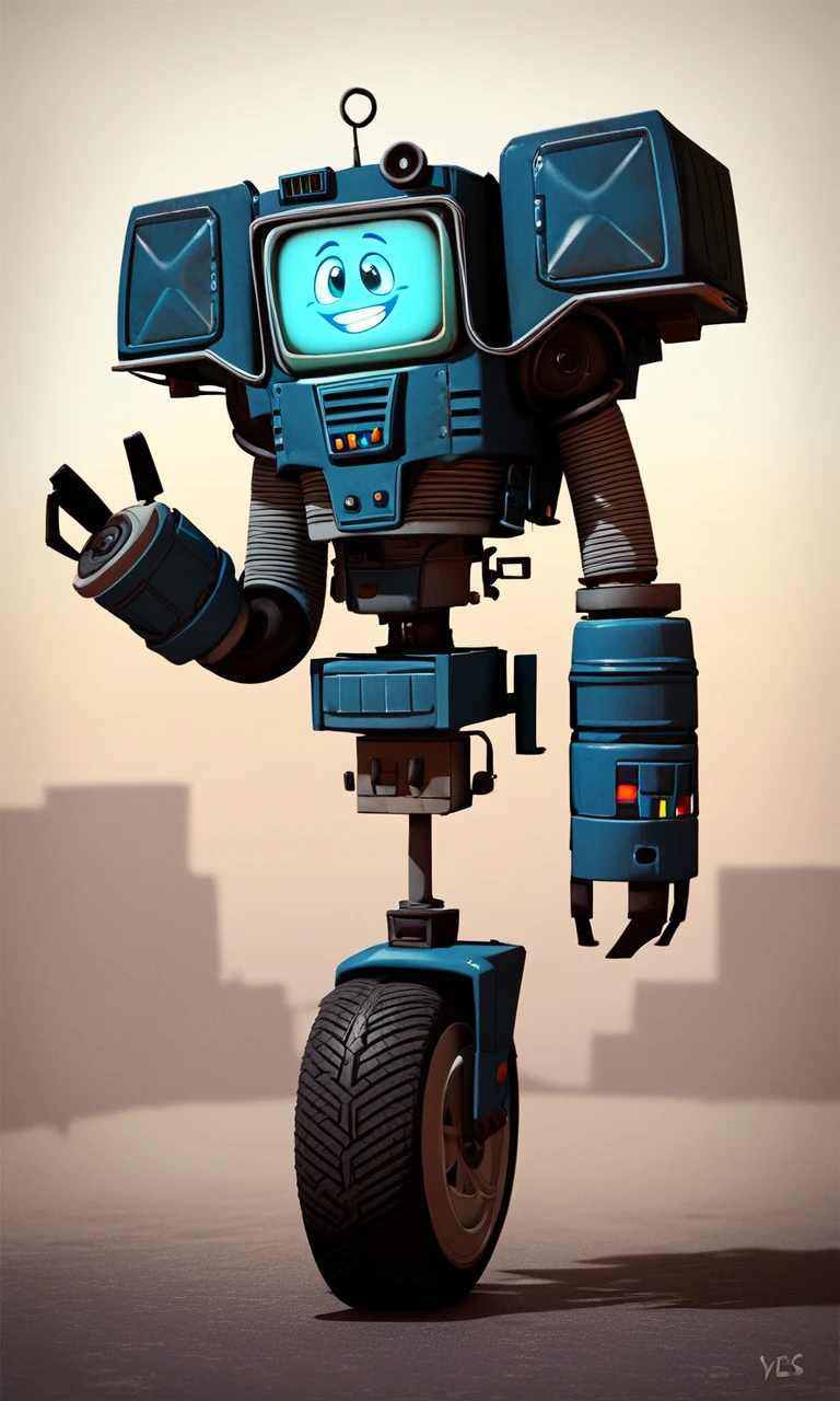 Yes man, robot, single wheel robot, blue robot, radio antenna, smile