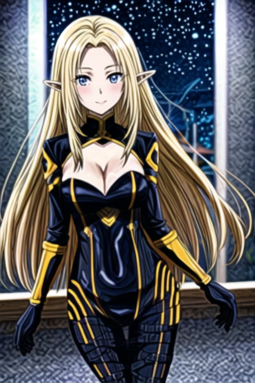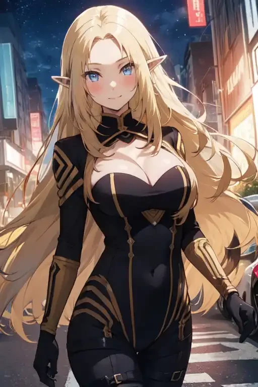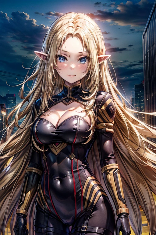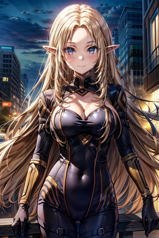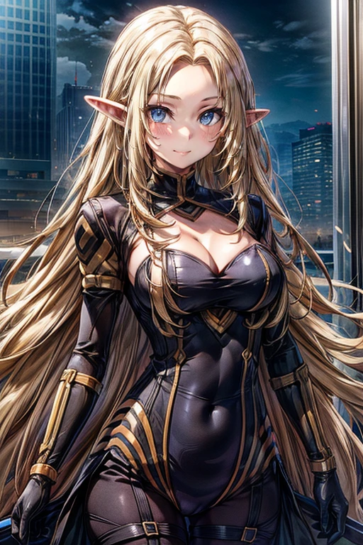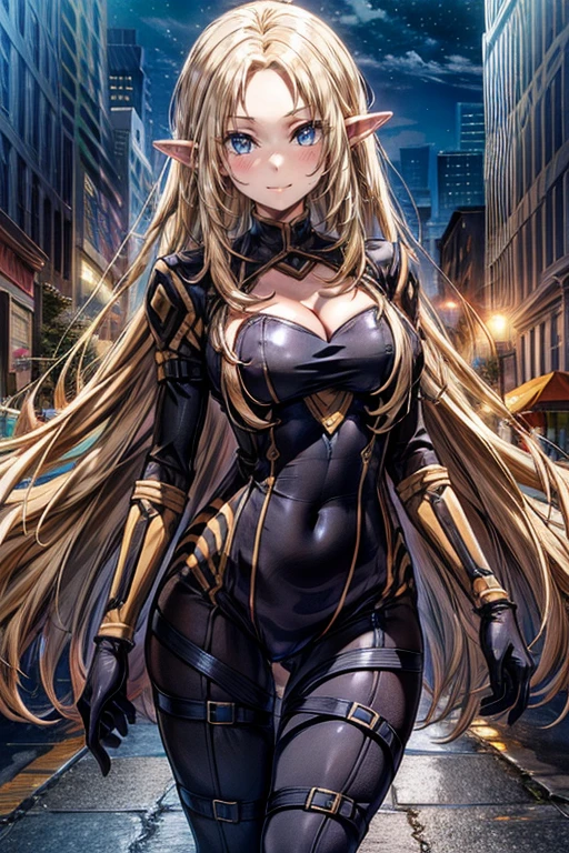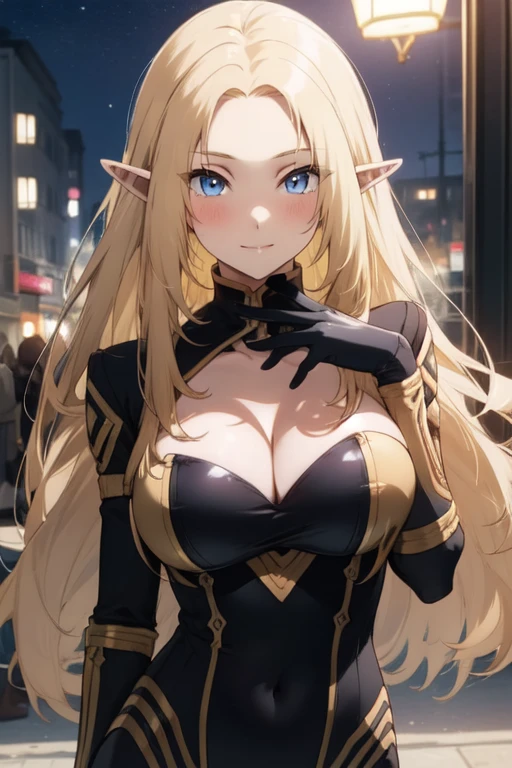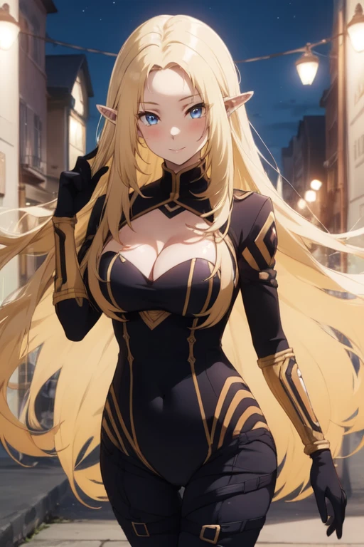 1girl,blonde hair,long hair,solo,blue eyes,pointy ears,elf,looking at viewer,very long hair,cleavage,large breasts,bodysuit,closed mouth,cleavage cutout,clothing cutout,gloves,black bodysuit,smile,City Background,medium breasts,anime coloring,blush,parted bangs,covered navel,night,