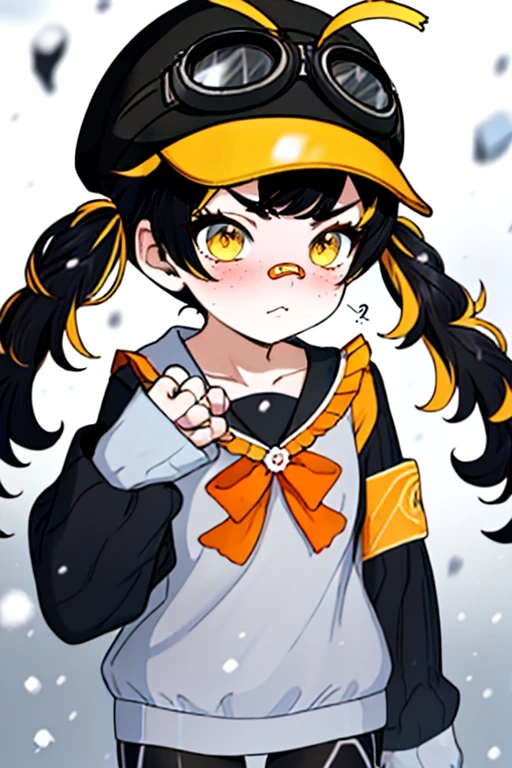 peikovt, black hair, 1girl, multicolored hair, blonde hair, twintails, yellow eyes, bandaid, bandaid on nose