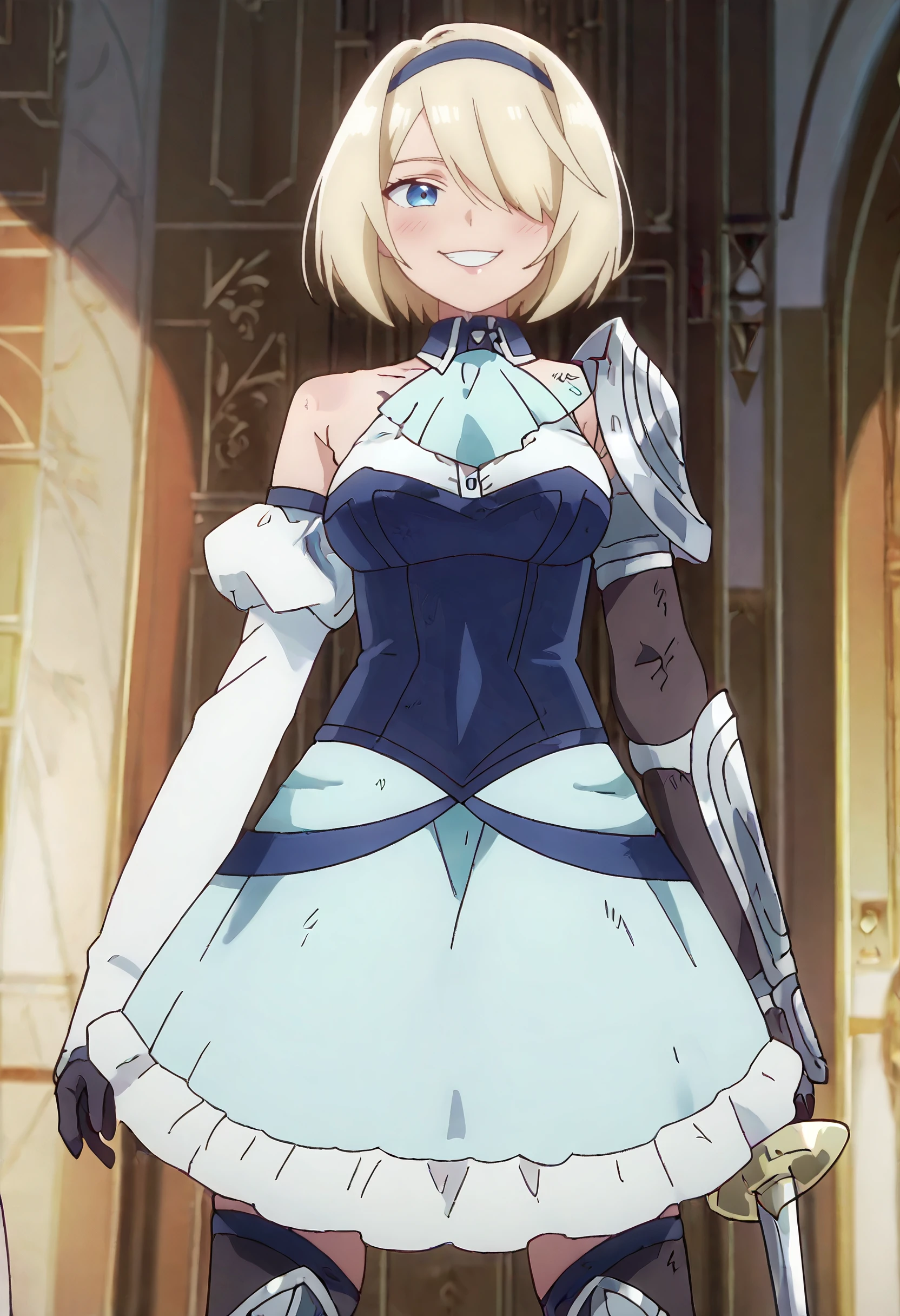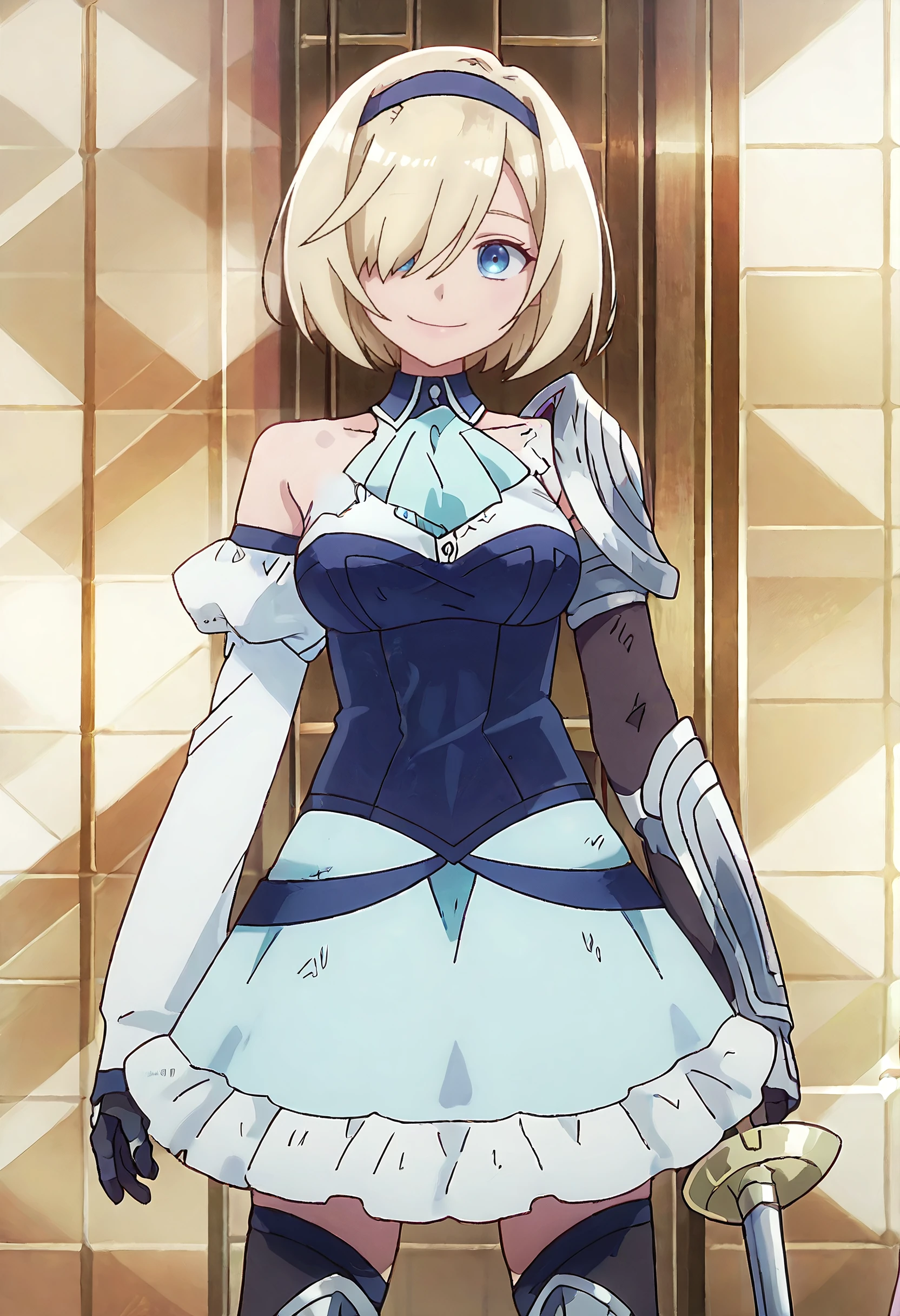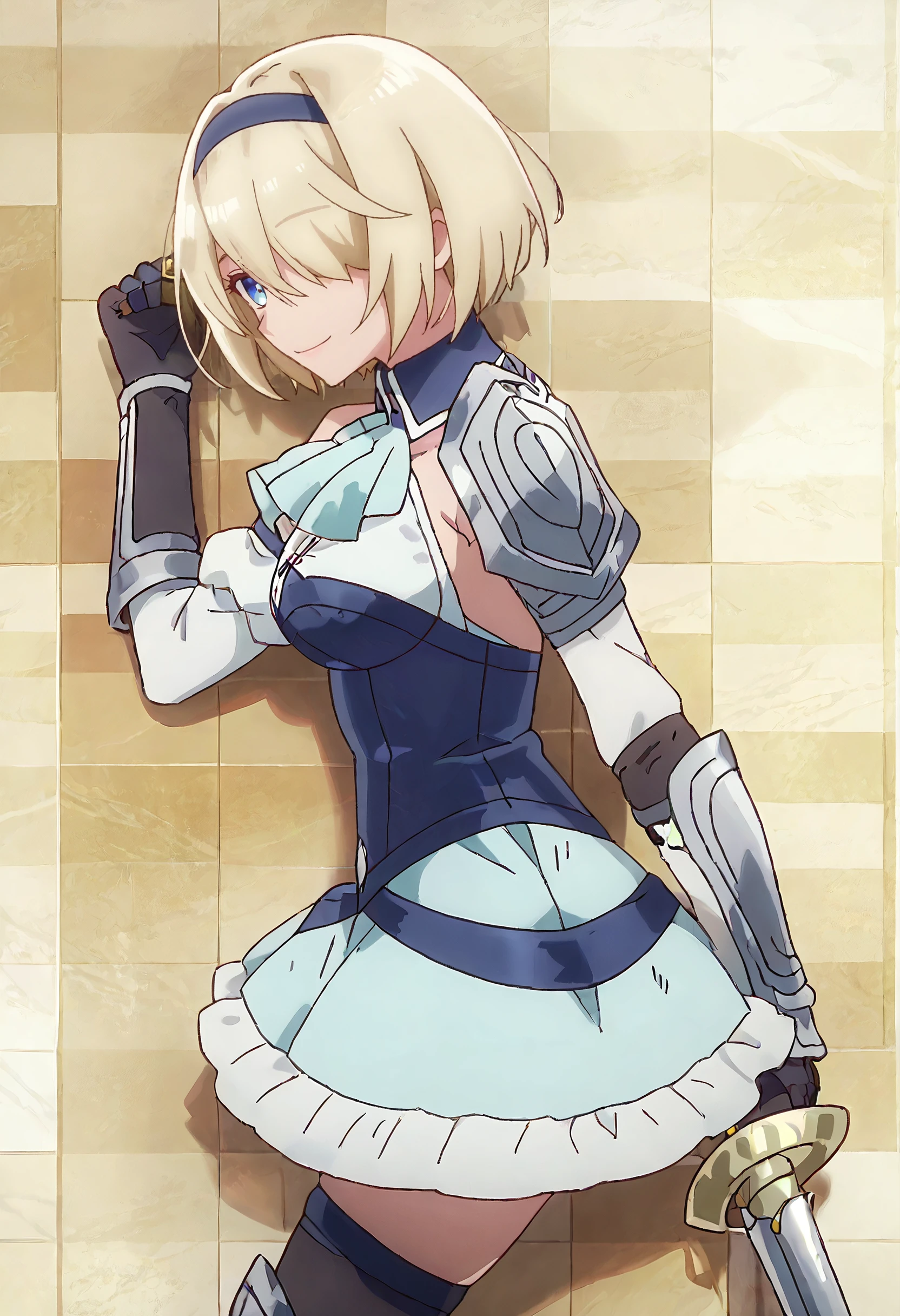 SheraOutfit, hairband, blue hairband, armor, shoulder armor, pauldrons, ascot, detached sleeves, gloves, single pauldron, bob cut, white sleeves, dress, blue ascot, gauntlets, blue collar, black gloves, single gauntlet, greaves, thighhighs, single bare shoulder, cleavage, boots, skirt, blue dress, black thighhighs,