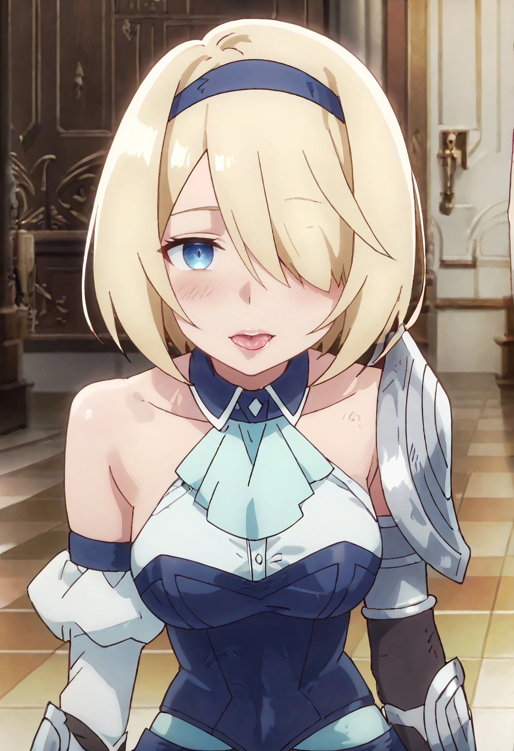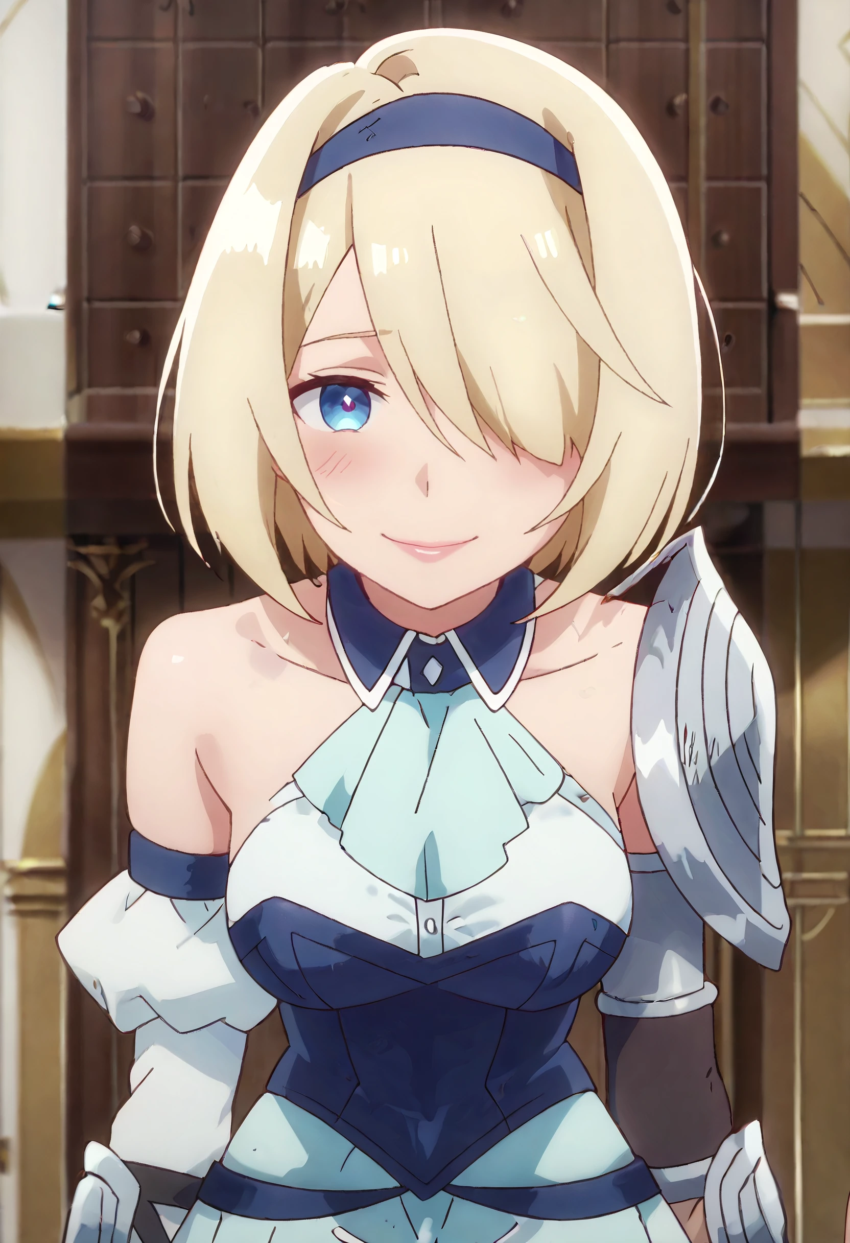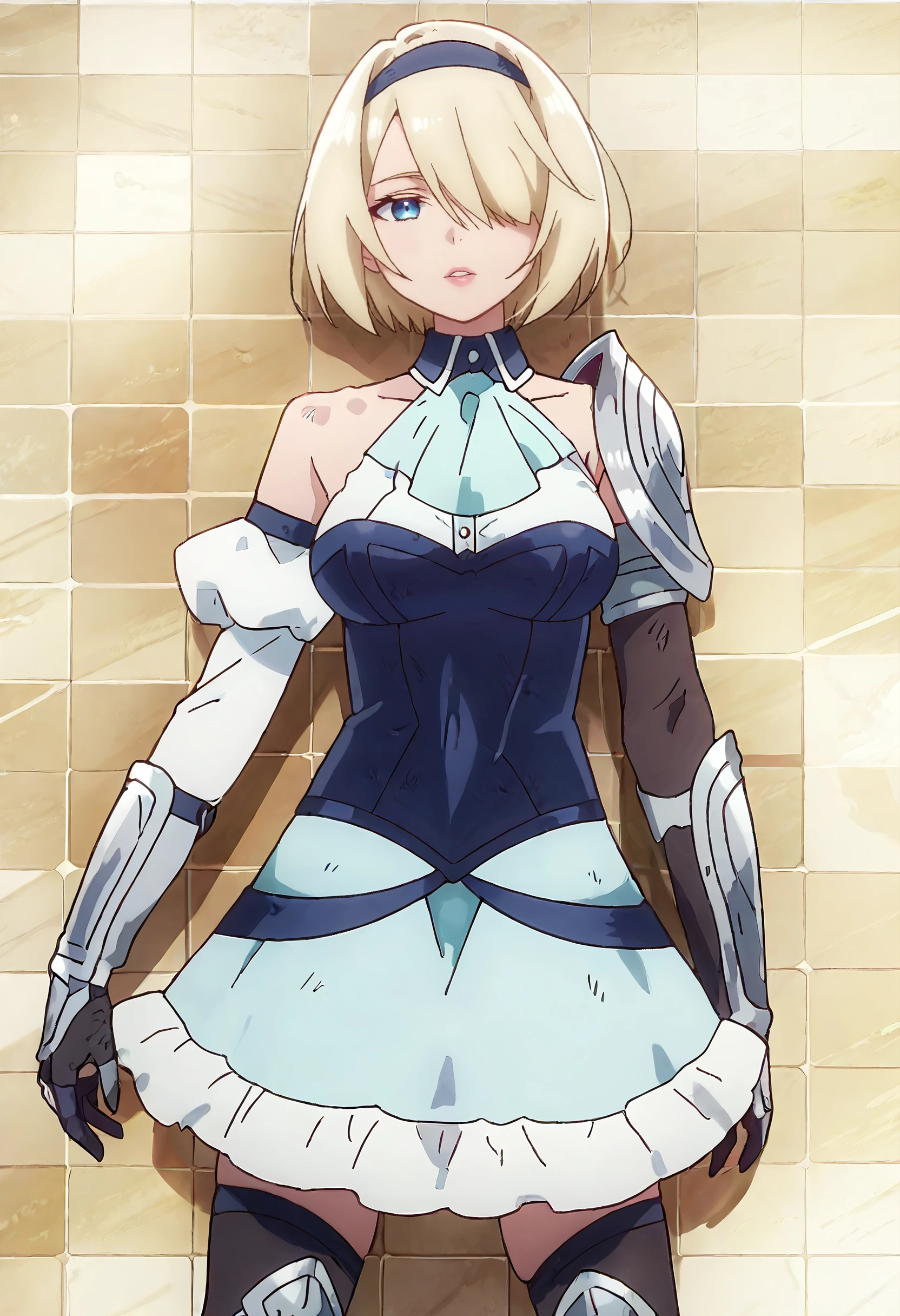 SheraOutfit, hairband, blue hairband, armor, shoulder armor, pauldrons, ascot, detached sleeves, gloves, single pauldron, bob cut, white sleeves, dress, blue ascot, gauntlets, blue collar, black gloves, single gauntlet, greaves, thighhighs, single bare shoulder, cleavage, boots, skirt, blue dress, black thighhighs,