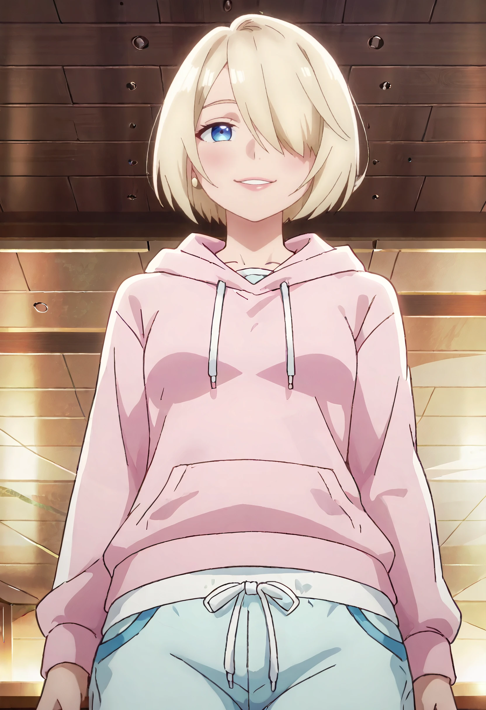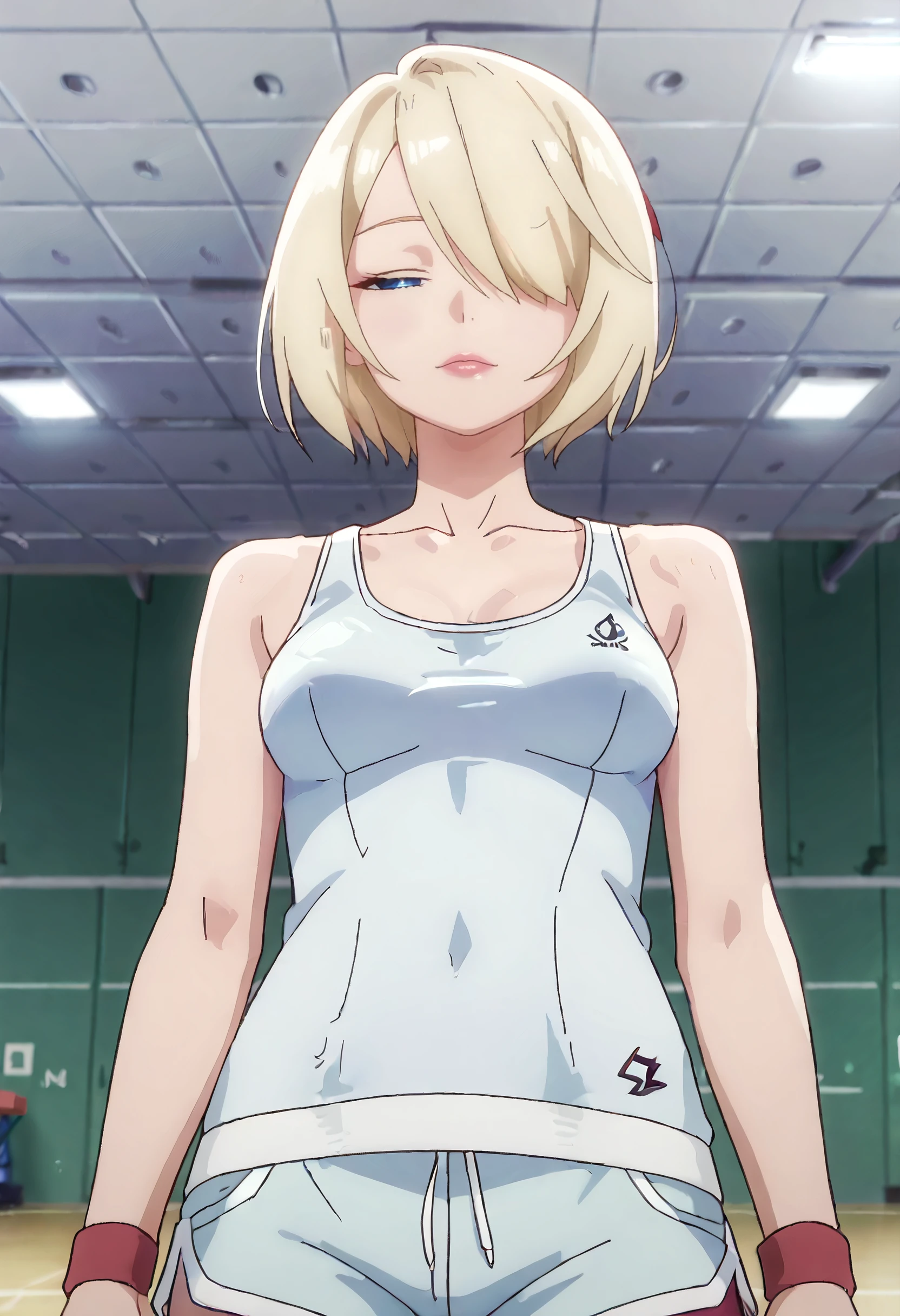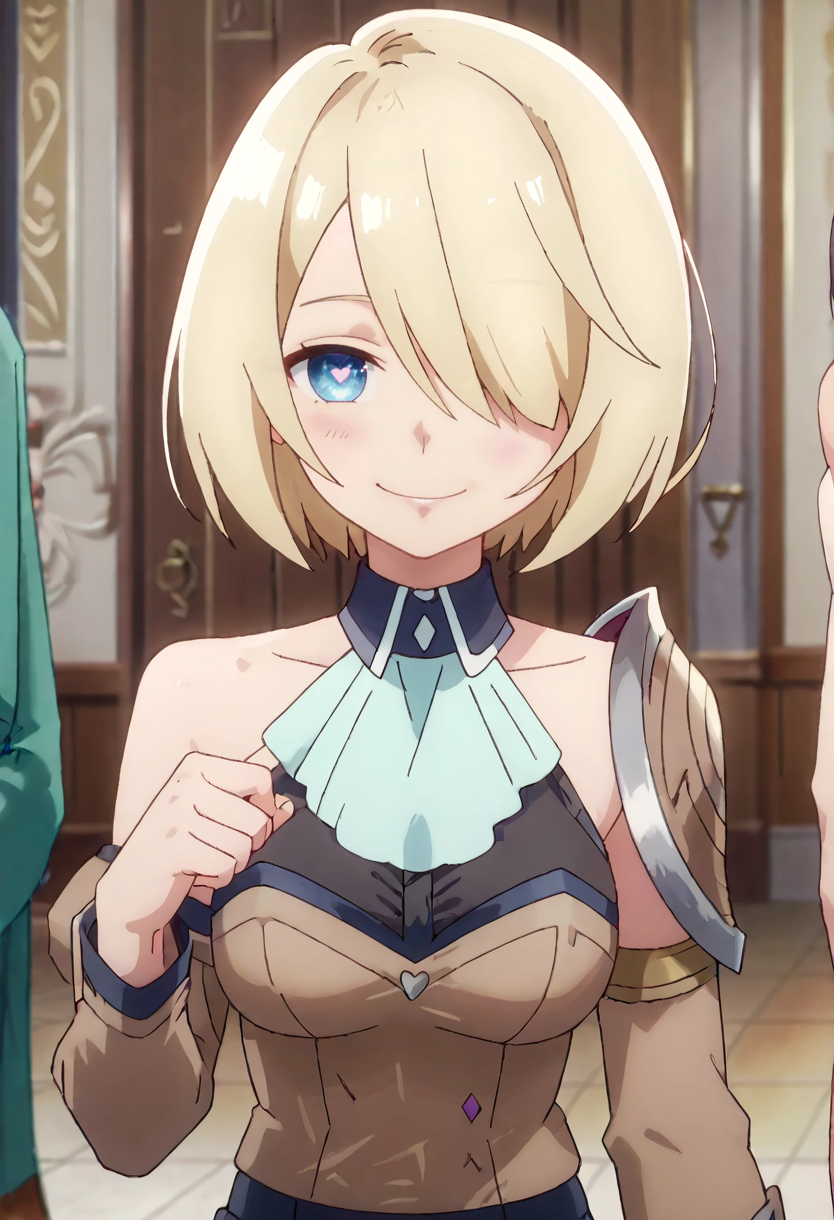 KMaShera, short hair, blonde hair, hair over one eye, blue eyes,
