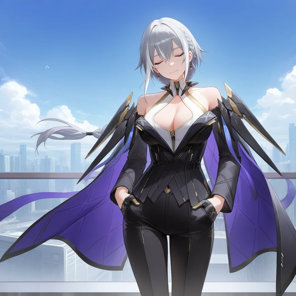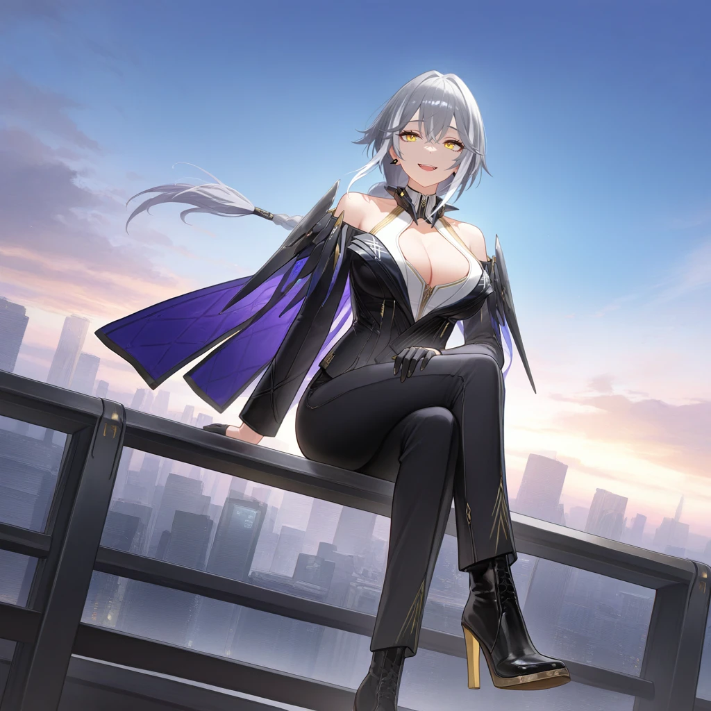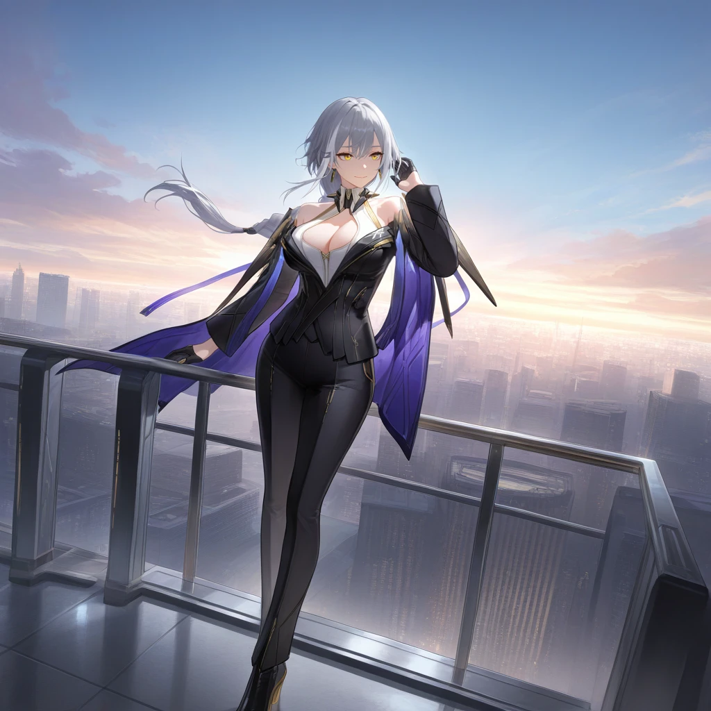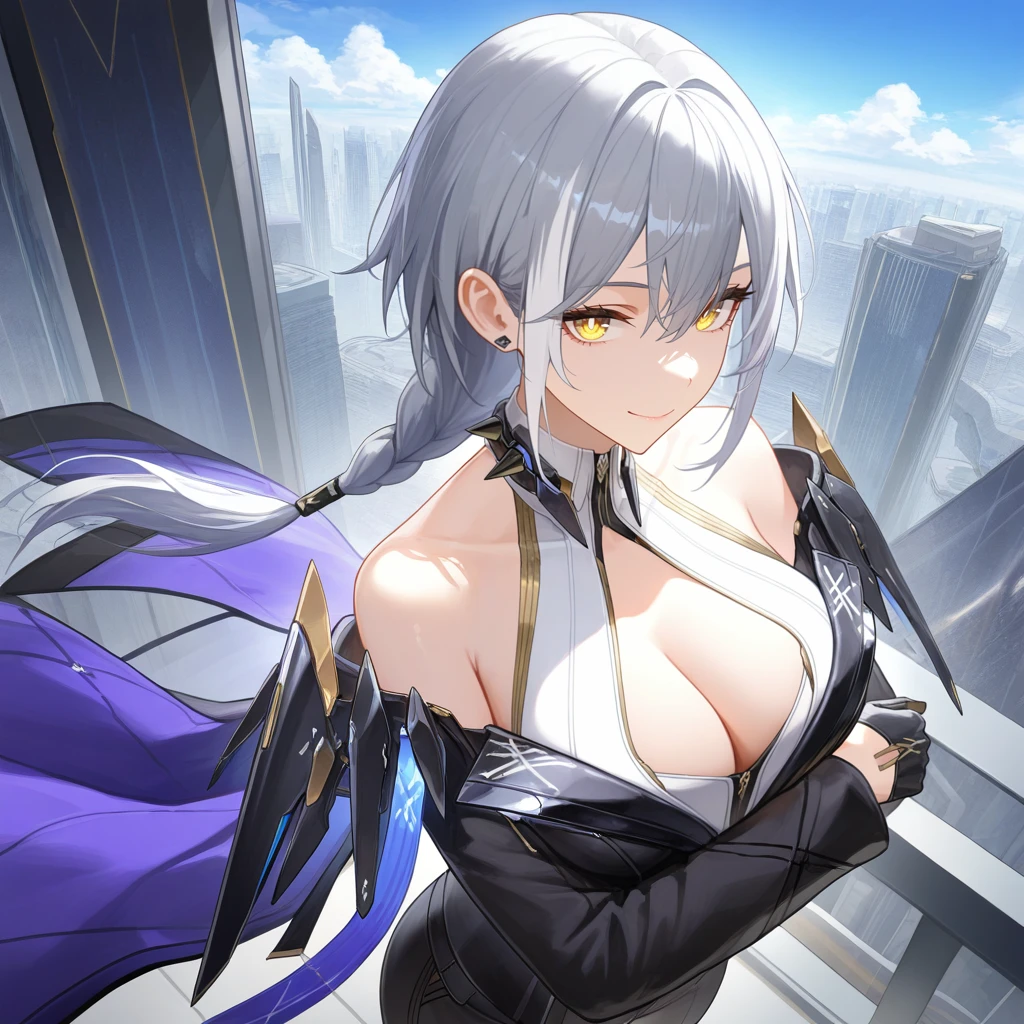 OdinAG, grey hair, yellow eyes, white streaks, streaked hair, braided ponytail, braid, low ponytail, black jacket, jacket, white shirt, sleeveless shirt, halterneck, earrings, gold trim, cleavage cutout, collared shirt, ???? shoulders, off-shoulder jacket, spiked collar, cleavage, purple cape, detached cape, black sleeves, long sleeves, half gloves, black gloves, black pants, pants,The results of your generations are dependent on the additional LoRAs, weights, and models you use, so it may not work or come out as consistent as my sample images.