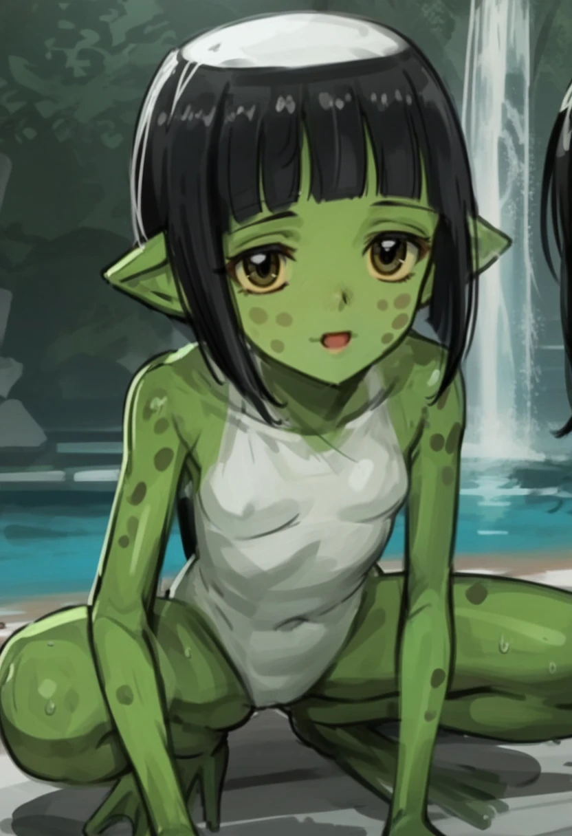 k4ppa, green skin, 1girl, pointy ears,black hair, monster girl, short hair, kappa, yellow eyes,blunt bangs,