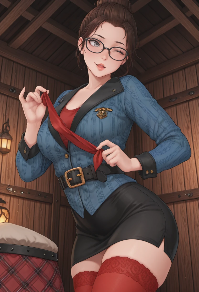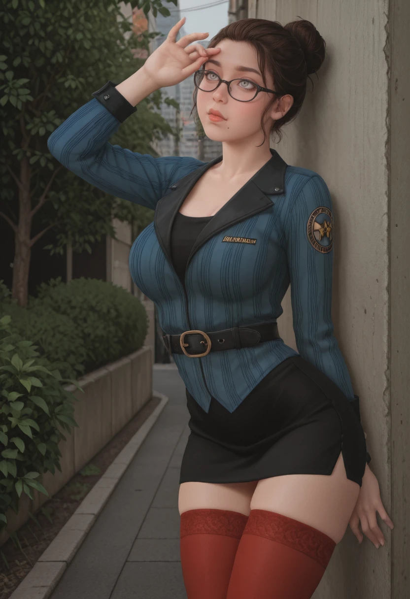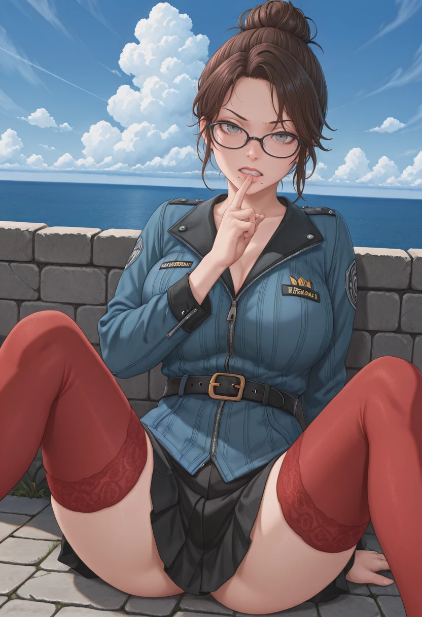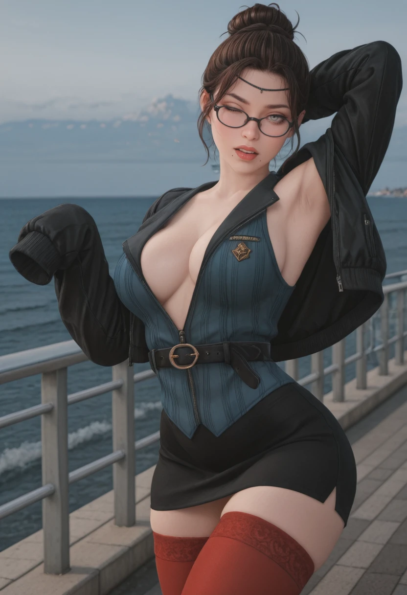 belt, jacket, miniskirt, red thighhighs