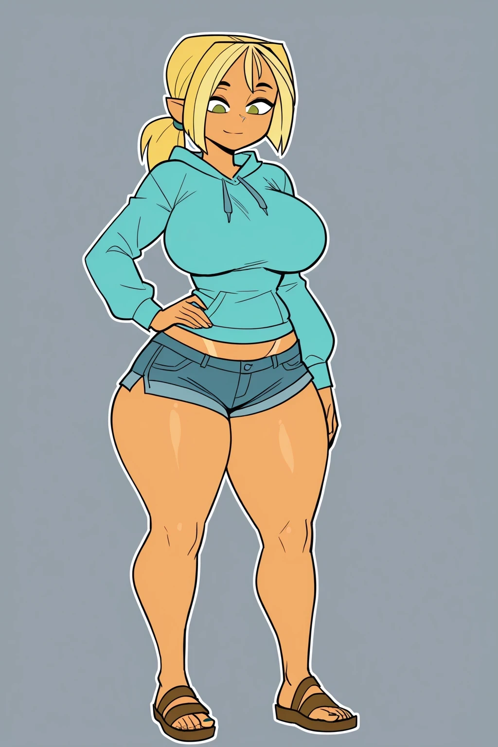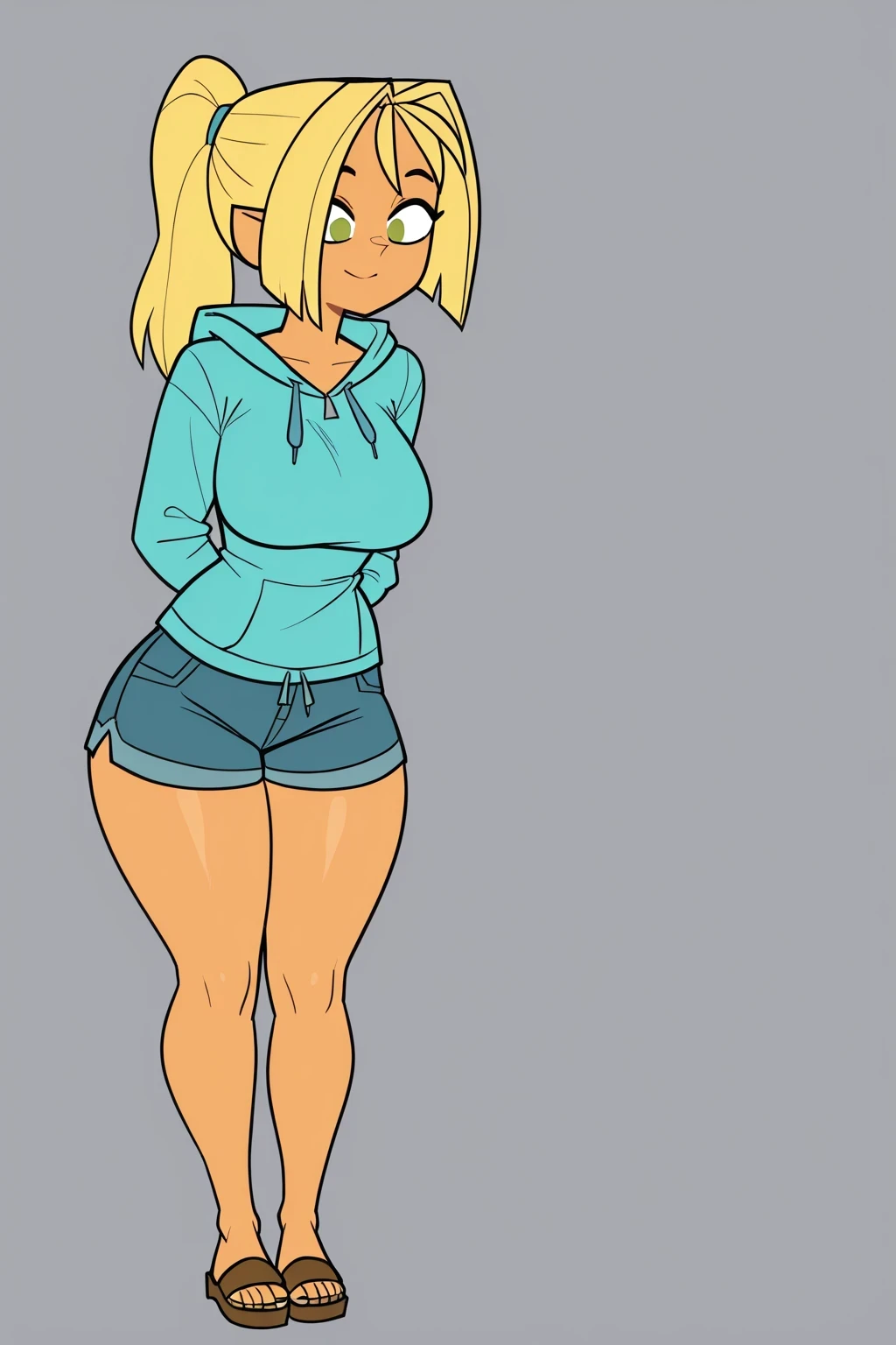 BridgetteTDR, 1girl, blonde hair in a ponytail, fairly tanned skin, olive green eyes, turquoise blue pullover hoodie, blue-gray drawstring denim shorts, brown sandals, short, chibi,