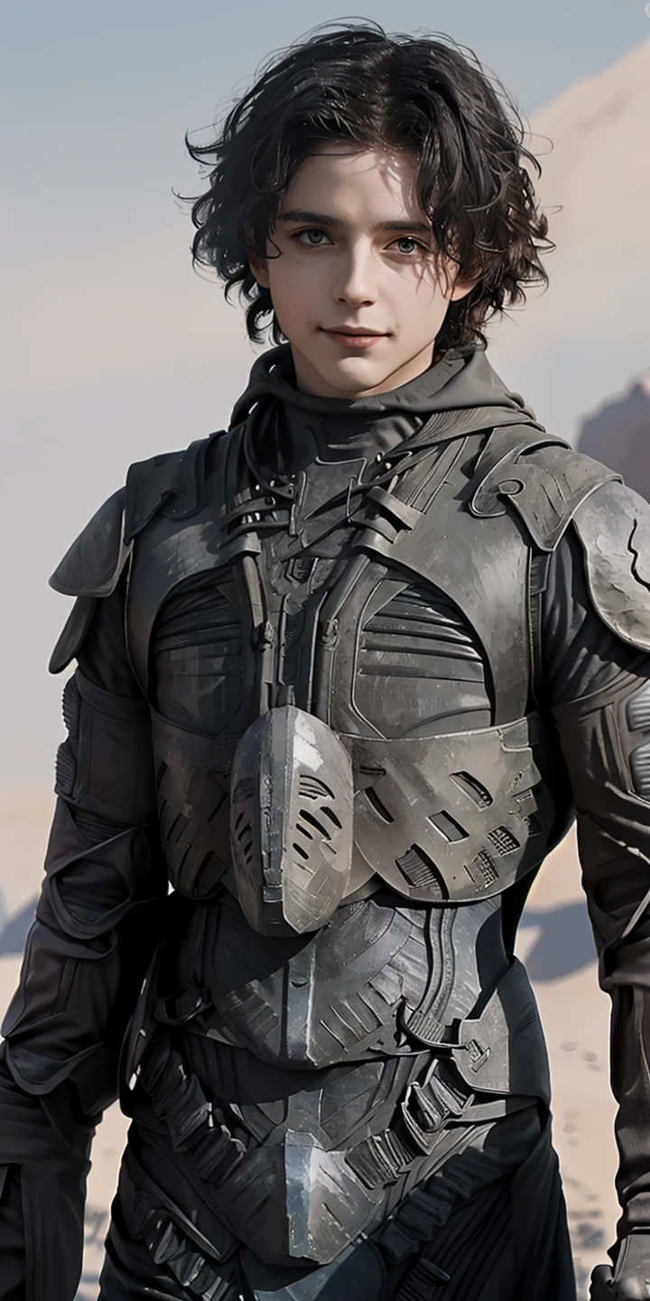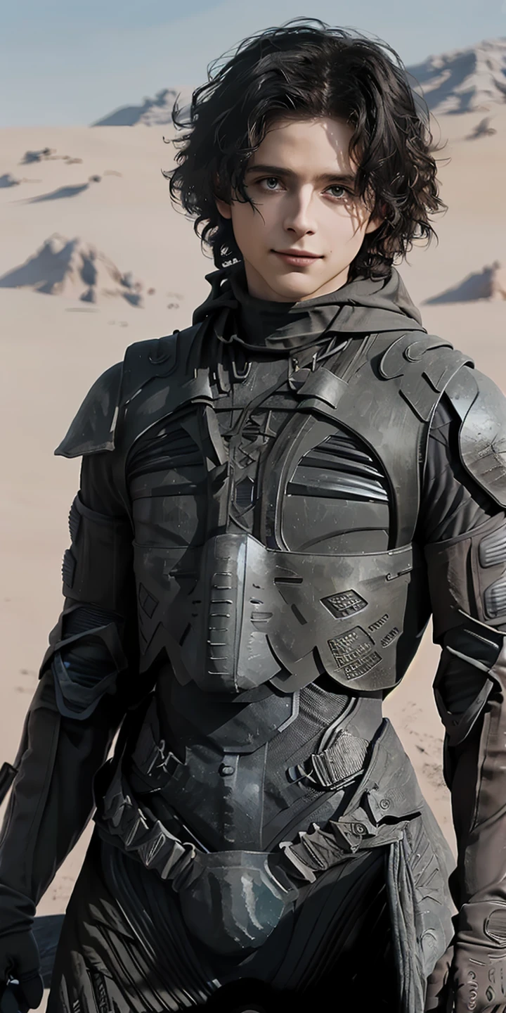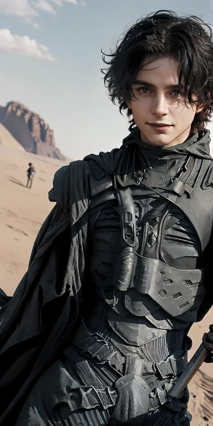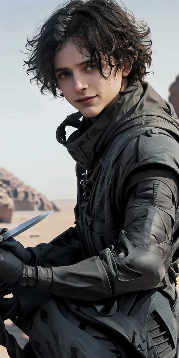(((masterpiece))),(((best quality))),((ultra-detailed)),(((lots of details))),(beautiful detailed girl),((Epic Light and Shadow)),cinematic angle,oil painting,(illustration),(detailed light),((an extremely delicate and beautiful)), fantasyArt,DigitalArt, Paul Atreides,Dune,solo,1boy,male focus,black hair,knife,holding,weapon,holding knife,gloves,looking at viewer,short hair,armor,holding weapon,smile,animification,blurry background, Dune,Dune movie,Paul Etrudy,big scene,desert,Panorama, <lora:Paul Atreides:0.7>,(dynamic angle:1.5),