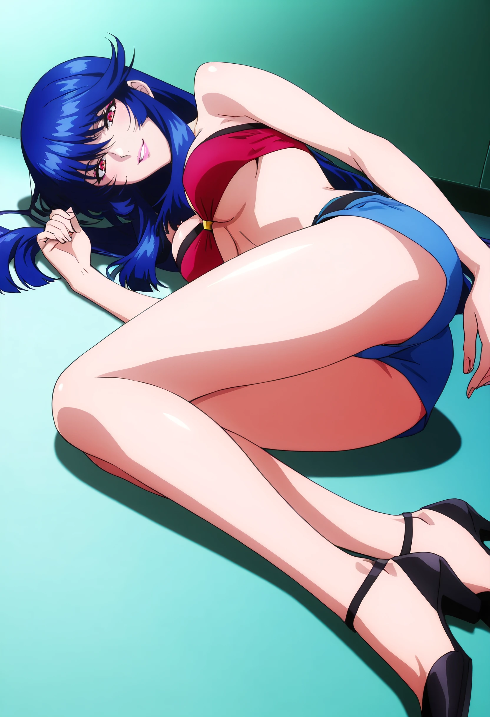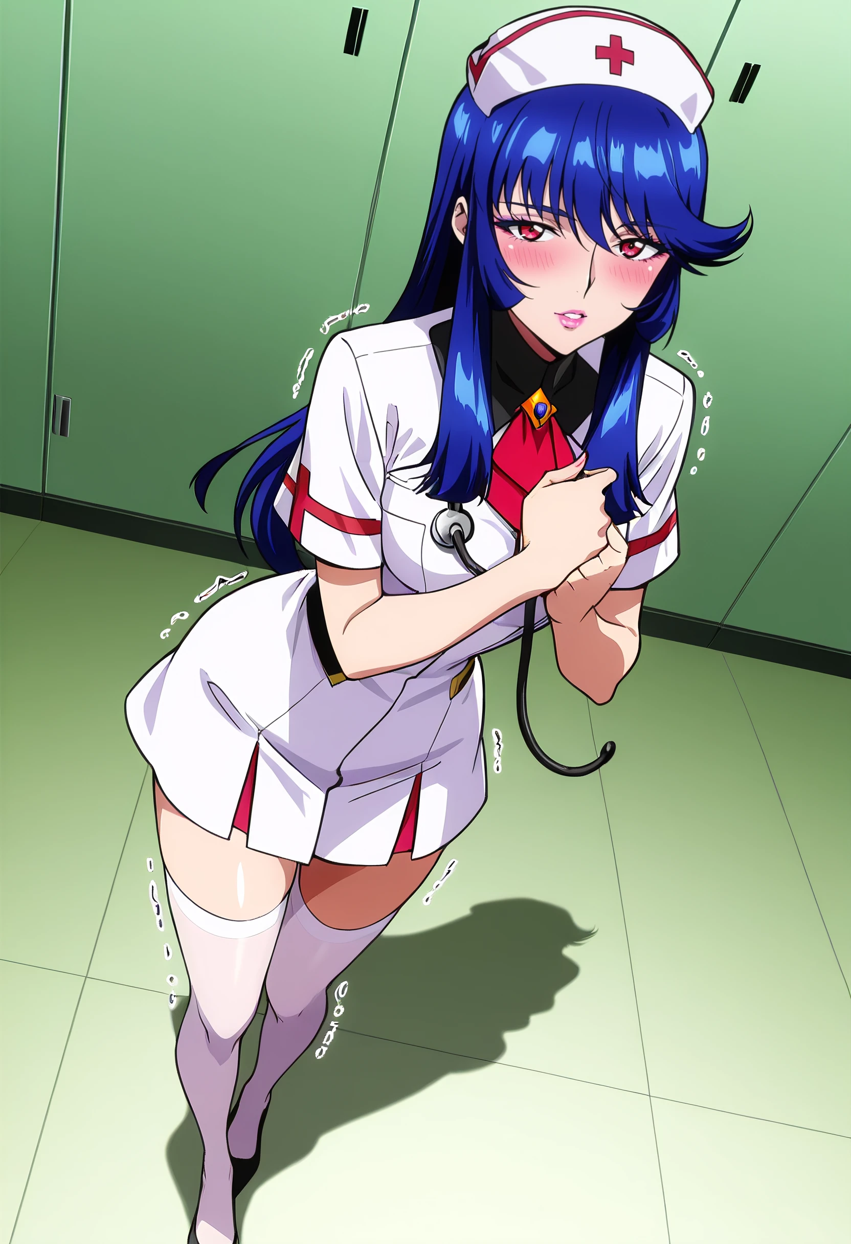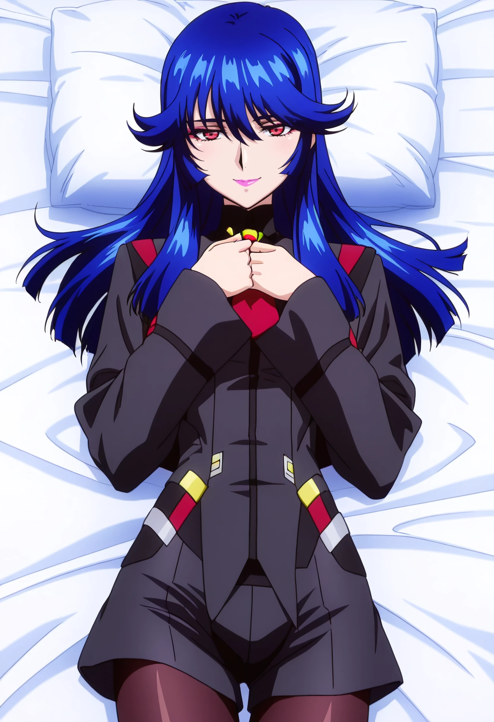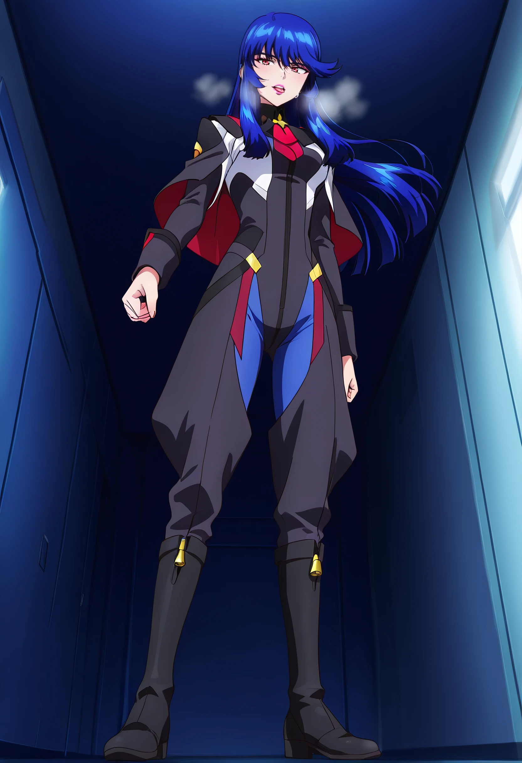 KSGIngrid, blue hair, long hair, multicolored hair, red eyes, bangs, hair between eyes, sidelocks, lipstick, makeup, pink lips,