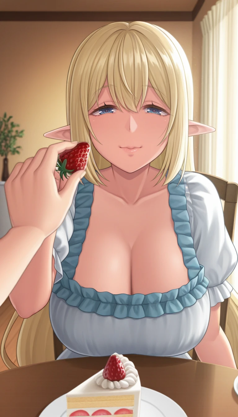 aria_bhnko, blue eyes, blonde hair, long hair, hair between eyes, pointy ears, elf, white nightgown, puffy short sleeves, blue frills, cleavage, square neckline,Description