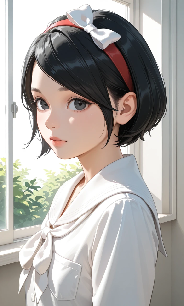 Emily, 1girl, short hair, black hair, black eyes, hair ribbon, white ribbon, red hairband
