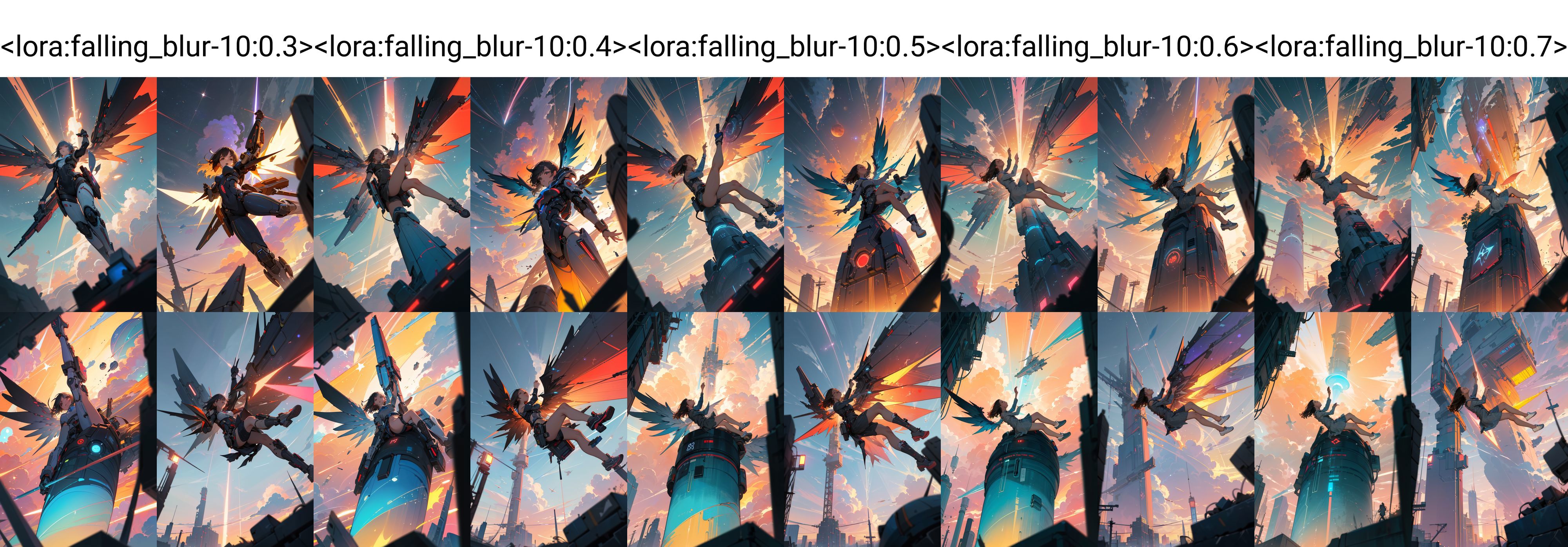 今天是端午节,祝大家端午安康。做了一整天falling的新版本,该版本考虑到了天空占比问题以及景深。并且训练集扩大了三倍,每张图片都使用tile模型放大过。效果很可观。降低权重、不使用触发词应该可以只得到风景(但在一个小时的测试中忘记试了),赛博朋克,超现实等应该都可以生成。