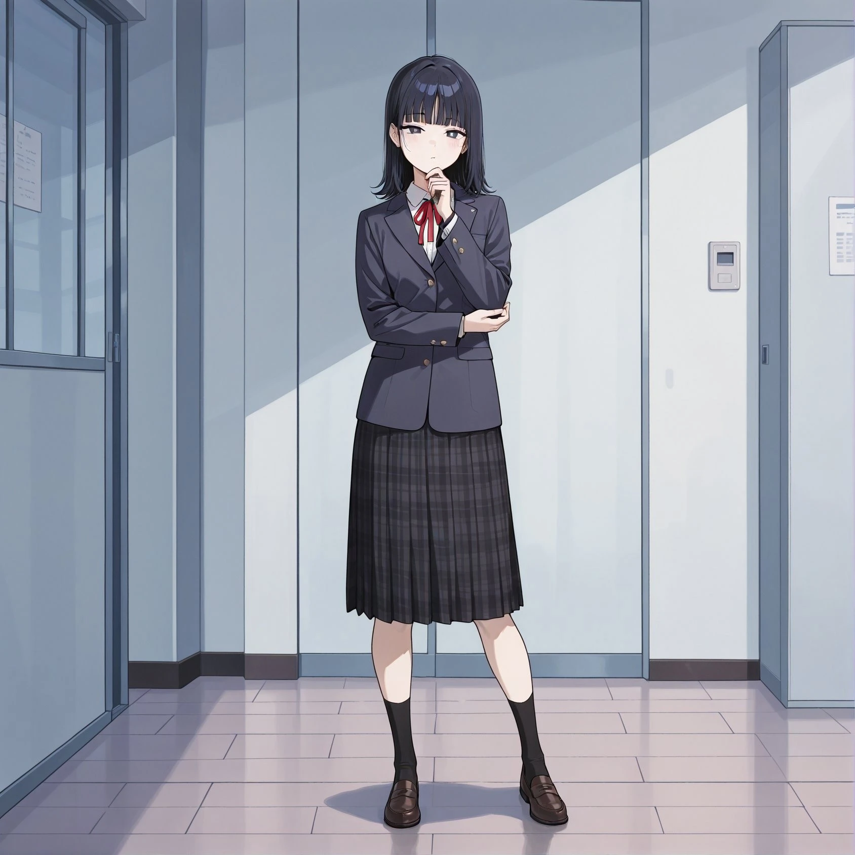 dark plaid long skirt, black socks, loafers,school uniform,looking at viewer,