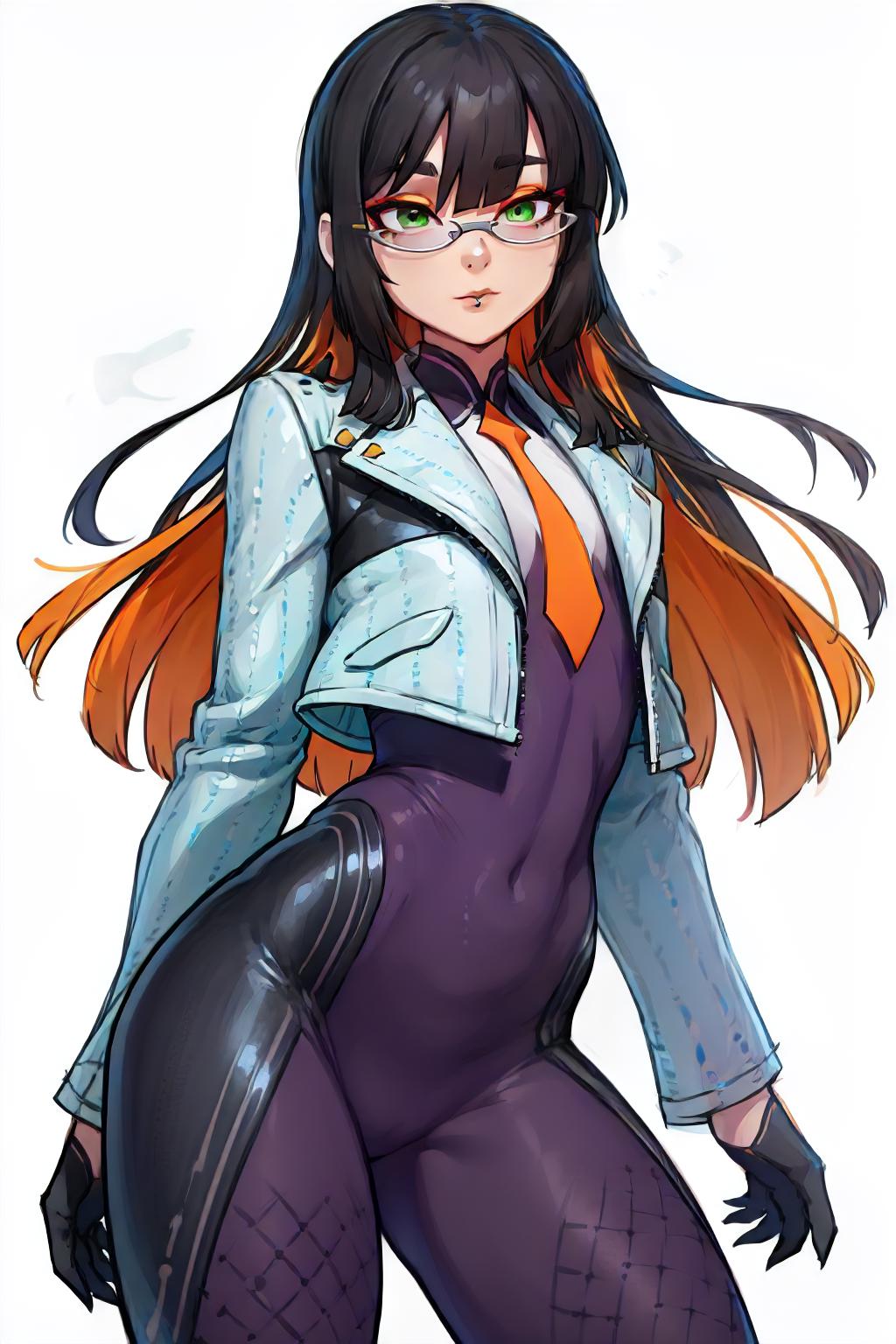 Character: Daraku, makeup, glasses, long hair, two-tone hair (add "black hair" and "orange hair" if you're having trouble to make it appear correctly)