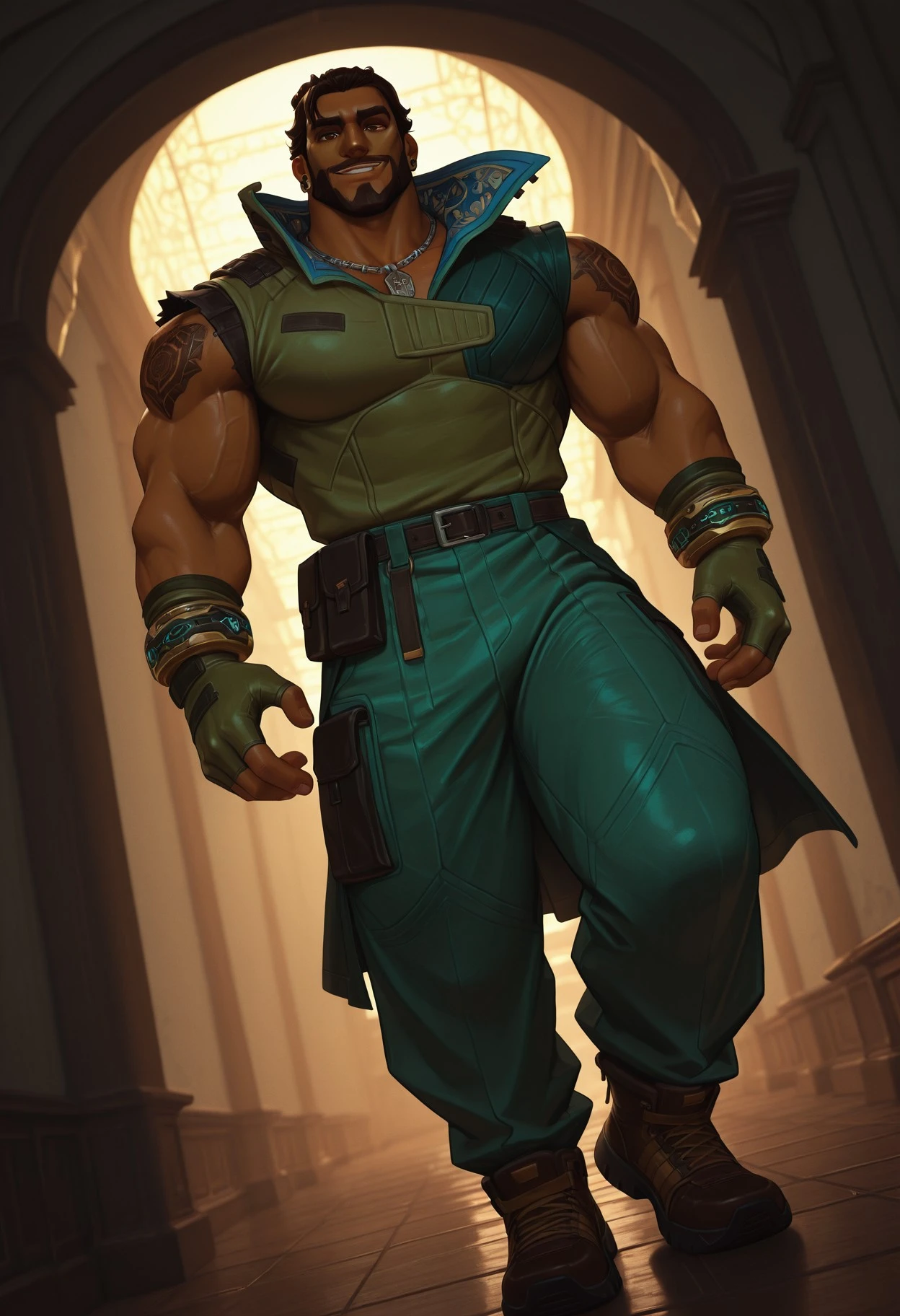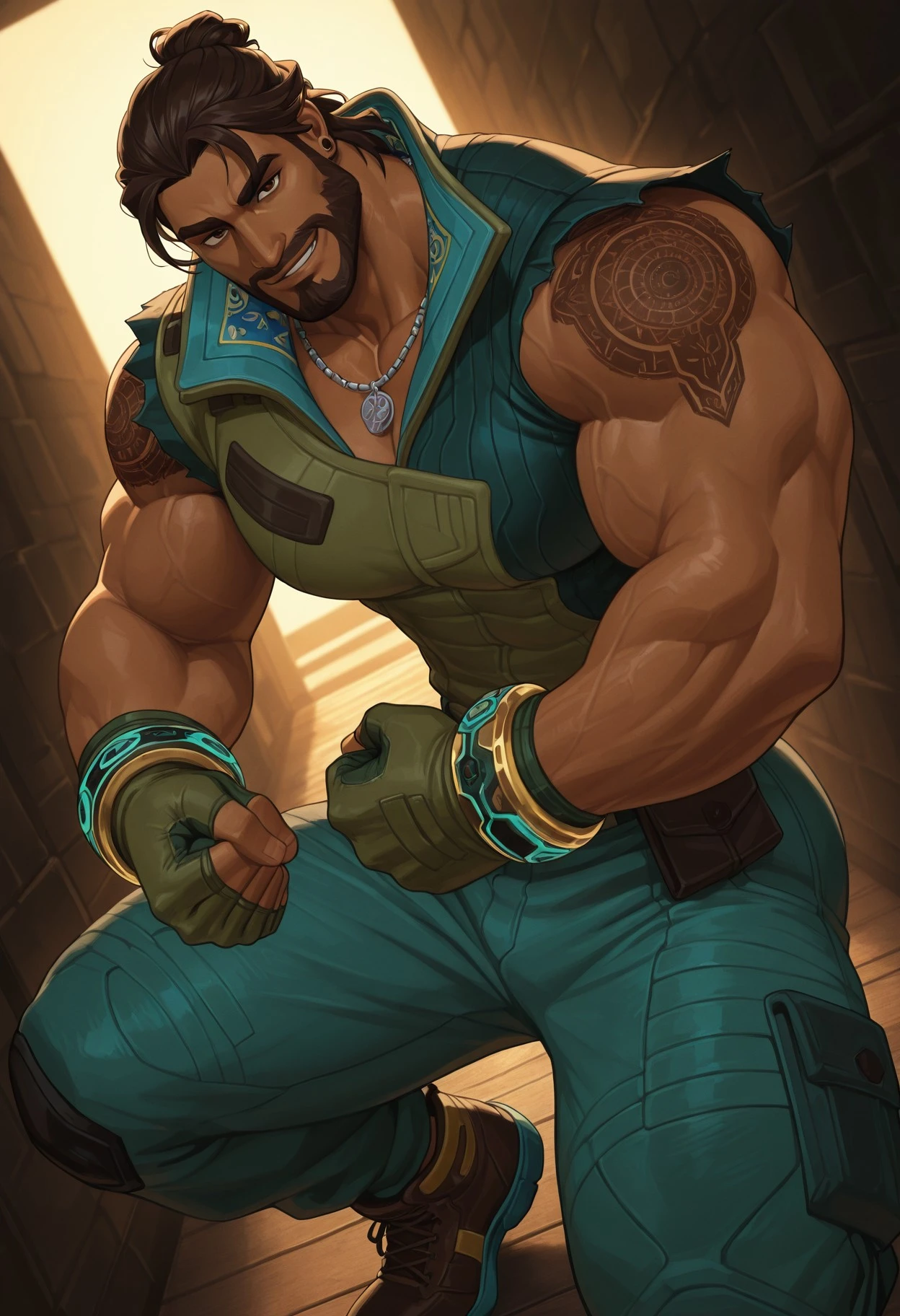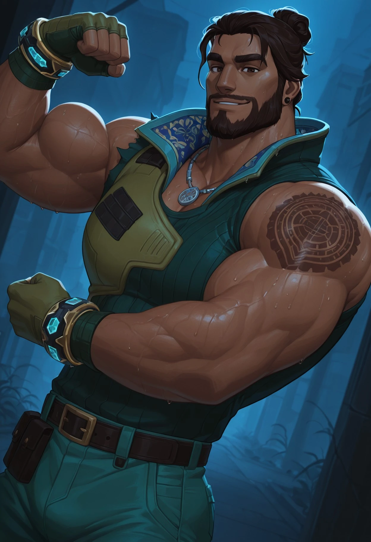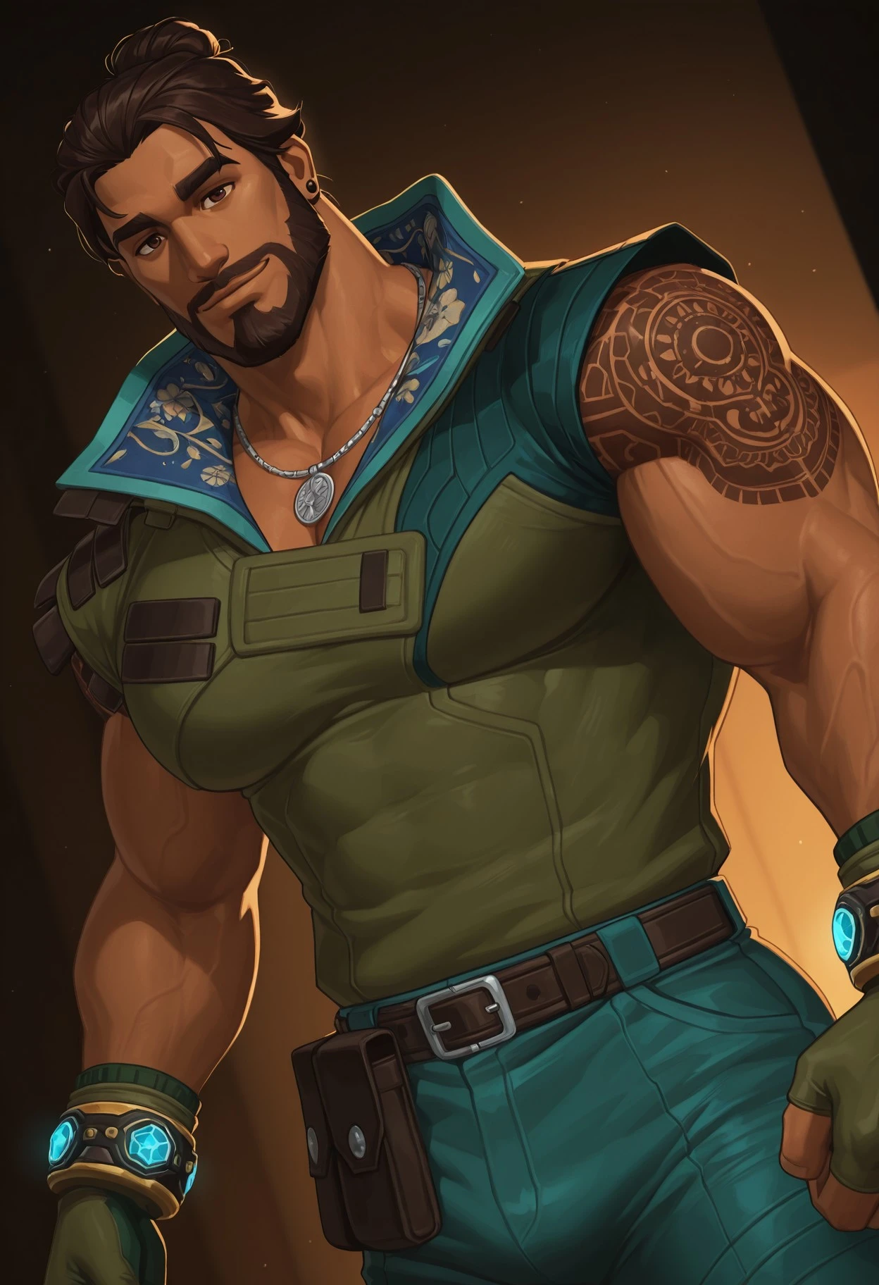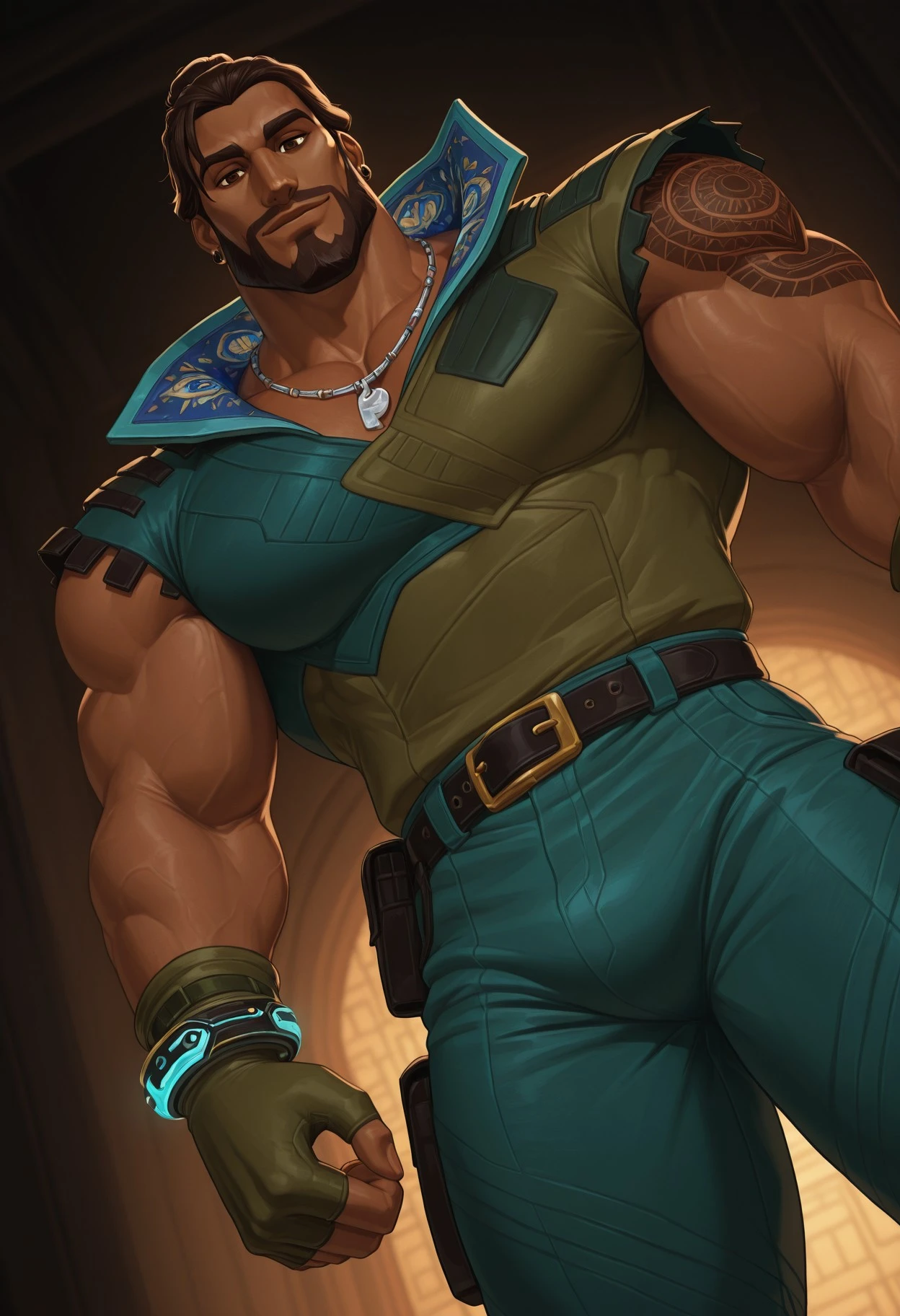 As usual, this is still AI, so very specific details (like belts and his tattoos) aren't extremely accurate. But it's close enough :^).