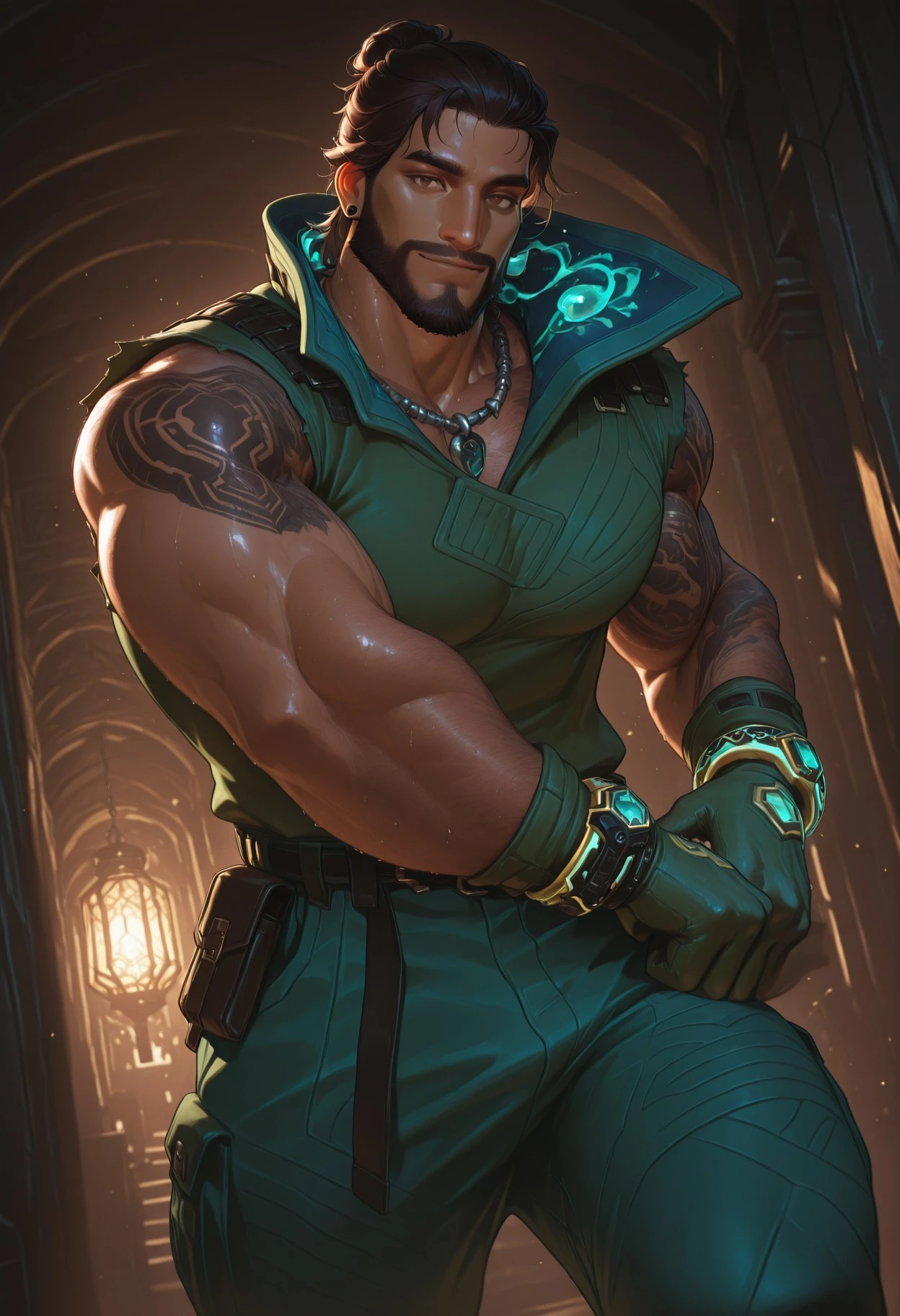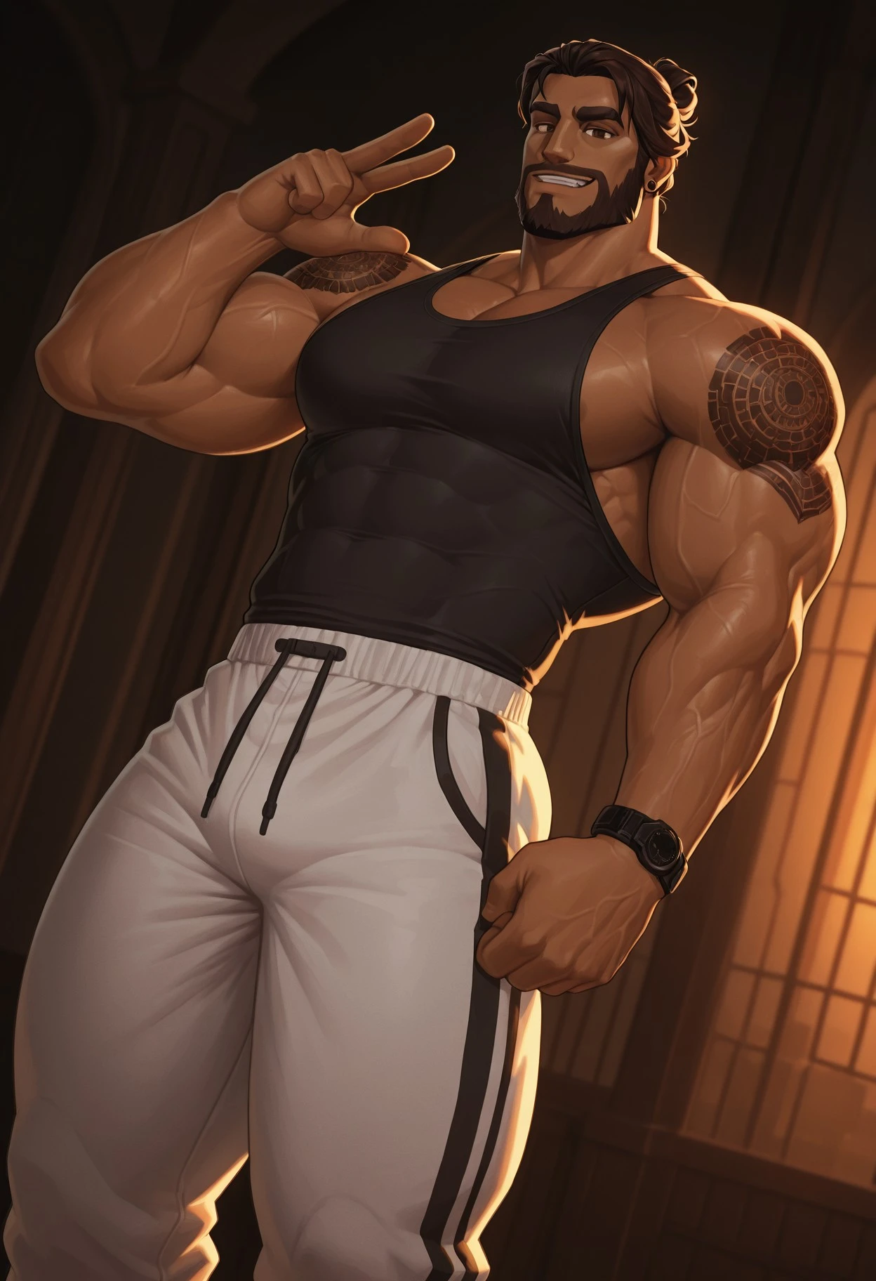 Main keywords: H4rb0r, brown hair, man bun, beard, brown eyes, shoulder tattoos, brown earrings,